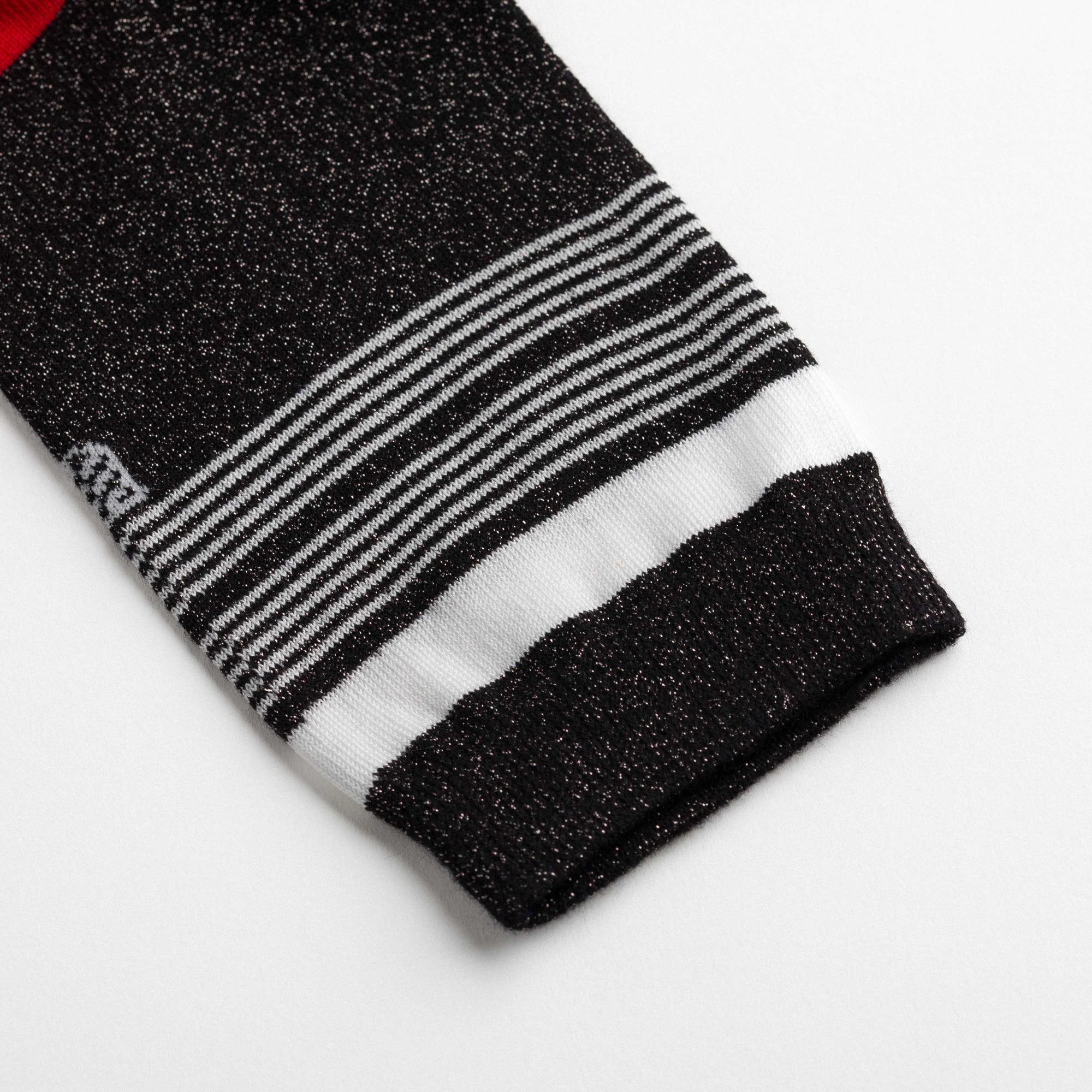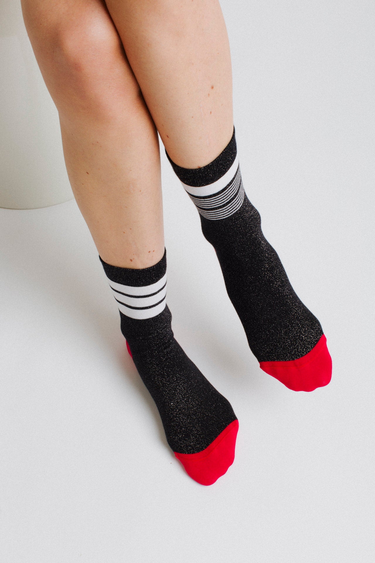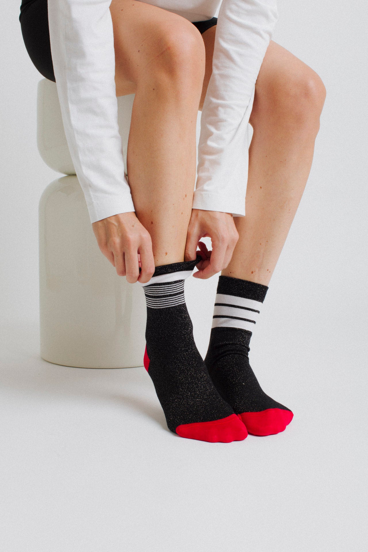 Ankle sock with black base, white stripes, and contrasting red heel and toe. Asymmetrical pattern with one leg featuring fine stripes and the other slightly wider lines. Made from long-fibre cotton blended with lurex. Reinforced toe and heel and a flat-knit toe seam for enhanced comfort.