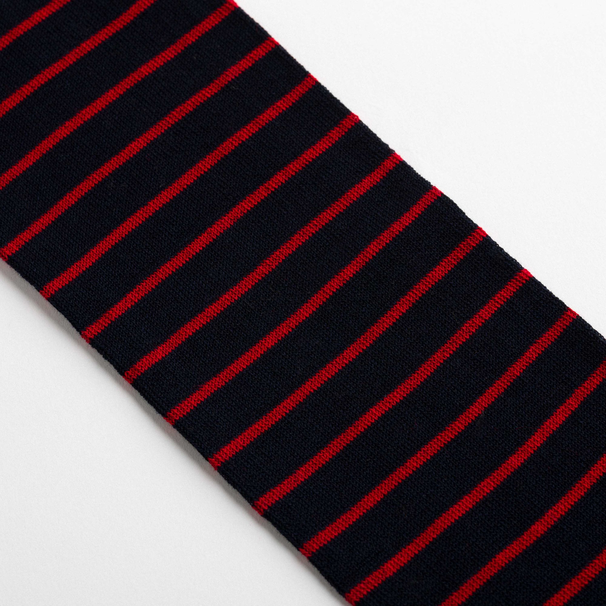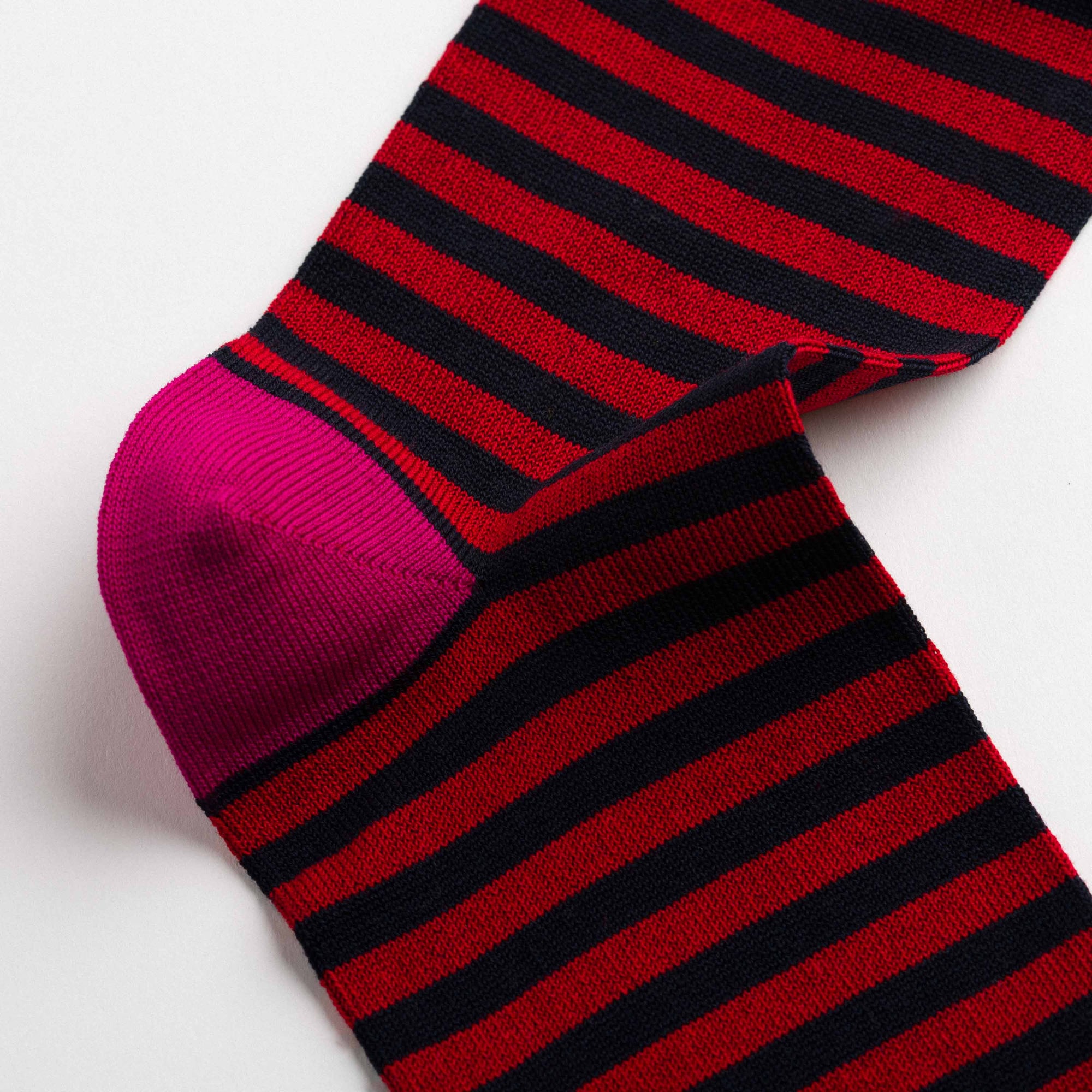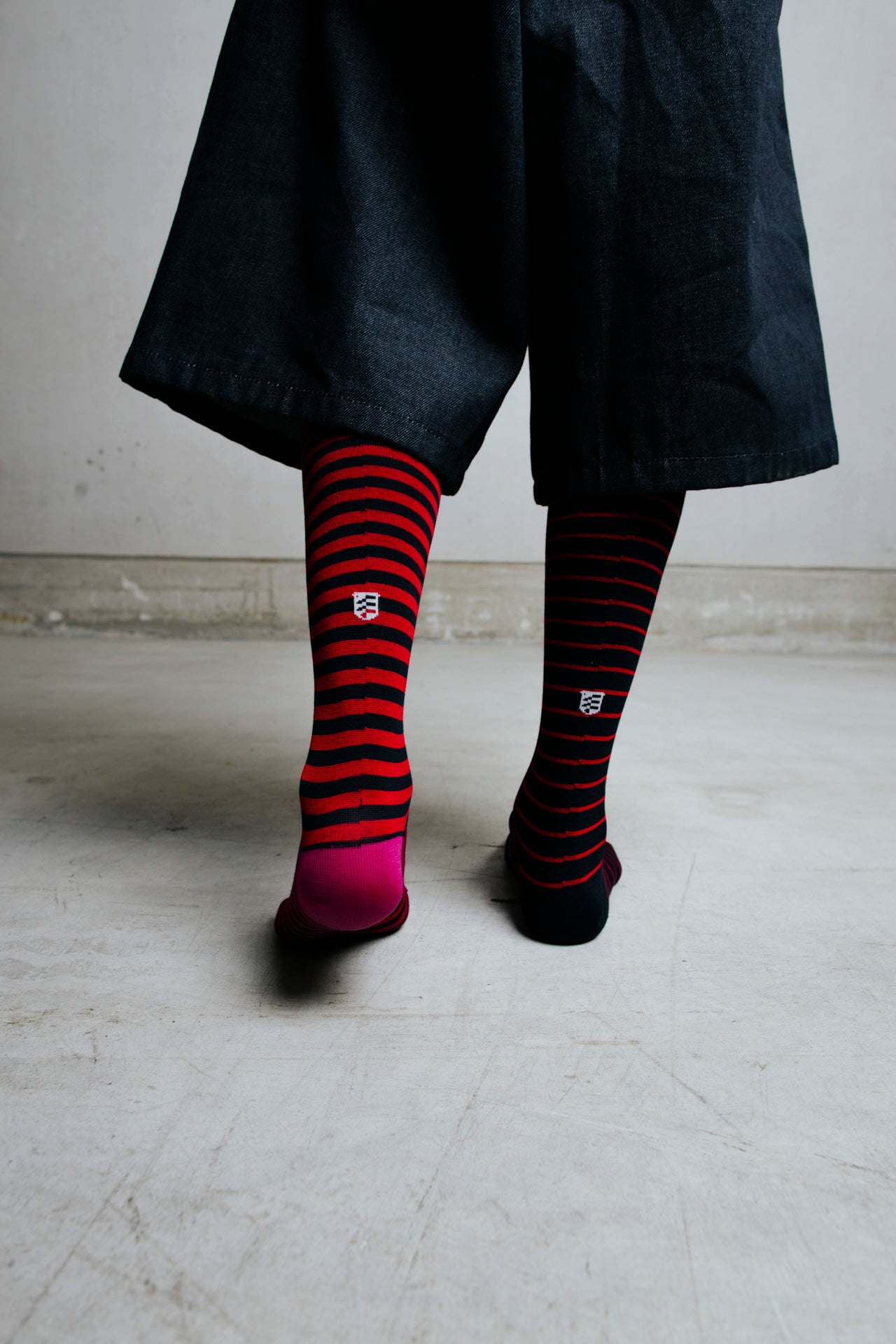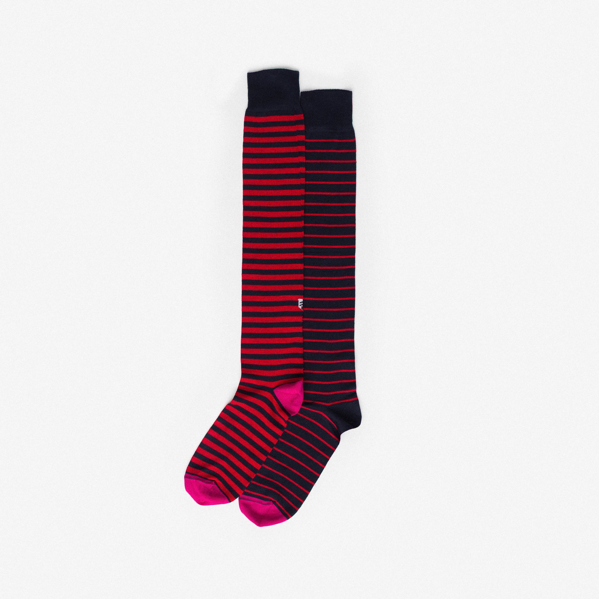 Knee-high socks in red and black with alternating stripes and reversed heel and toe colours. Asymmetrical pattern with varying stripe thickness between the two legs.