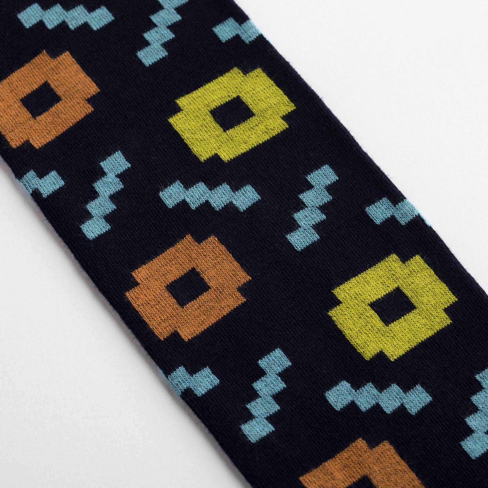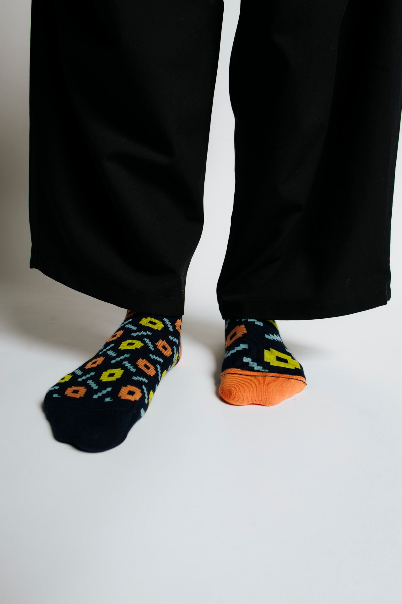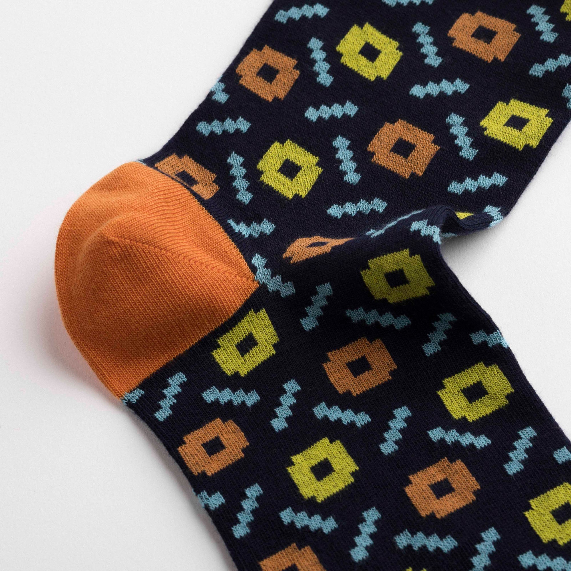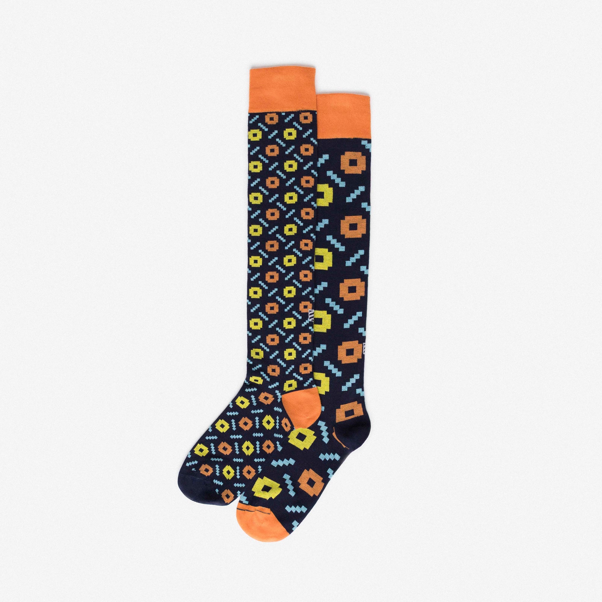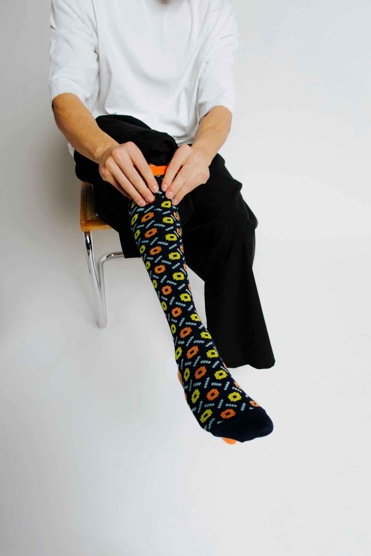 Knee-high socks with a navy blue base and geometric motifs in bright orange, yellow and turquoise. Asymmetrical pattern created through differing spacing of the motifs between the two legs. Made from 90% long-fibre cotton. Reinforced toe and heel, flat-knit toe seam and wide toe and heel sections for enhanced comfort.