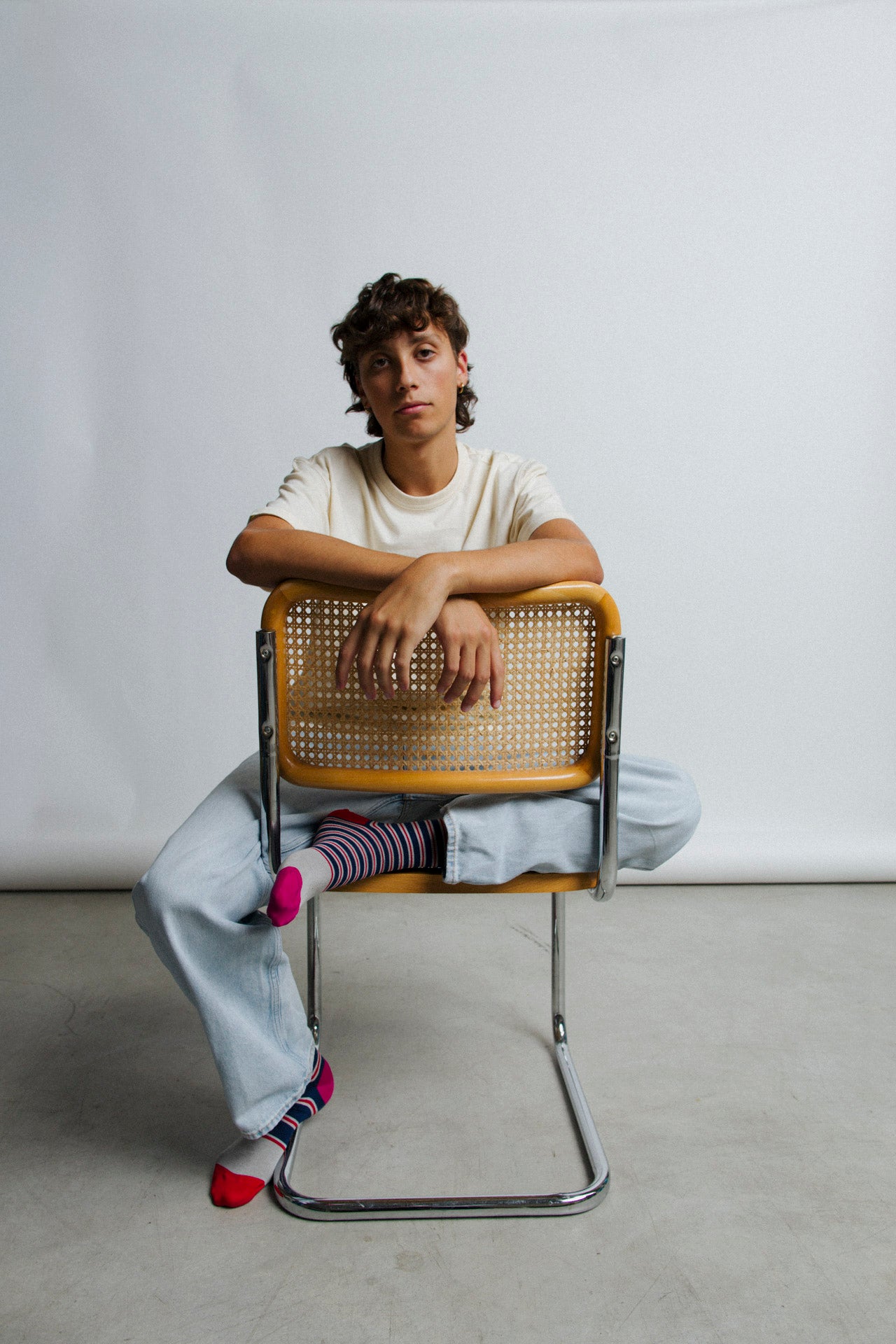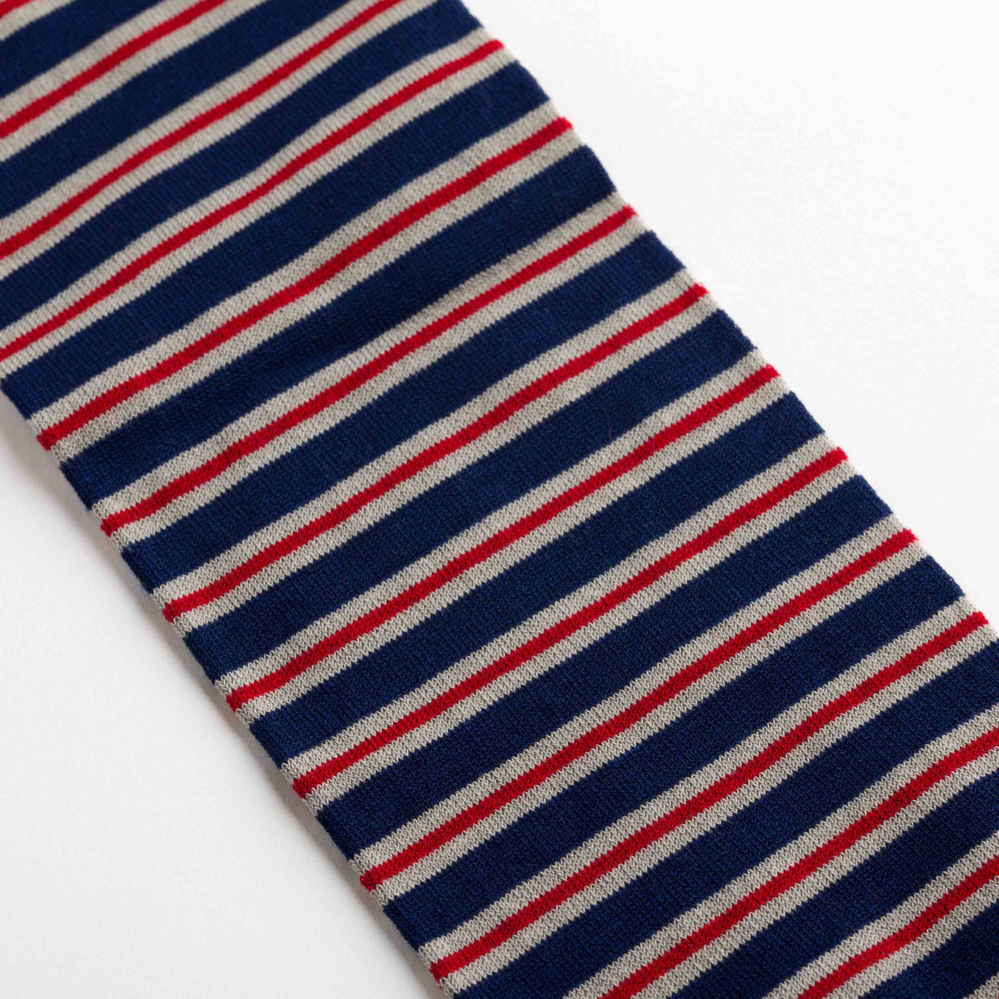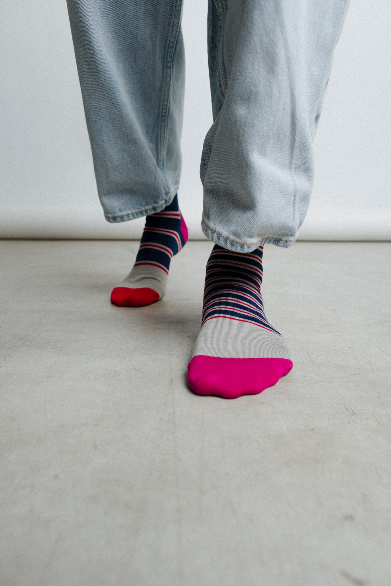 Knee-high socks in red, grey and navy blue with alternating stripes and reversed heel and toe colours. Asymmetrical pattern with variations in stripe width between the two legs. Made from long-fibre cotton. Reinforced toe and heel, flat-knit toe seam and wide toe and heel sections for enhanced comfort.