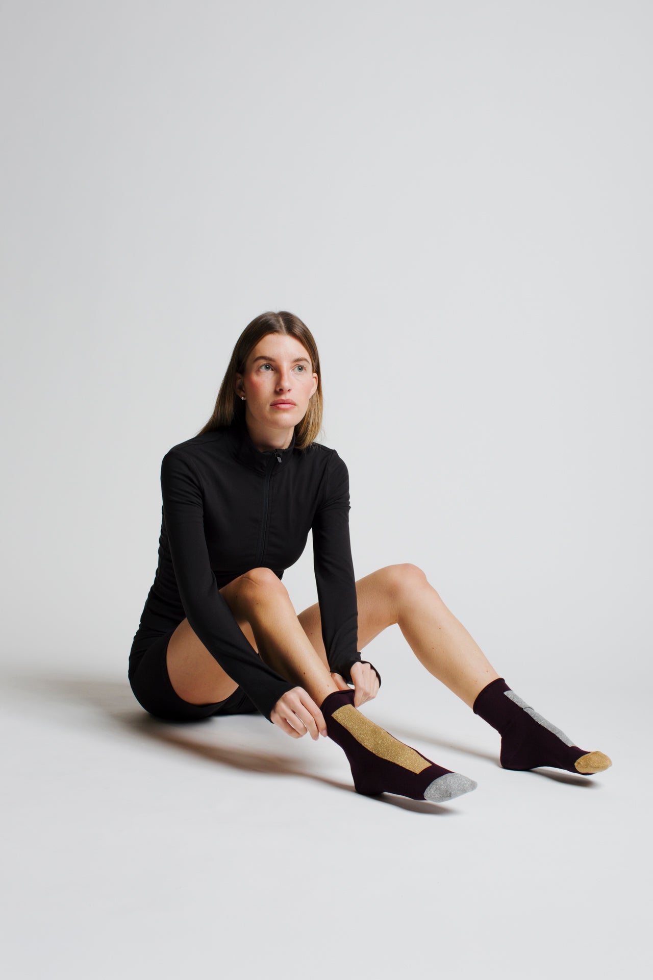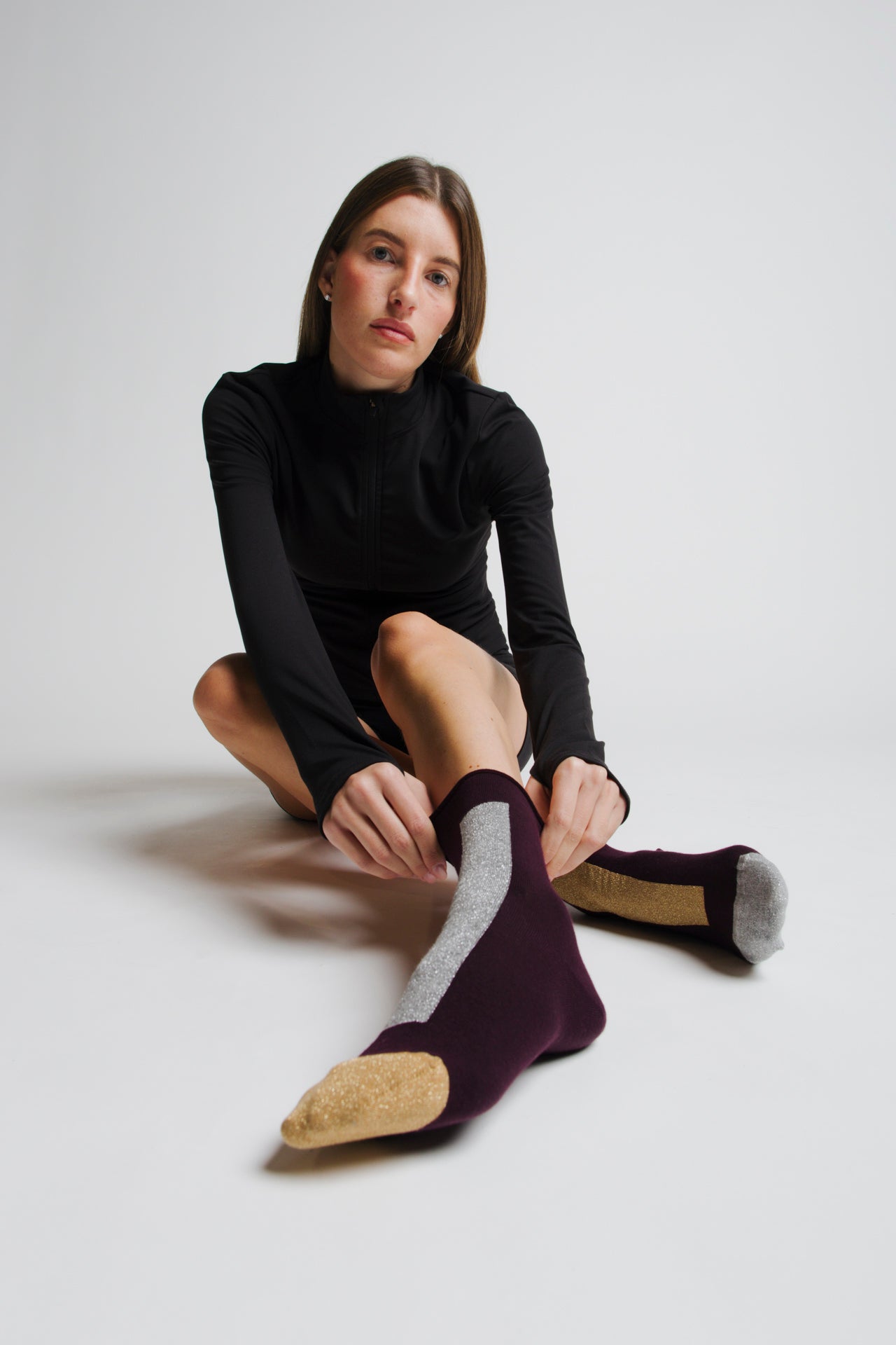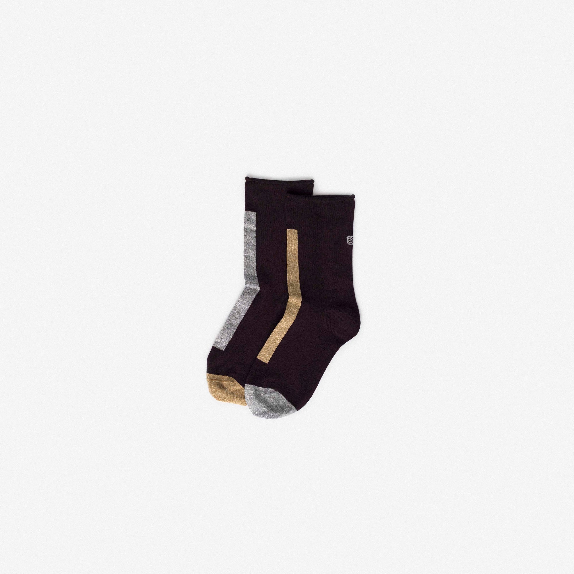 Ankle socks in deep purple with contrasting metallic Lurex accents. Asymmetrical pattern: one sock features a silver side stripe and toe, the other a gold stripe and heel.