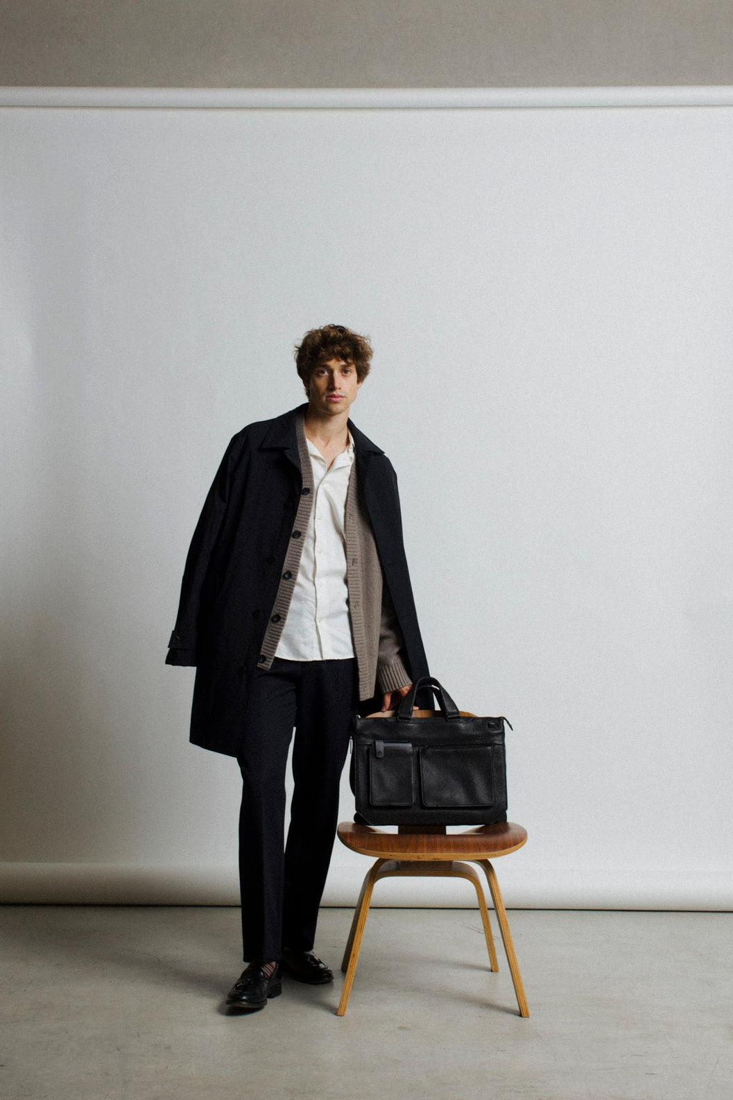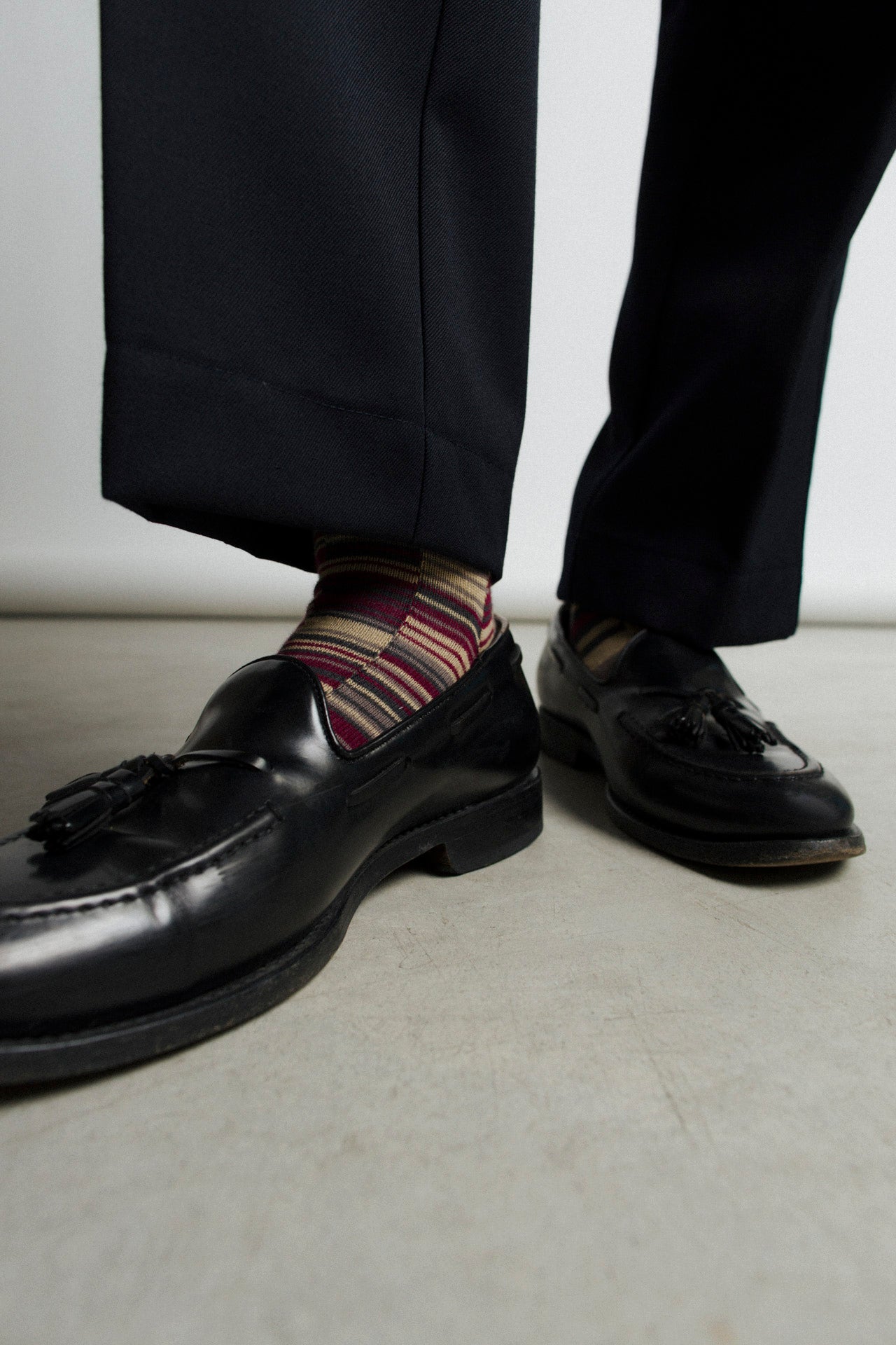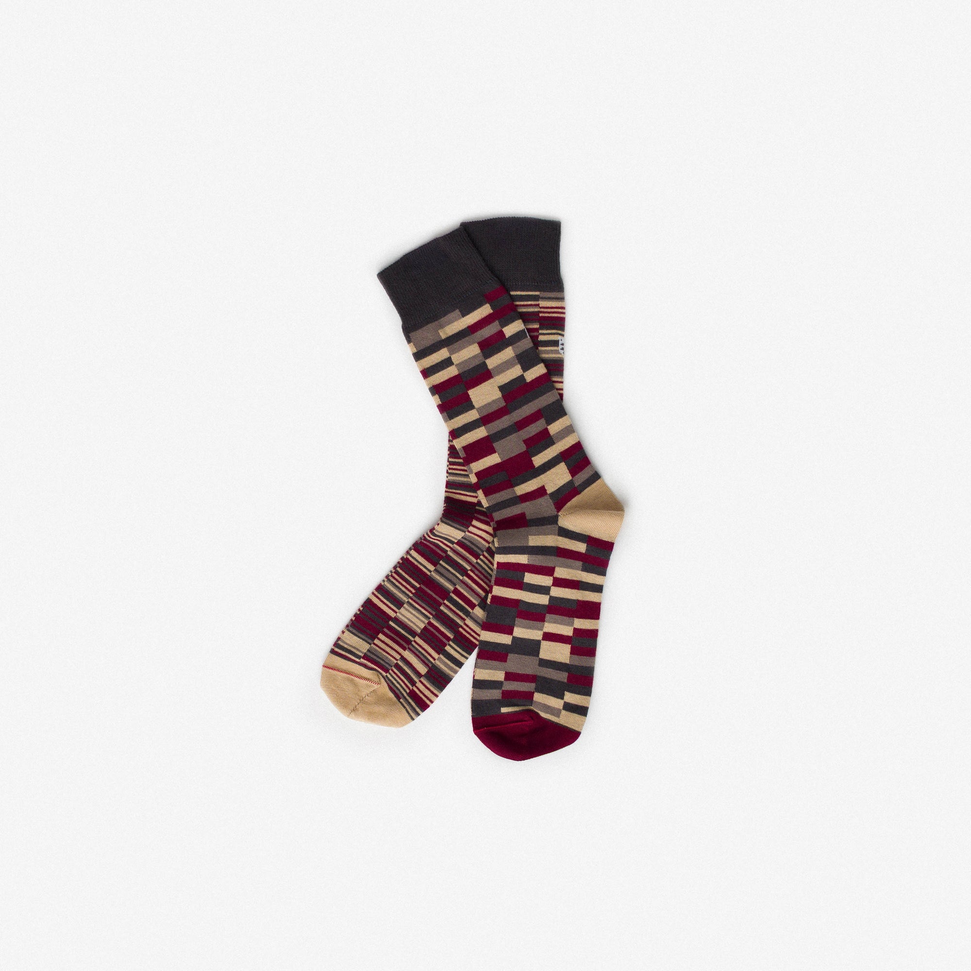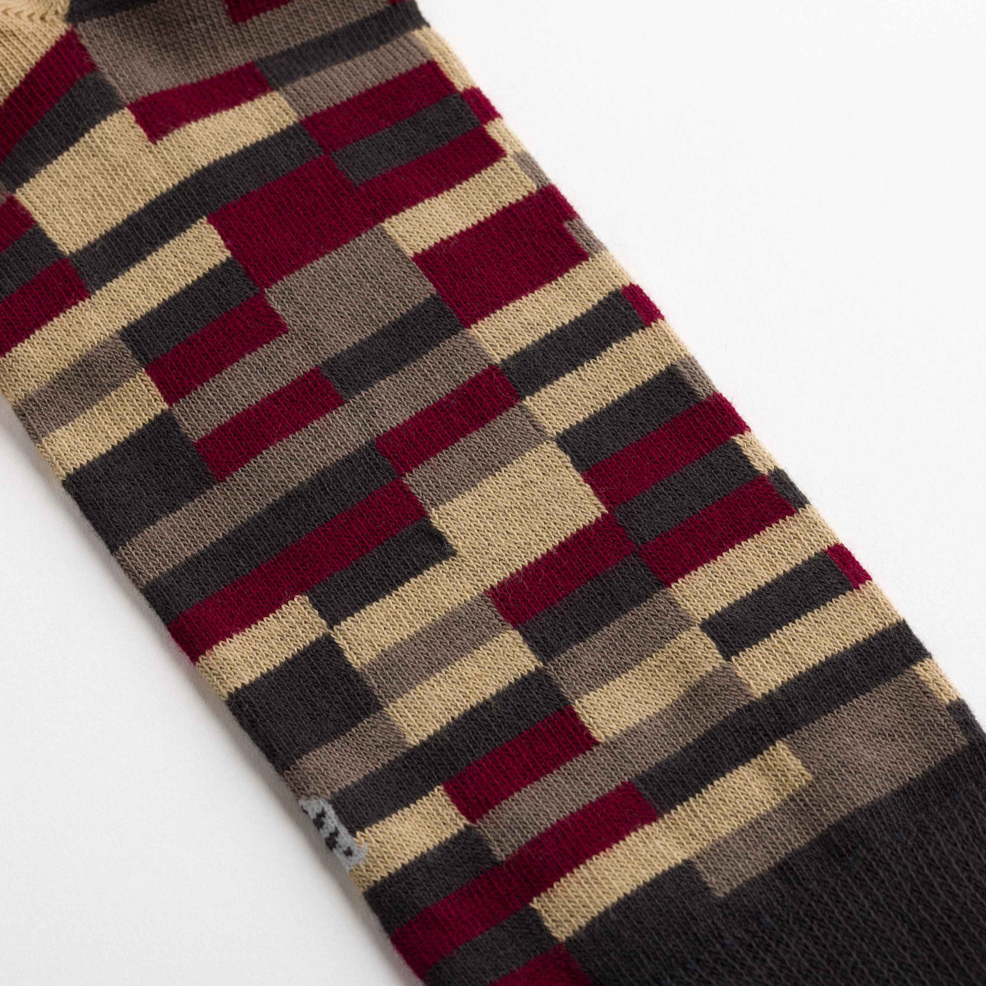 Mid-calf socks in tortora, grey and burgundy with brick-inspired motifs. Asymmetrical pattern with one leg featuring a larger motif and the other a smaller one.