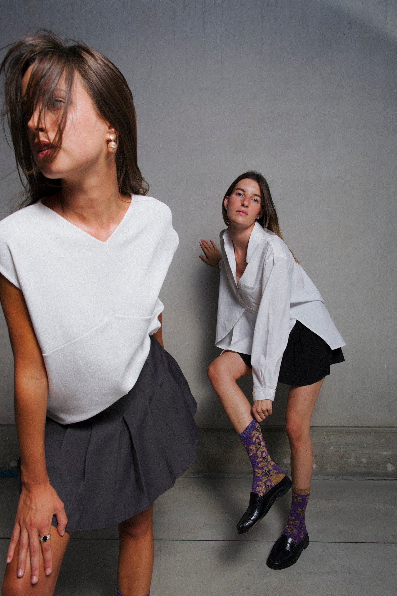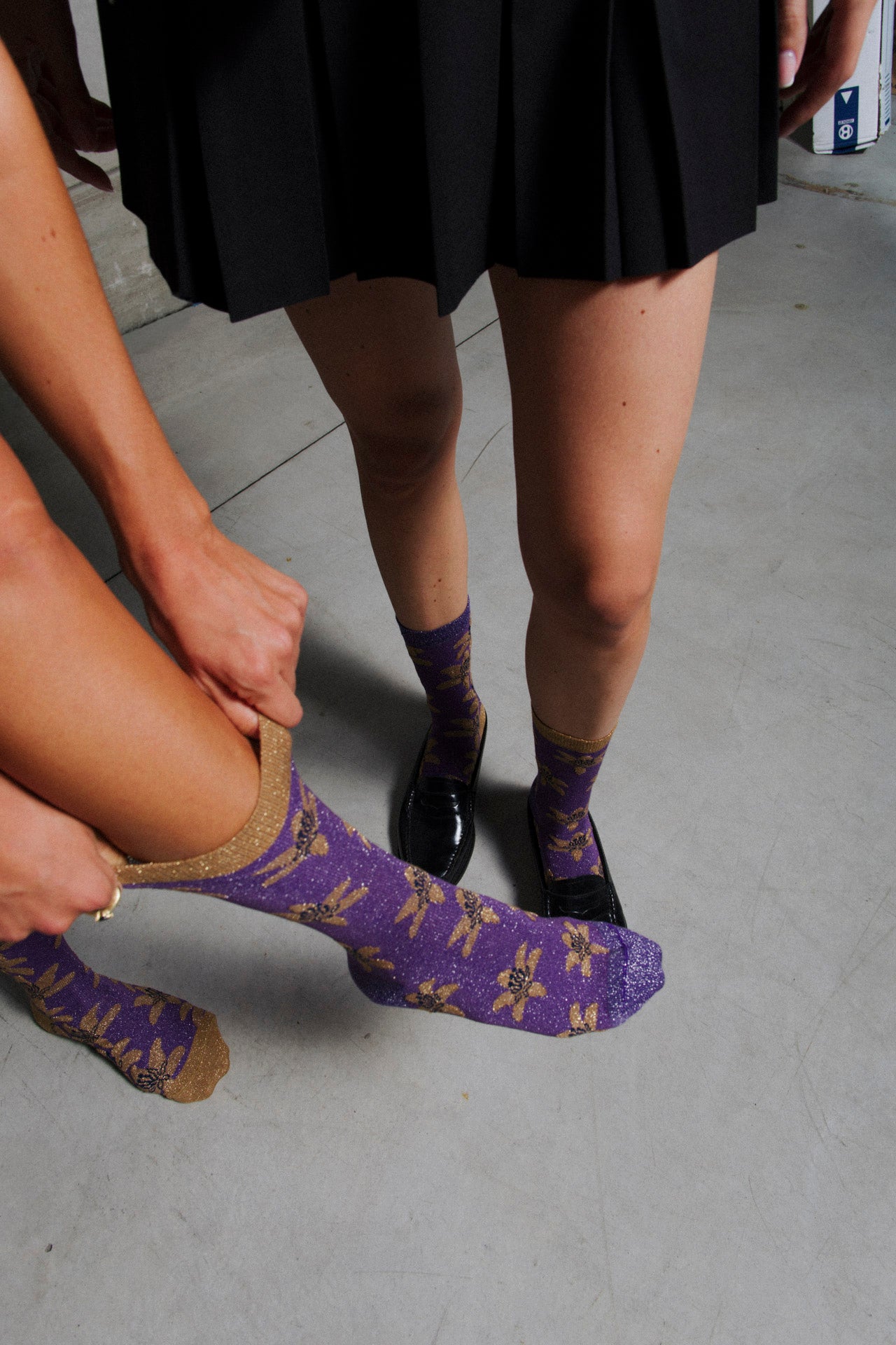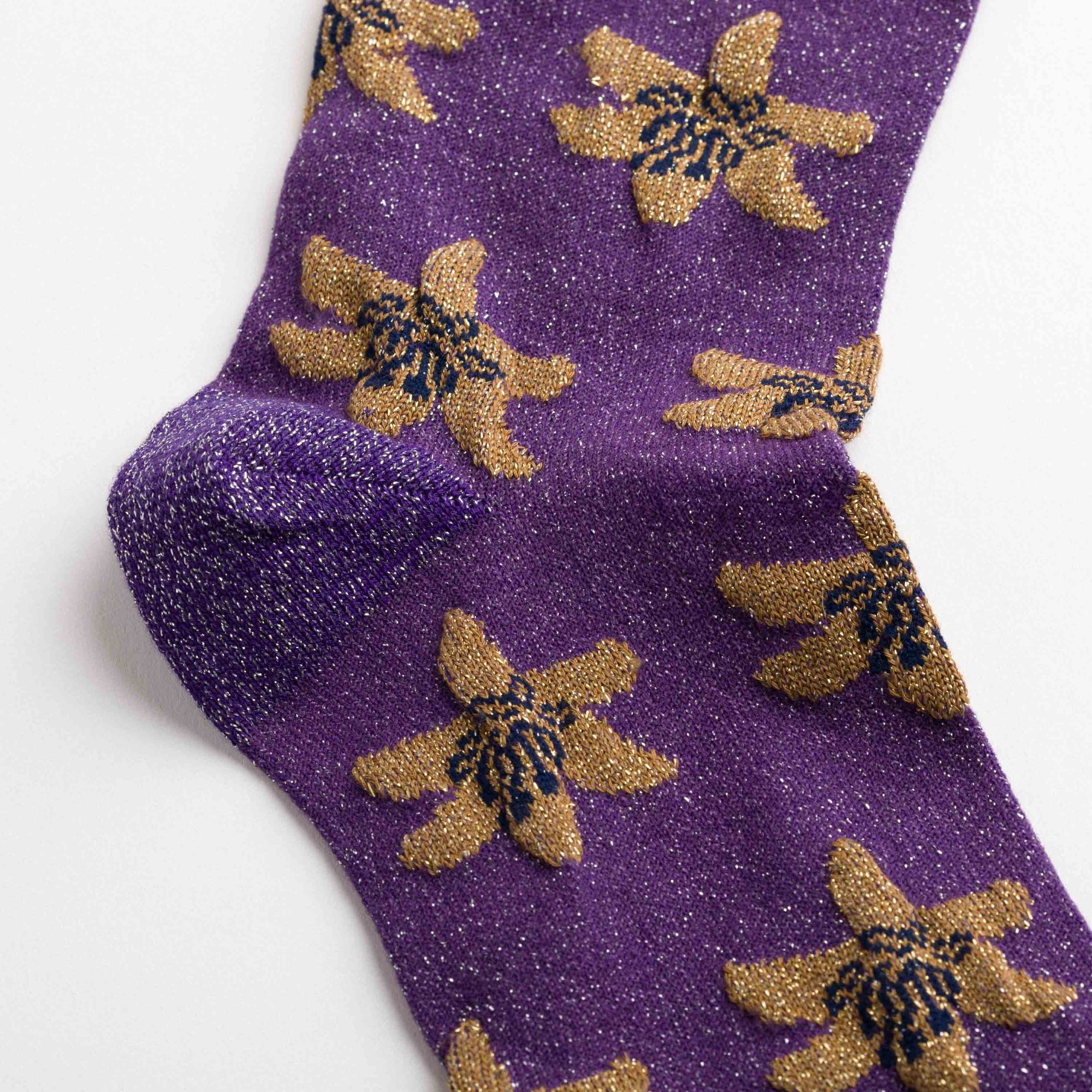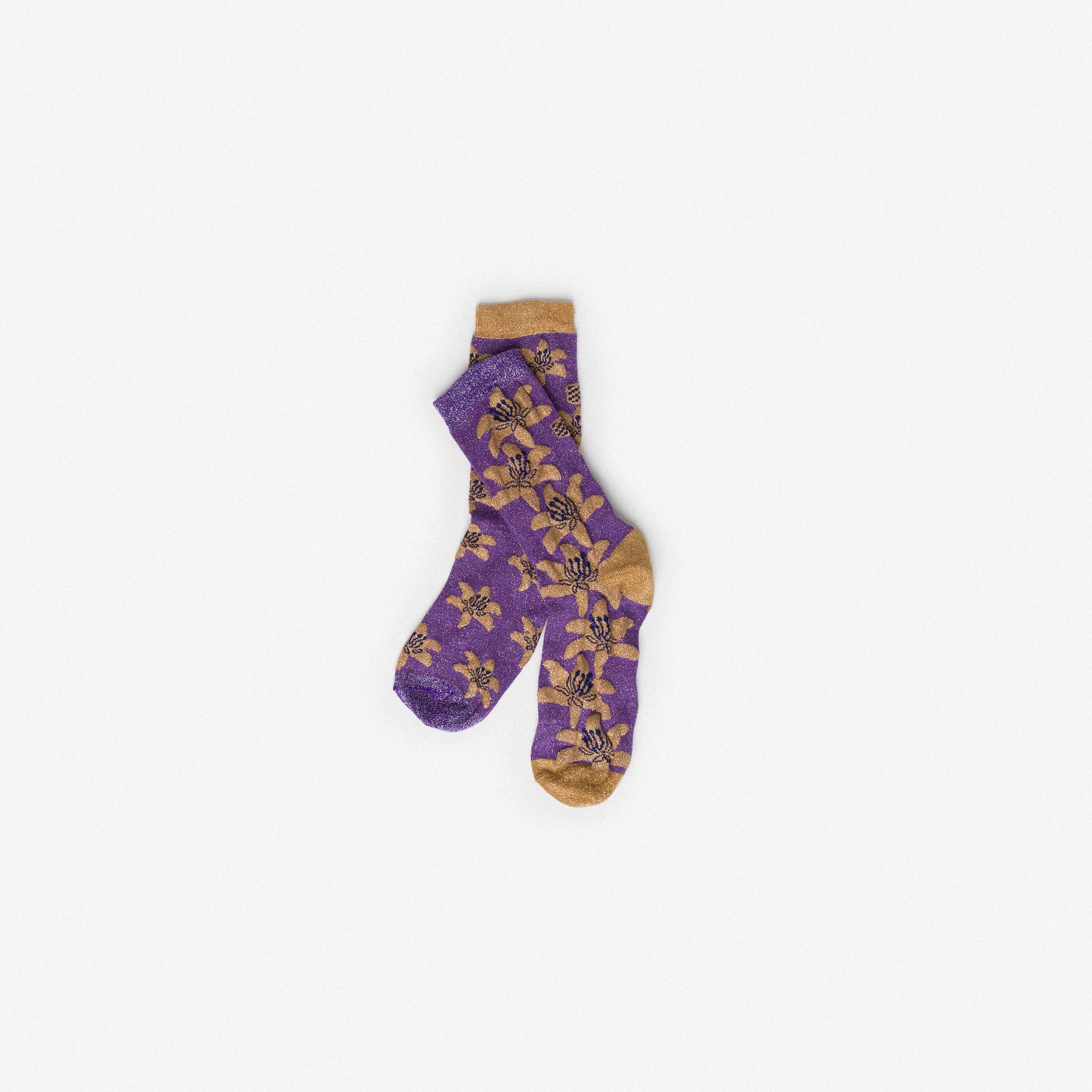 Ankle socks in cotton and lurex with purple and gold embroidered floral motifs. Asymmetrical pattern with subtle variations in embroidery dimension between the two legs. Made from long-fibre cotton blended with lurex. Reinforced toe and heel and a flat-knit toe seam for enhanced comfort.