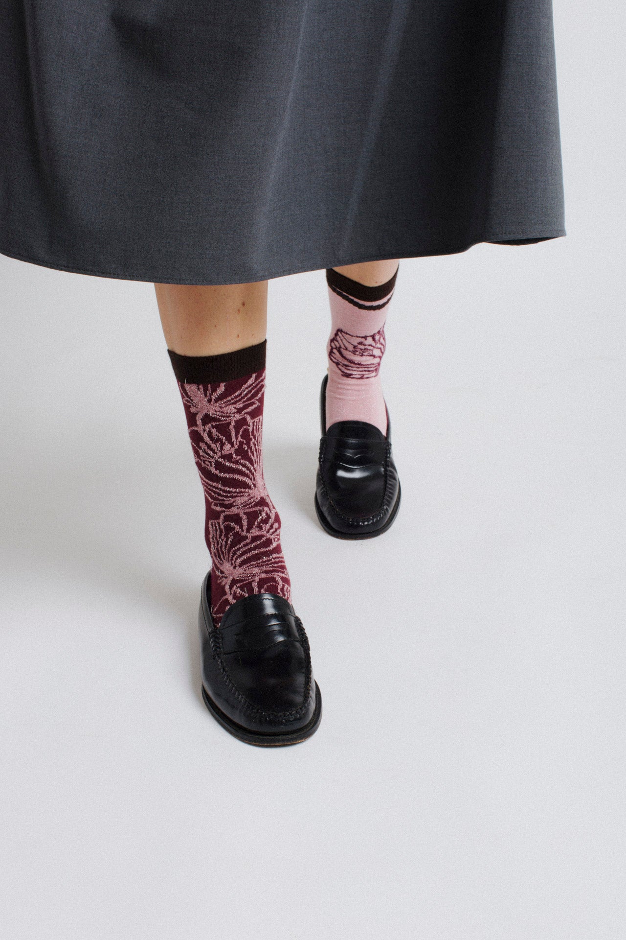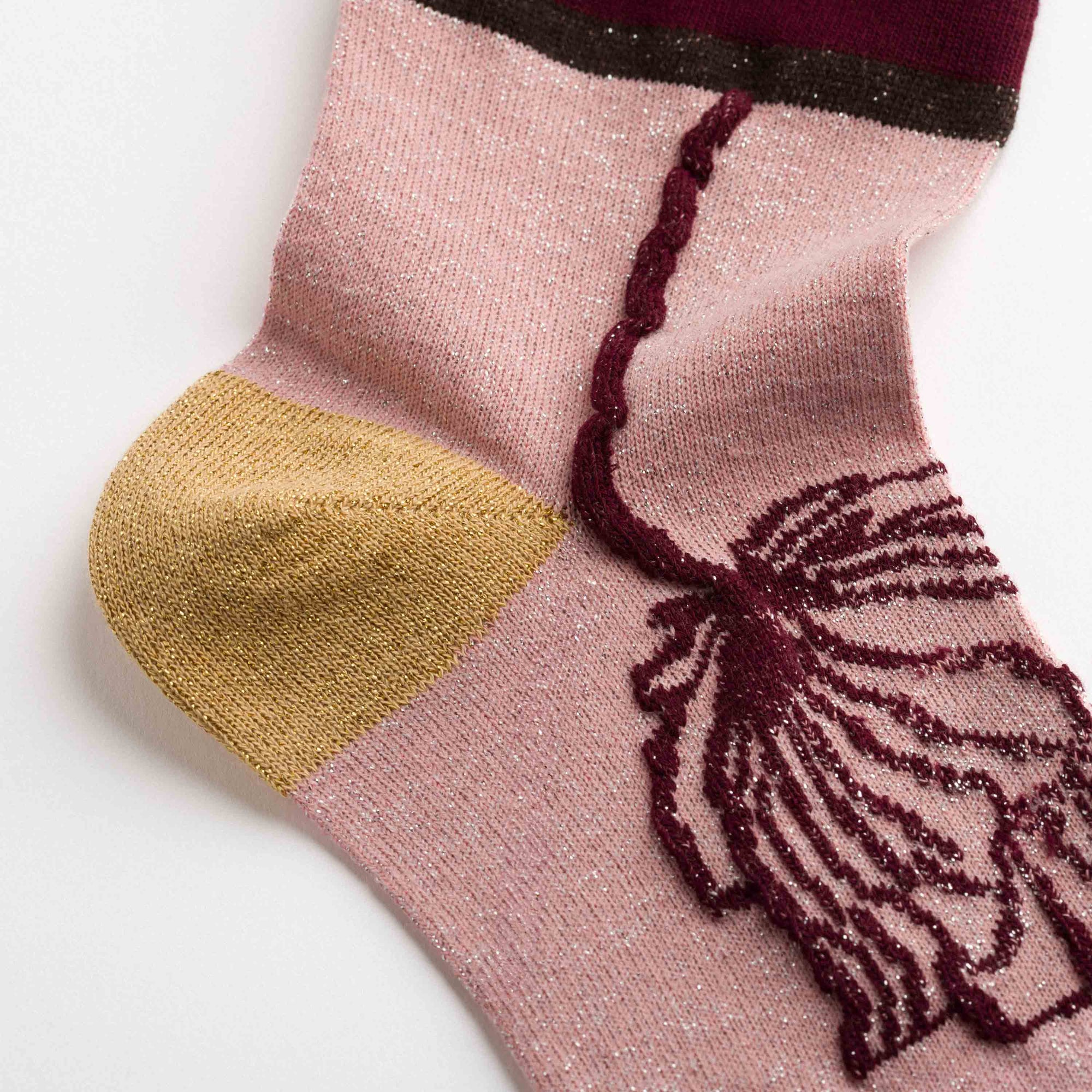 Ankle socks in cotton with pink, burgundy and gold embroidered floral motifs. Asymmetrical pattern with variations in the design and background colour, with differing cuff, heel and toe details. Made from long-fibre cotton. Reinforced toe and heel and a flat-knit toe seam for enhanced comfort.
