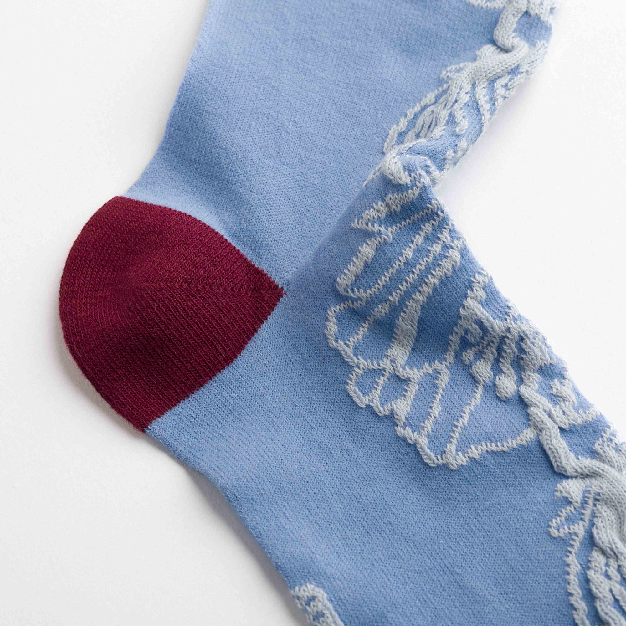 Knee-high socks in cotton with sky-blue, off-white and burgundy embroidered floral motifs. Asymmetrical pattern with variations in the design and background colour, featuring black cuffs and reversed toe colours: one burgundy, one off-white.