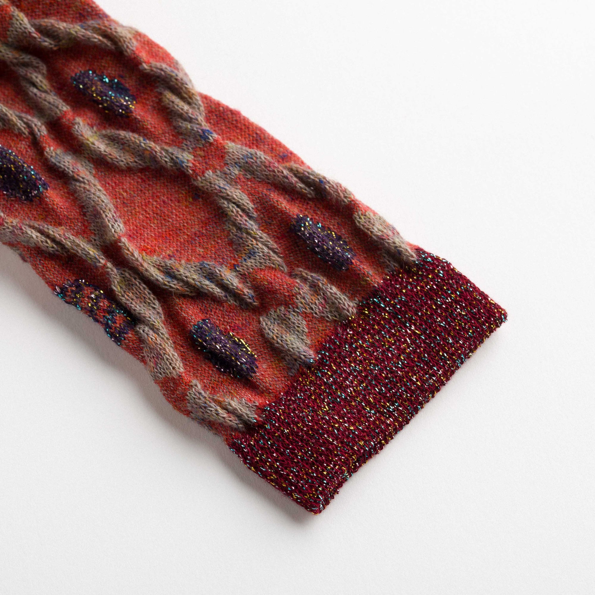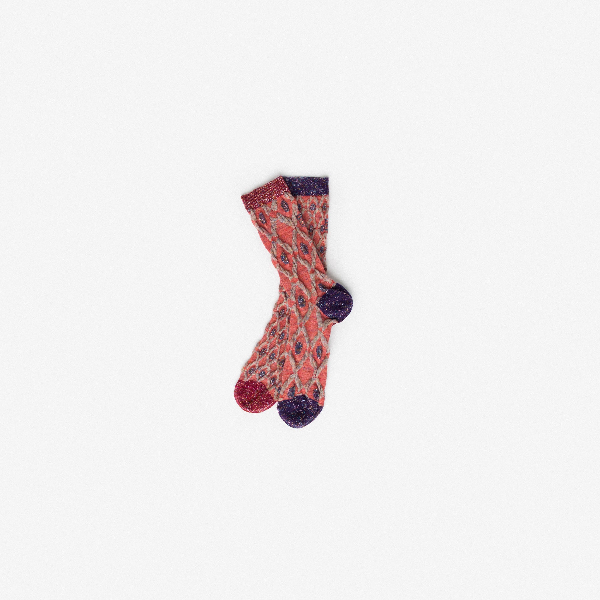 Ankle socks in cotton and lurex with a soft coral base and gold geometric diamond motifs. Asymmetrical pattern with variations in motif size between the two legs.