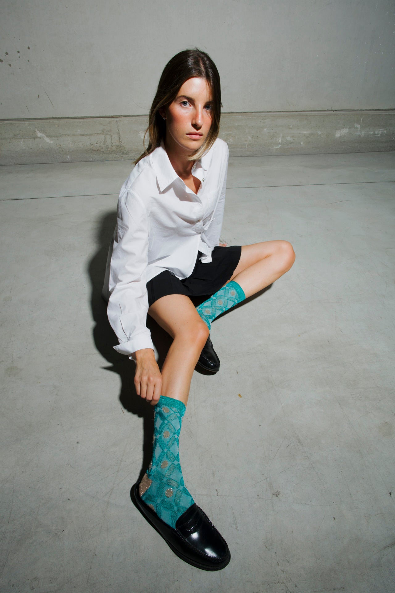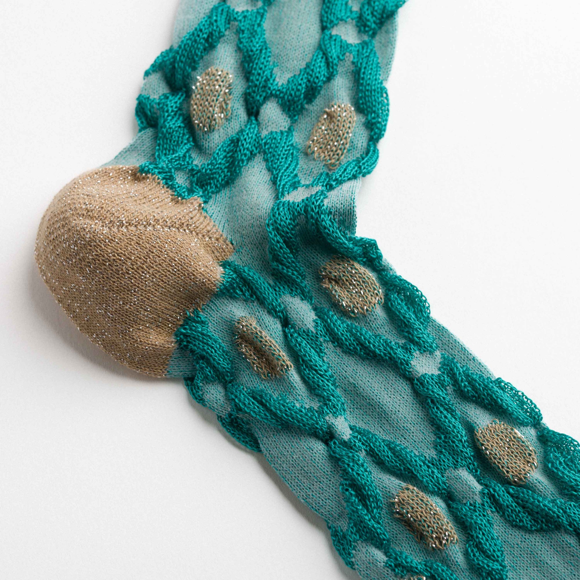 Ankle socks in cotton and lurex with an aqua green base and gold geometric diamond motifs. Asymmetrical pattern with variations in motif size between the two legs. Made from long-fibre cotton blended with lurex. Reinforced toe and heel and a flat-knit toe seam for enhanced comfort.