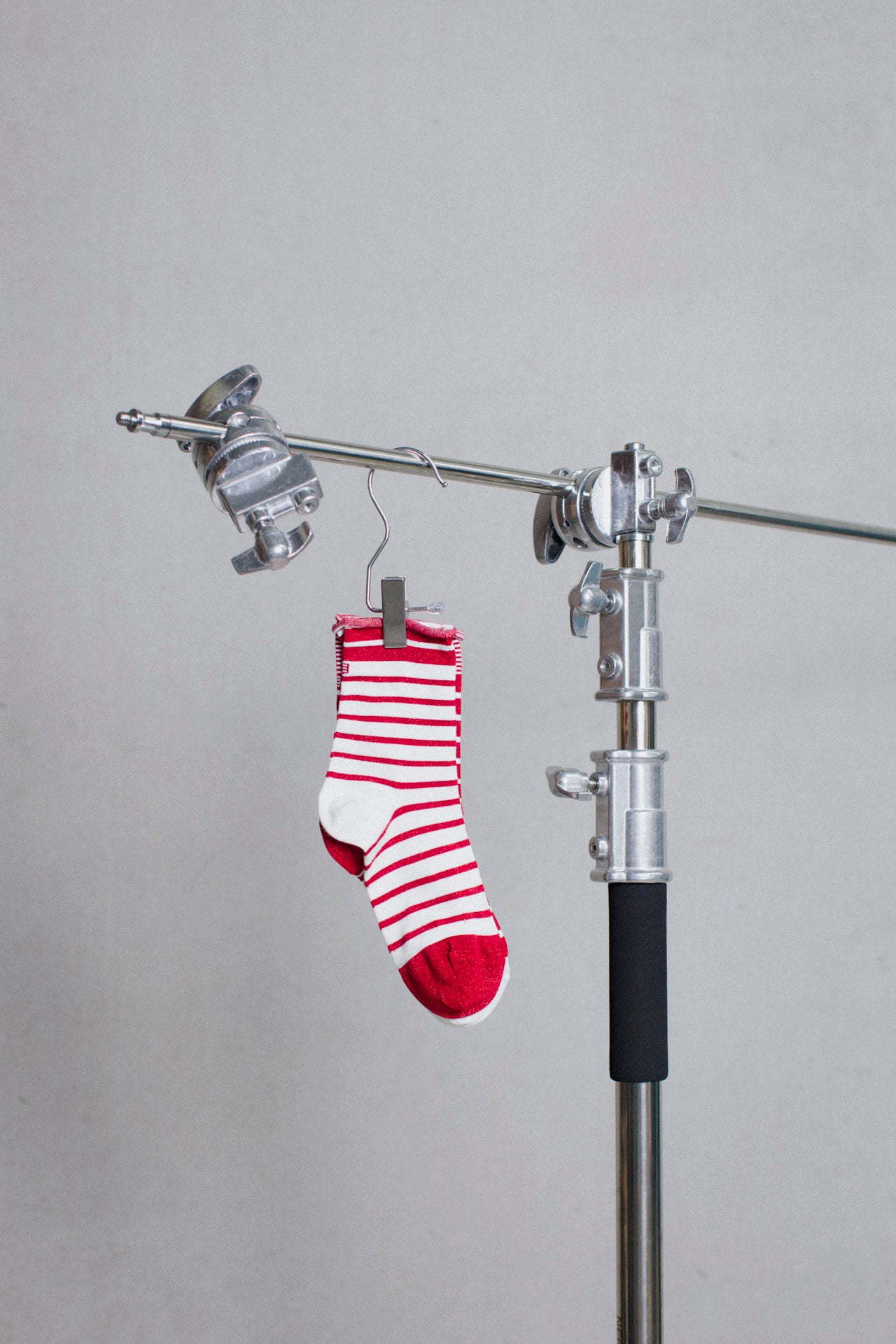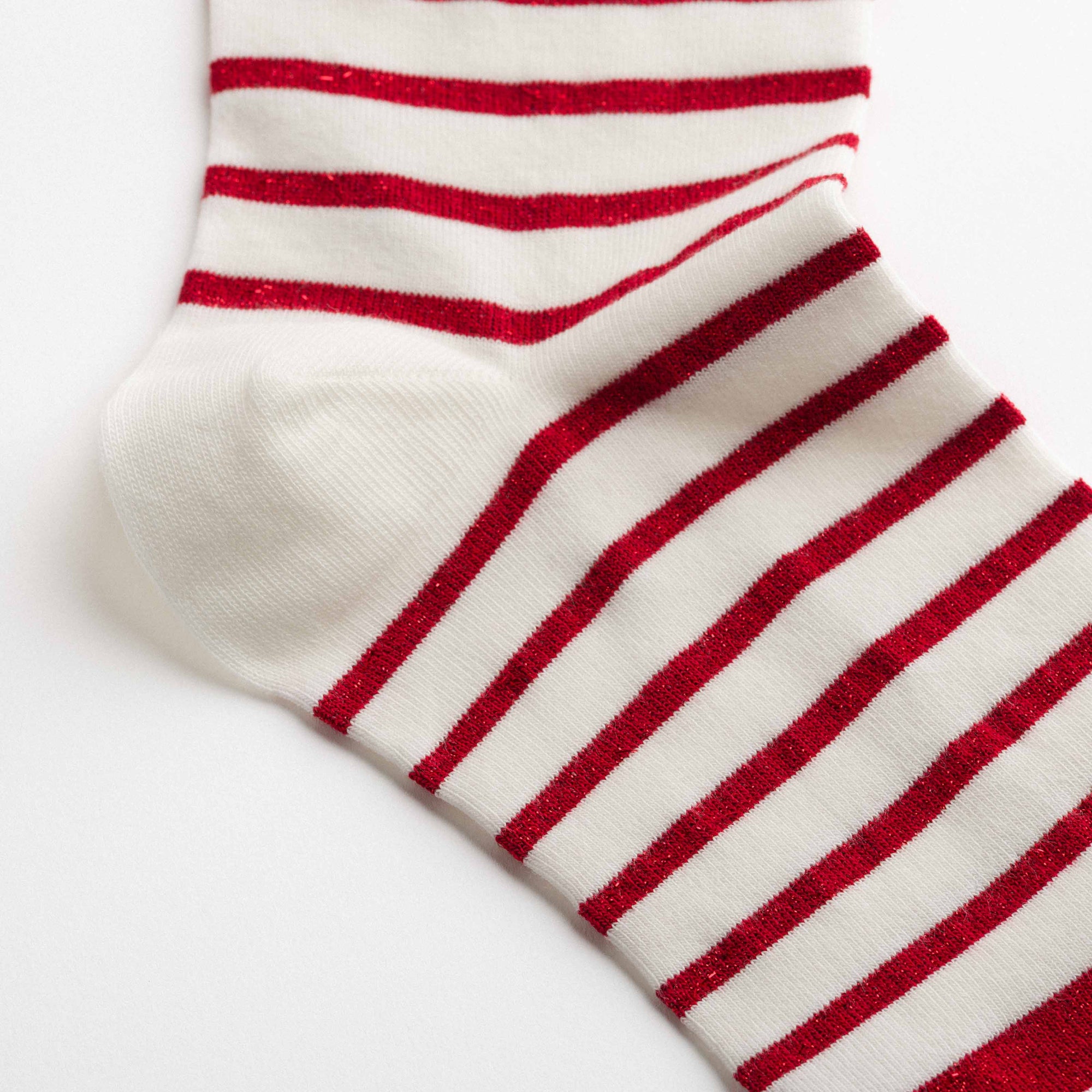 Ankle socks in cotton with bright red and white stripes featuring lurex yarn and a raw-edge finish. Asymmetrical pattern as defined by the striped construction.