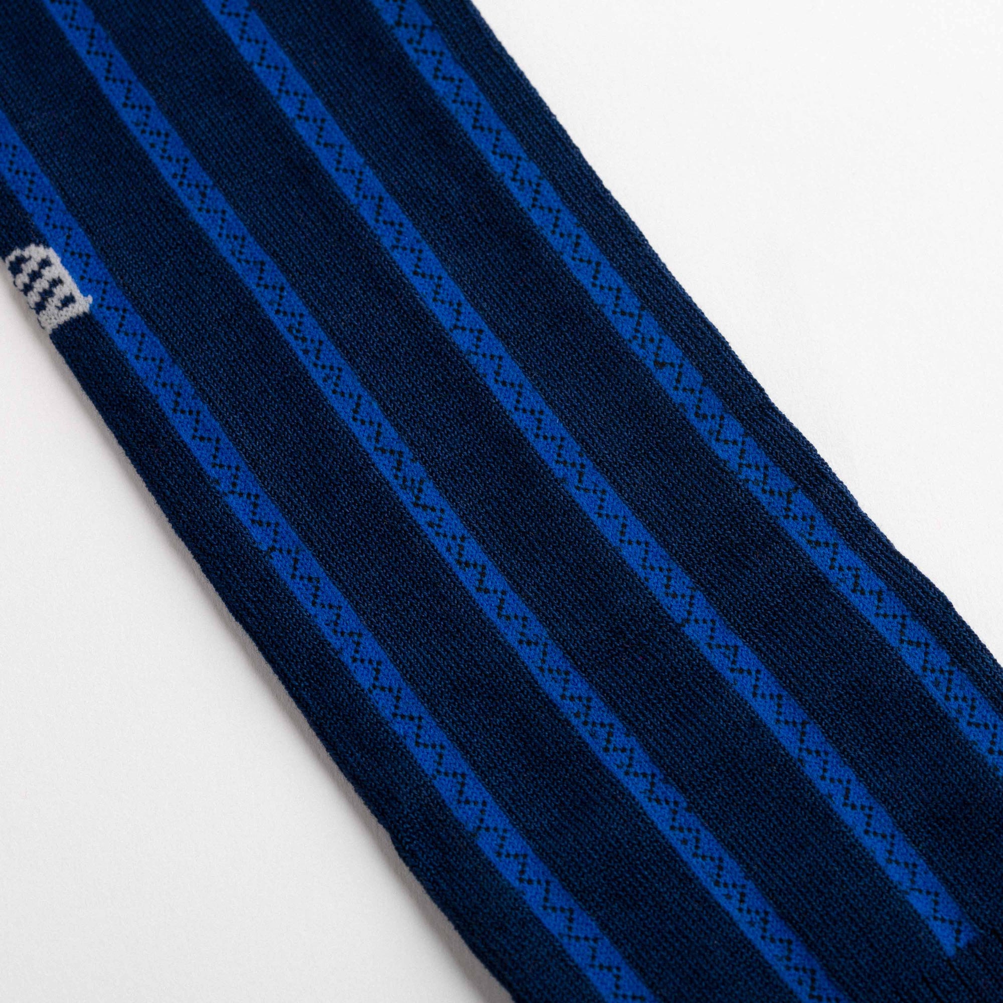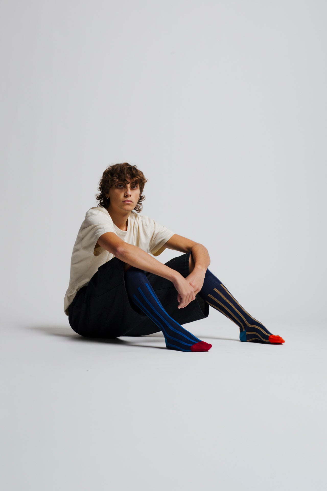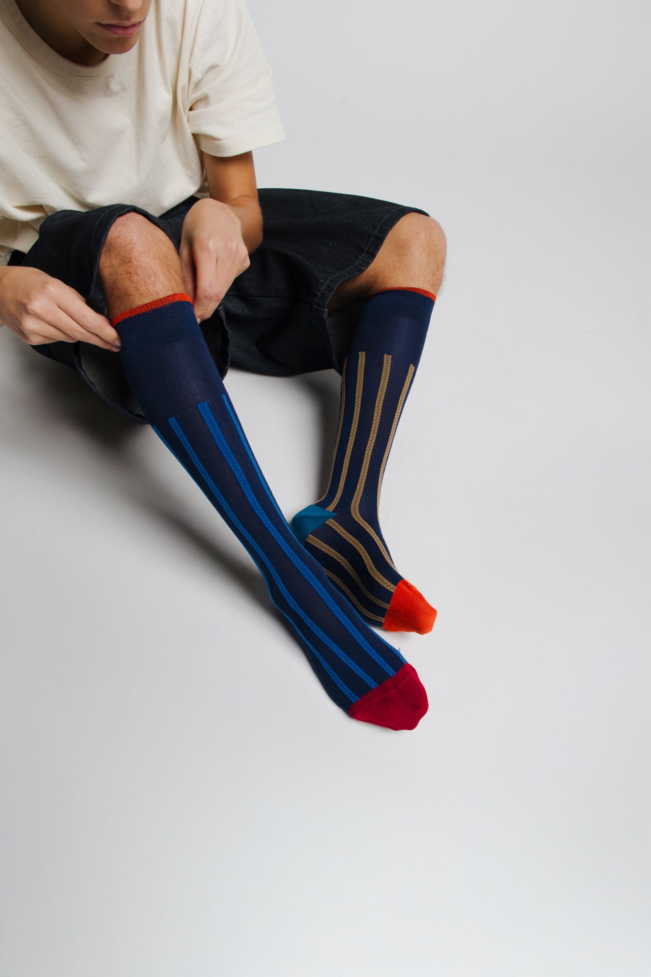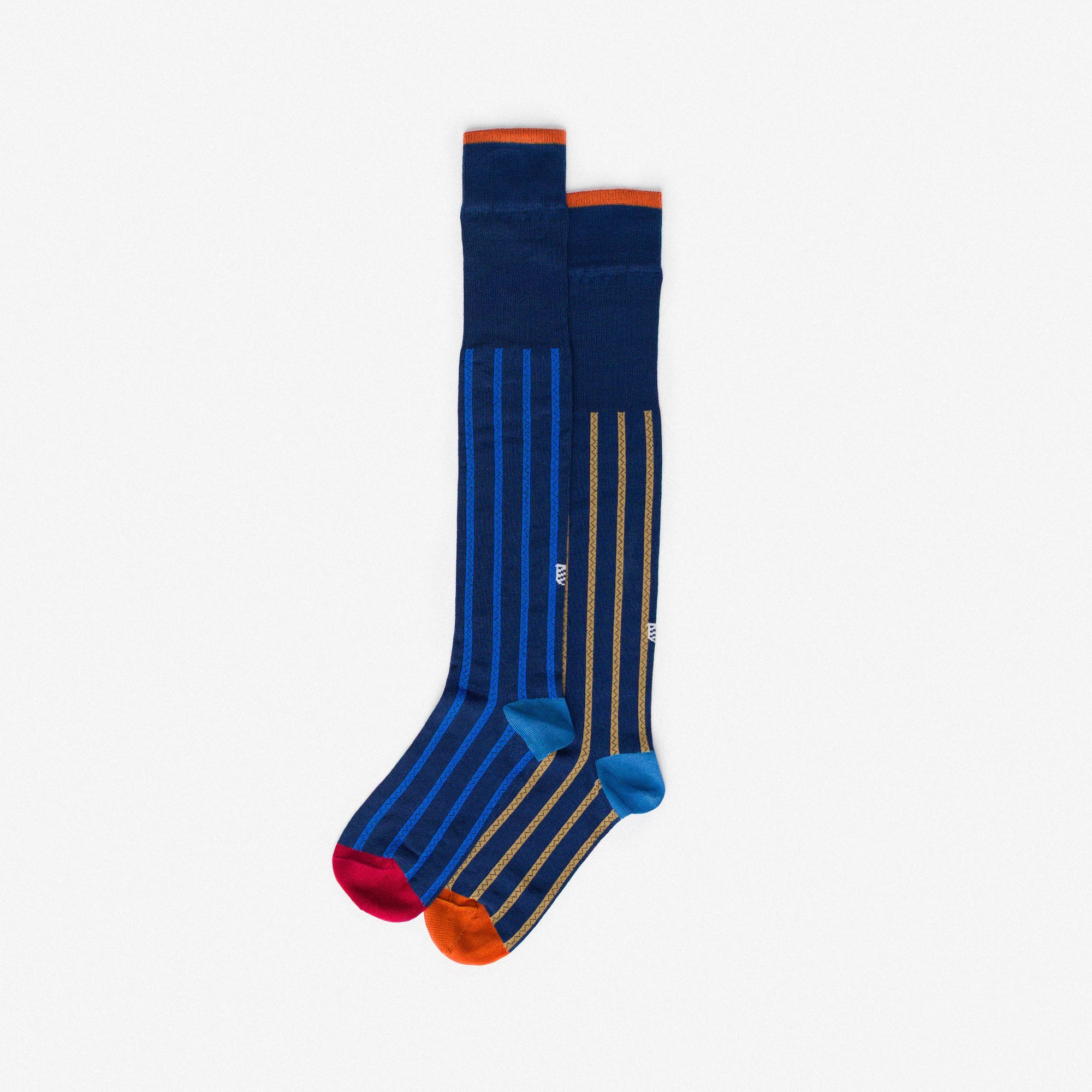 Knee-high socks in cotton with embroidered stripes in navy blue, electric blue, and yellow. Asymmetrical pattern with one sock featuring electric blue stripes and the other yellow stripes. Made from 90% long-fibre cotton. Reinforced toe and heel, flat-knit toe seam, and wide toe and heel sections for enhanced comfort.