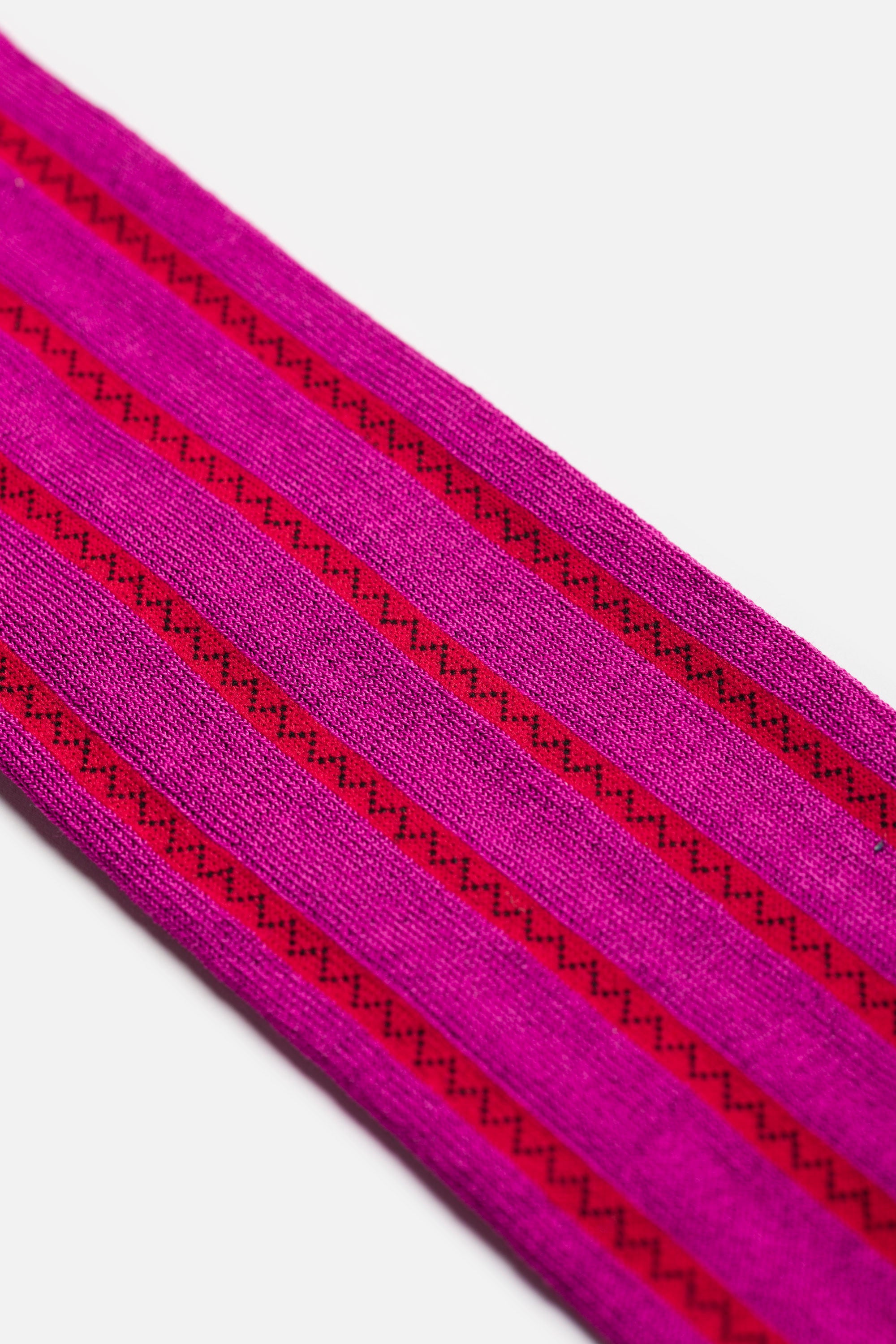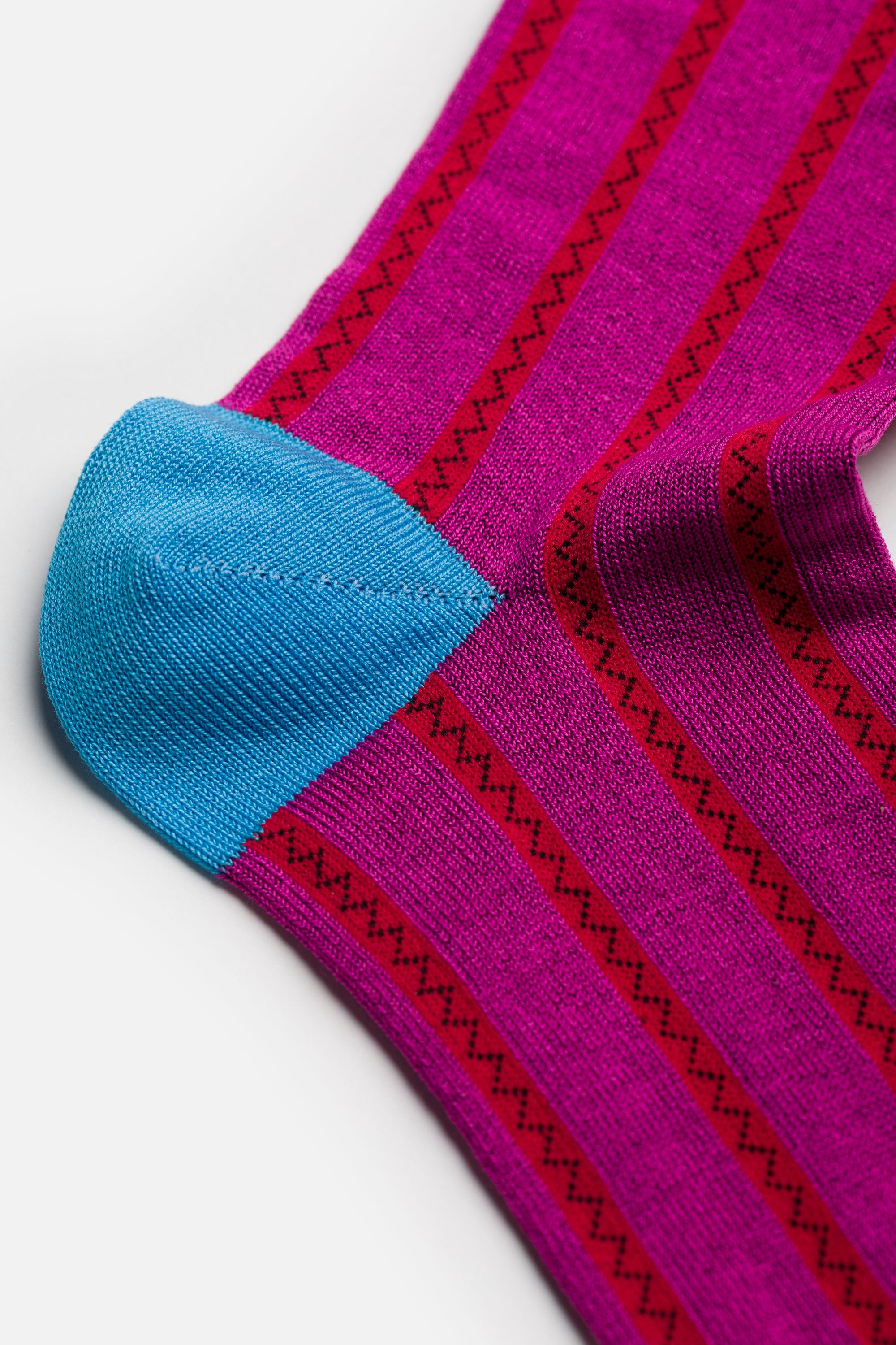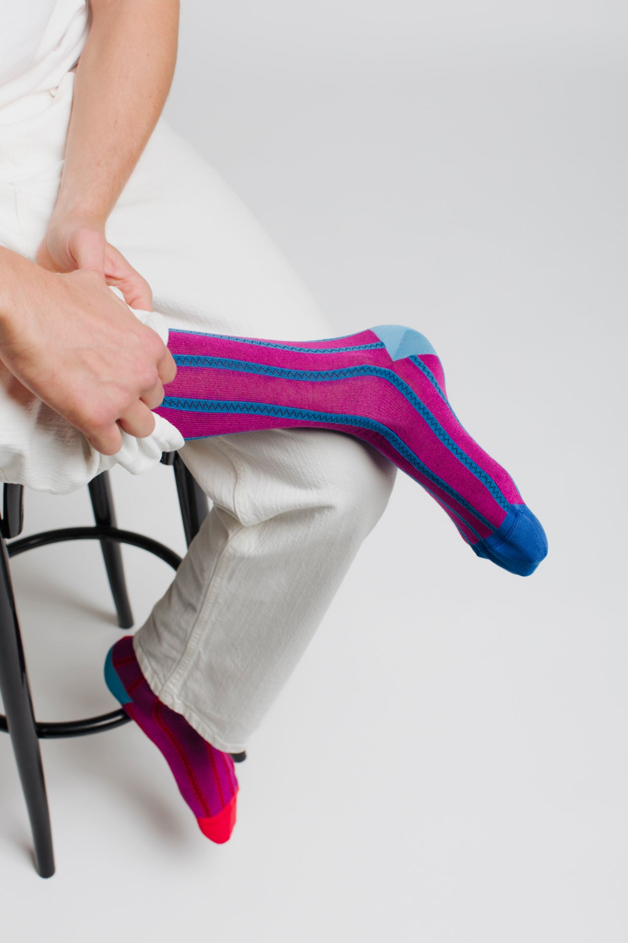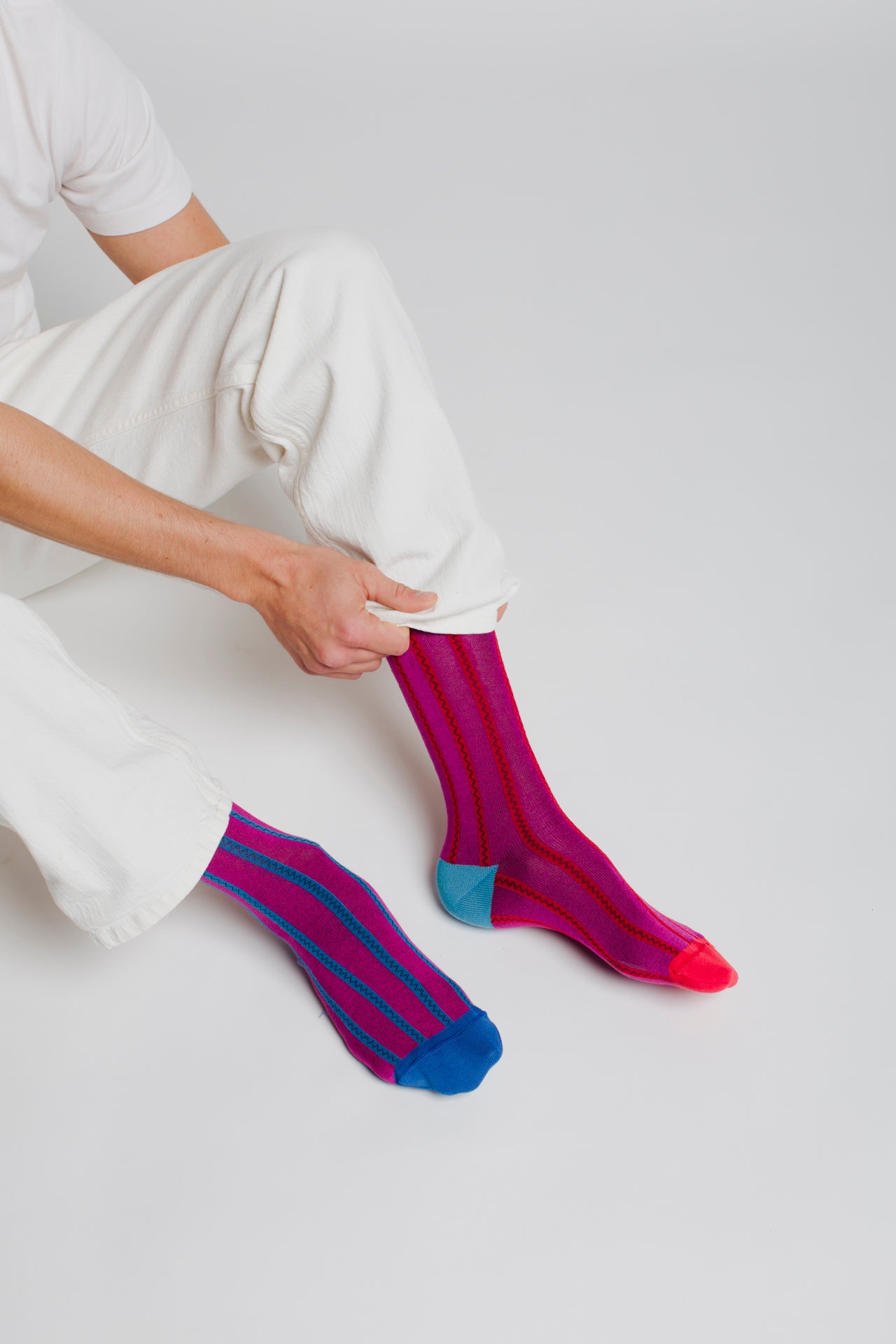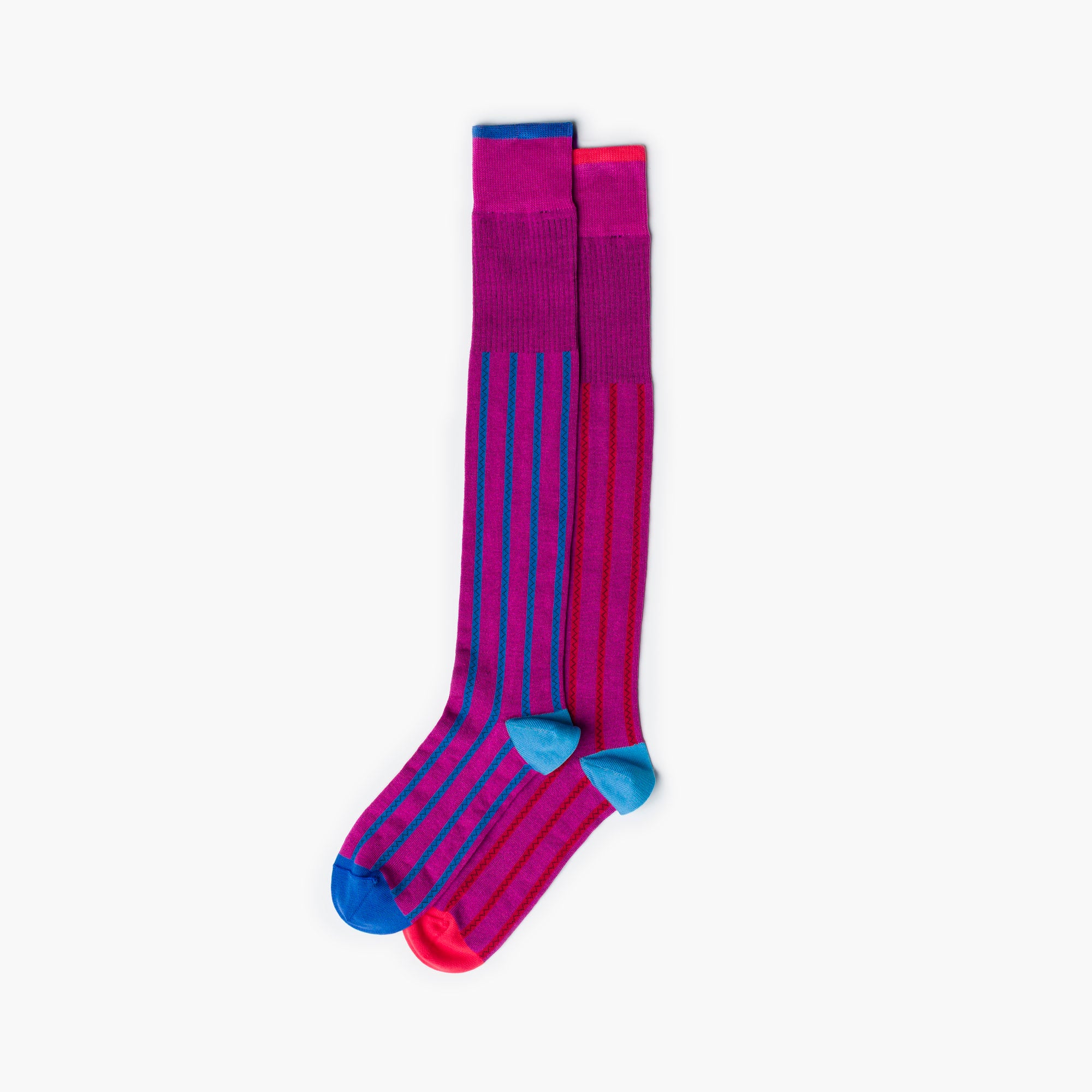 Knee-high socks in magenta, blue, orange and violet with thick vertical stripes in warm and cool tones. Asymmetrical pattern with contrasting sky-blue and orange heels and toes and mismatched cuffs. Made from 90% long-fibre cotton. Reinforced toe and heel, flat-knit toe seam and wide toe and heel sections for enhanced comfort.