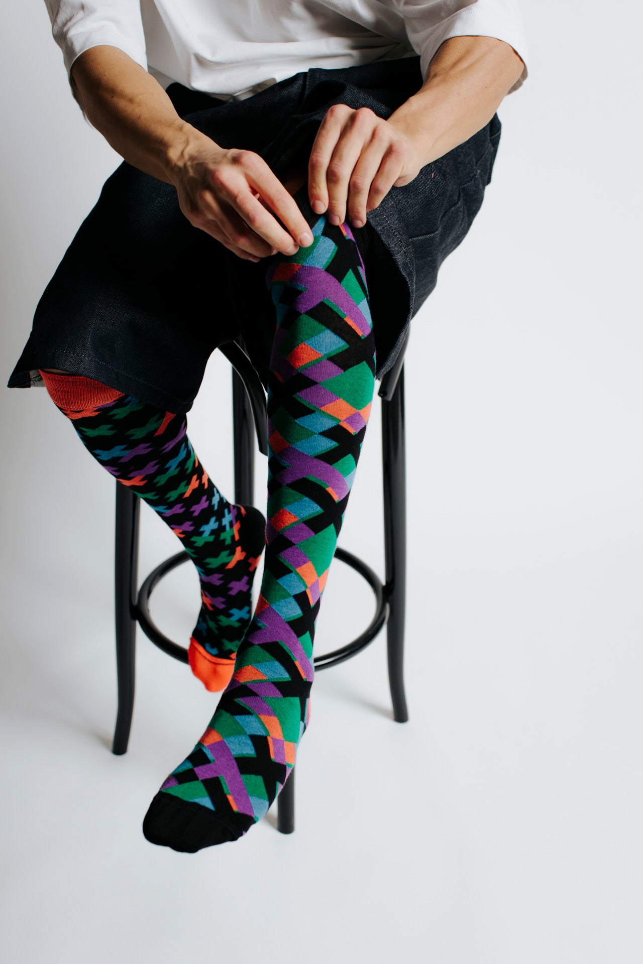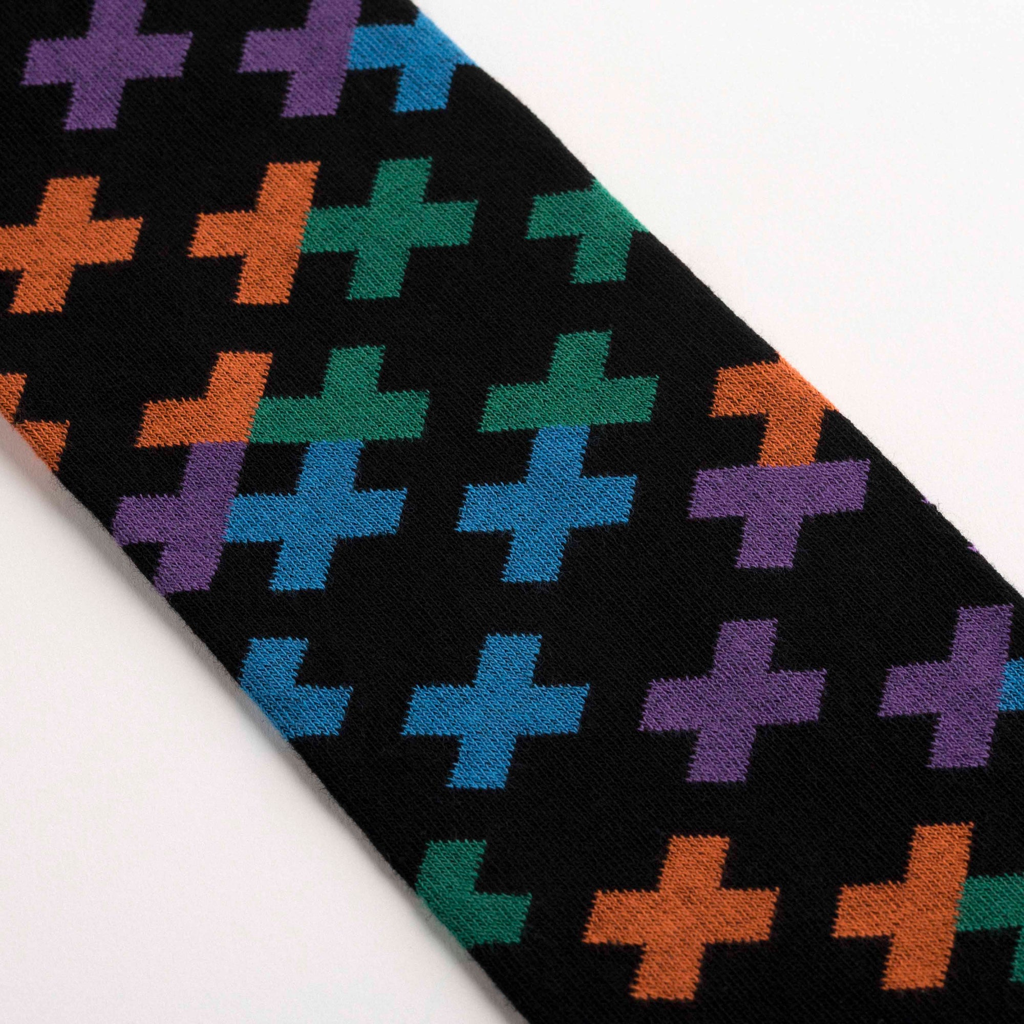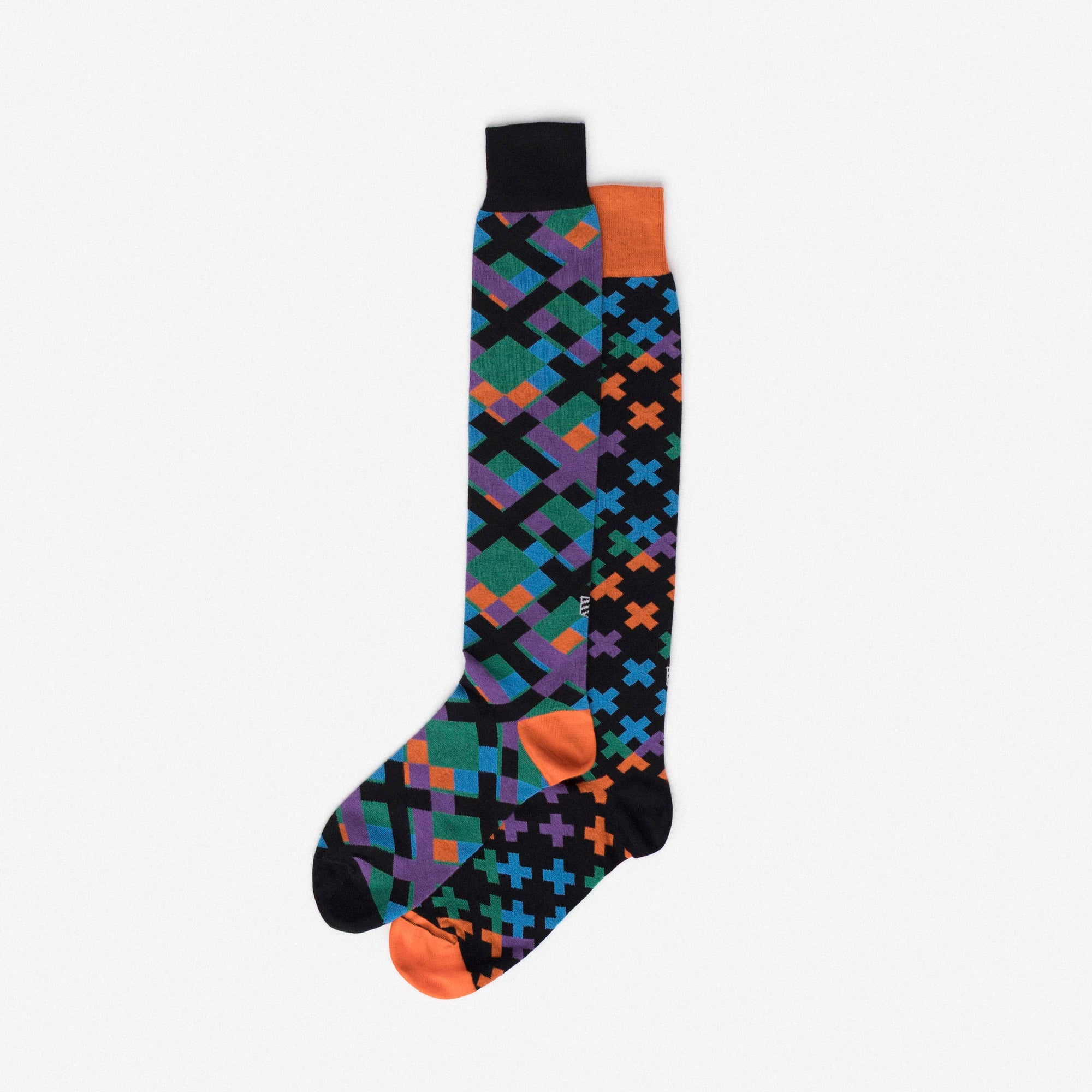 Knee-high socks decorated with vibrant geometric motifs in green, orange, purple and turquoise. Asymmetrical pattern with one sock featuring an intersecting grid design with a black cuff and orange toe, and the other displaying multicoloured crosses on a black base with an orange cuff and toe. Made from 90% long-fibre cotton. Reinforced toe and heel, flat-knit toe seam and wide toe and heel sections for enhanced comfort.