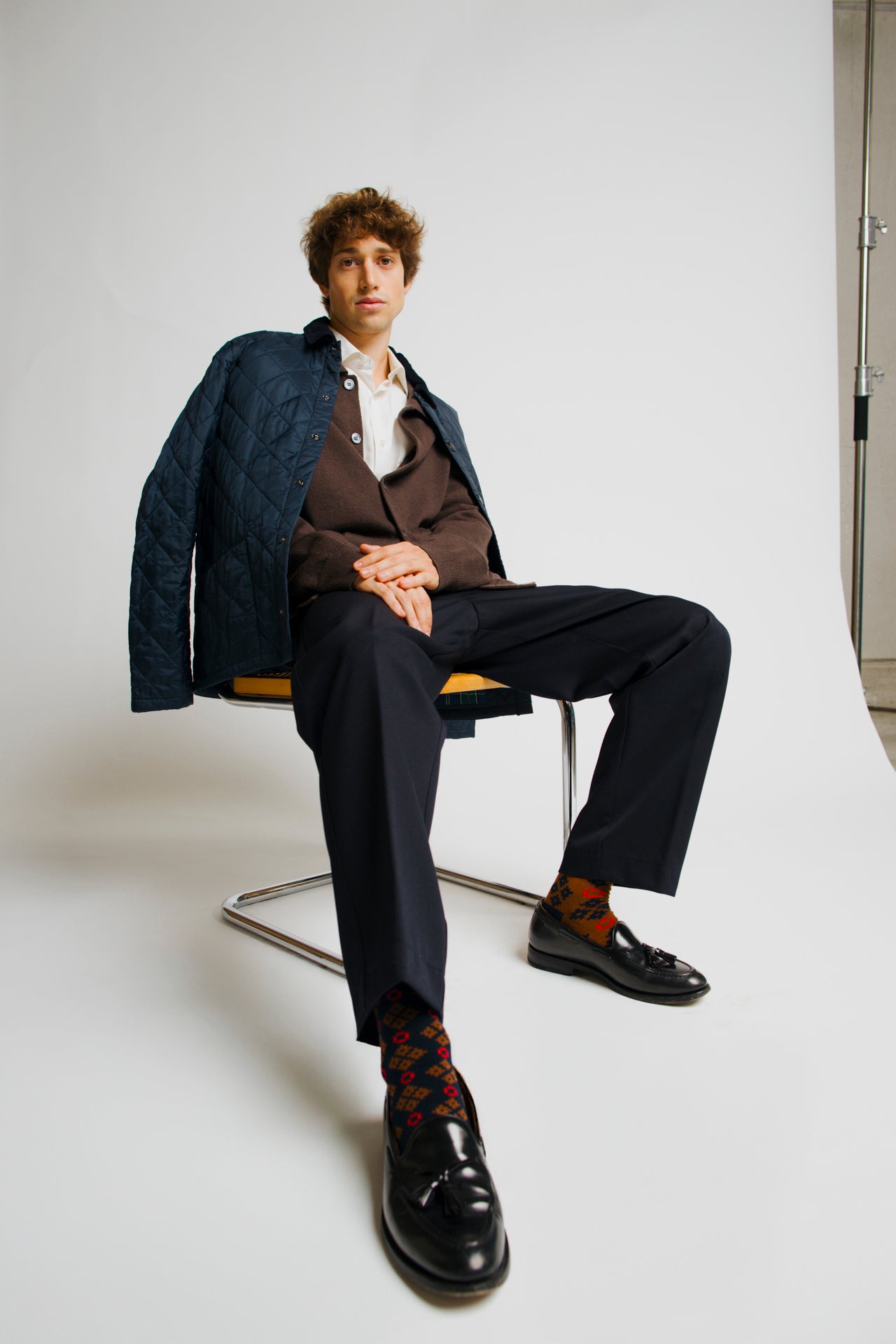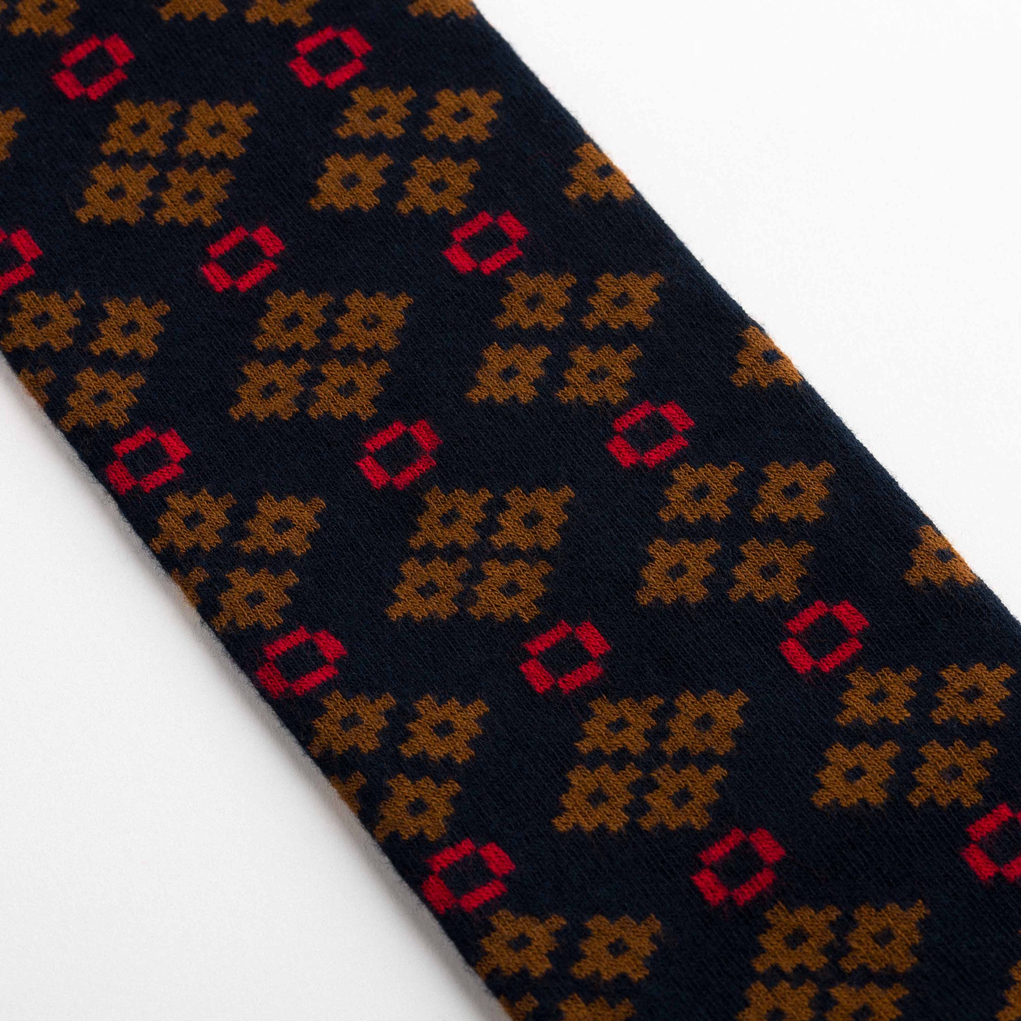Knee-high socks in cotton with brown, black and scarlet red geometric motifs. Asymmetrical pattern with variations in motif size and background colour between the two socks. Made from long-fibre cotton. Reinforced toe and heel, flat-knit toe seam and wide toe and heel sections for enhanced comfort.