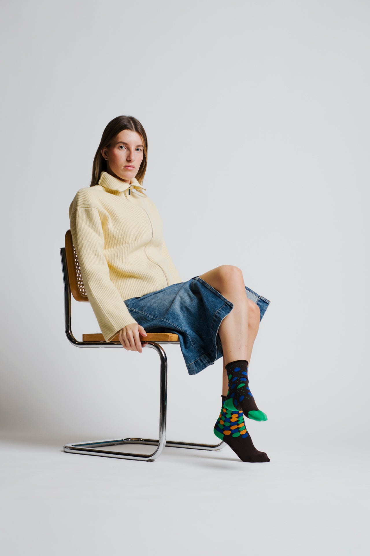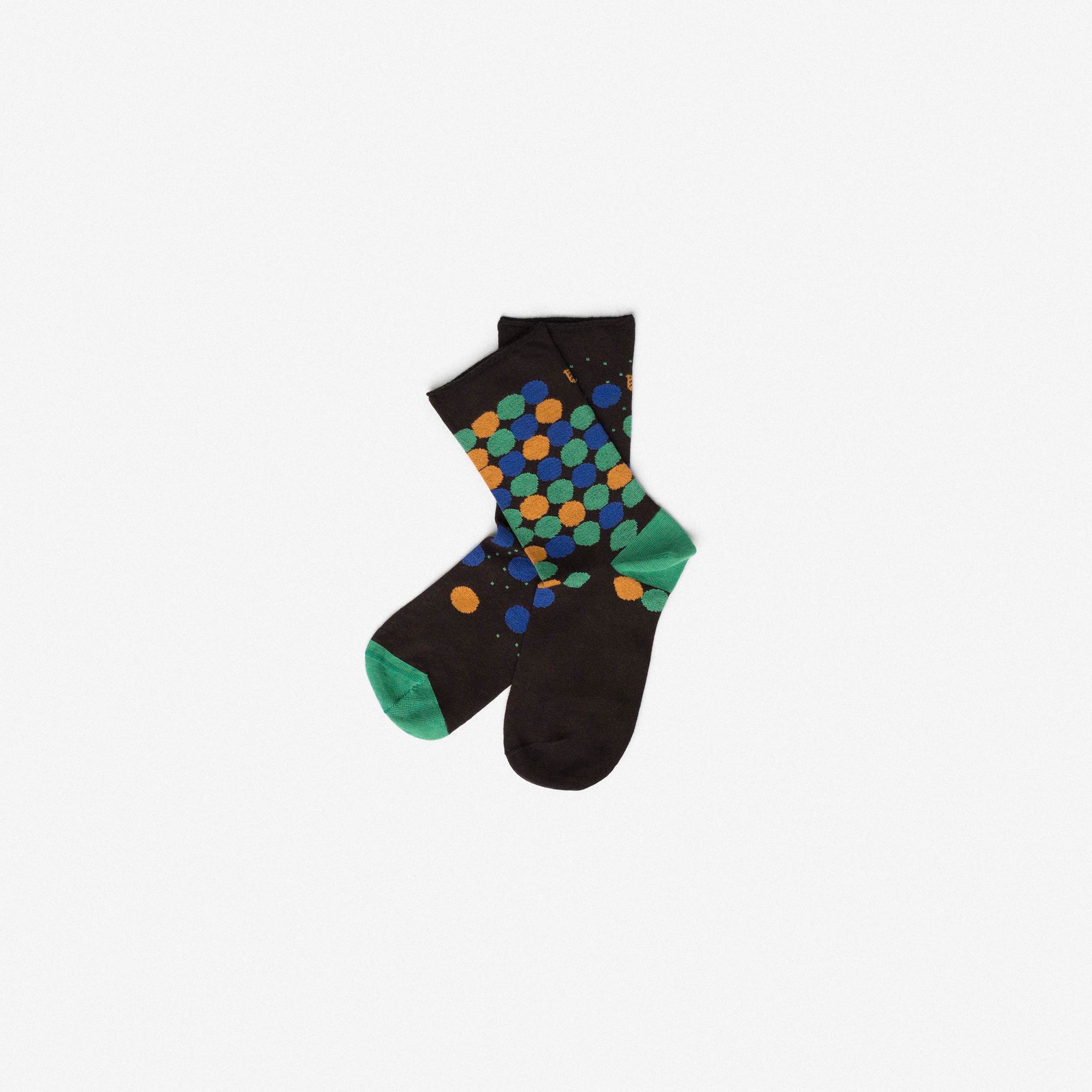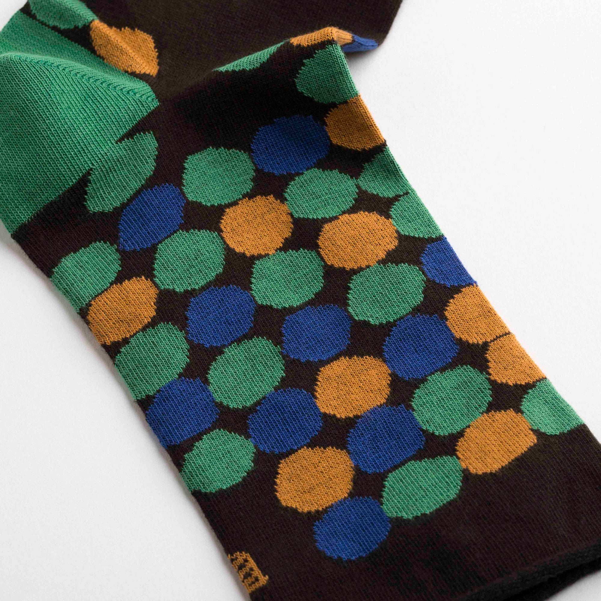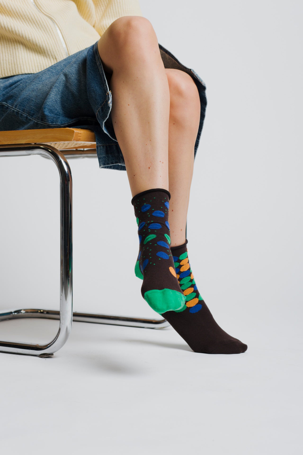 Ankle socks in deep brown with orange, blue and green polka dots and a raw-cut hem. Asymmetrical pattern with varying dot density between the two socks. Made from 90% long-fibre cotton. Reinforced toe and heel and a flat-knit toe seam for enhanced comfort.