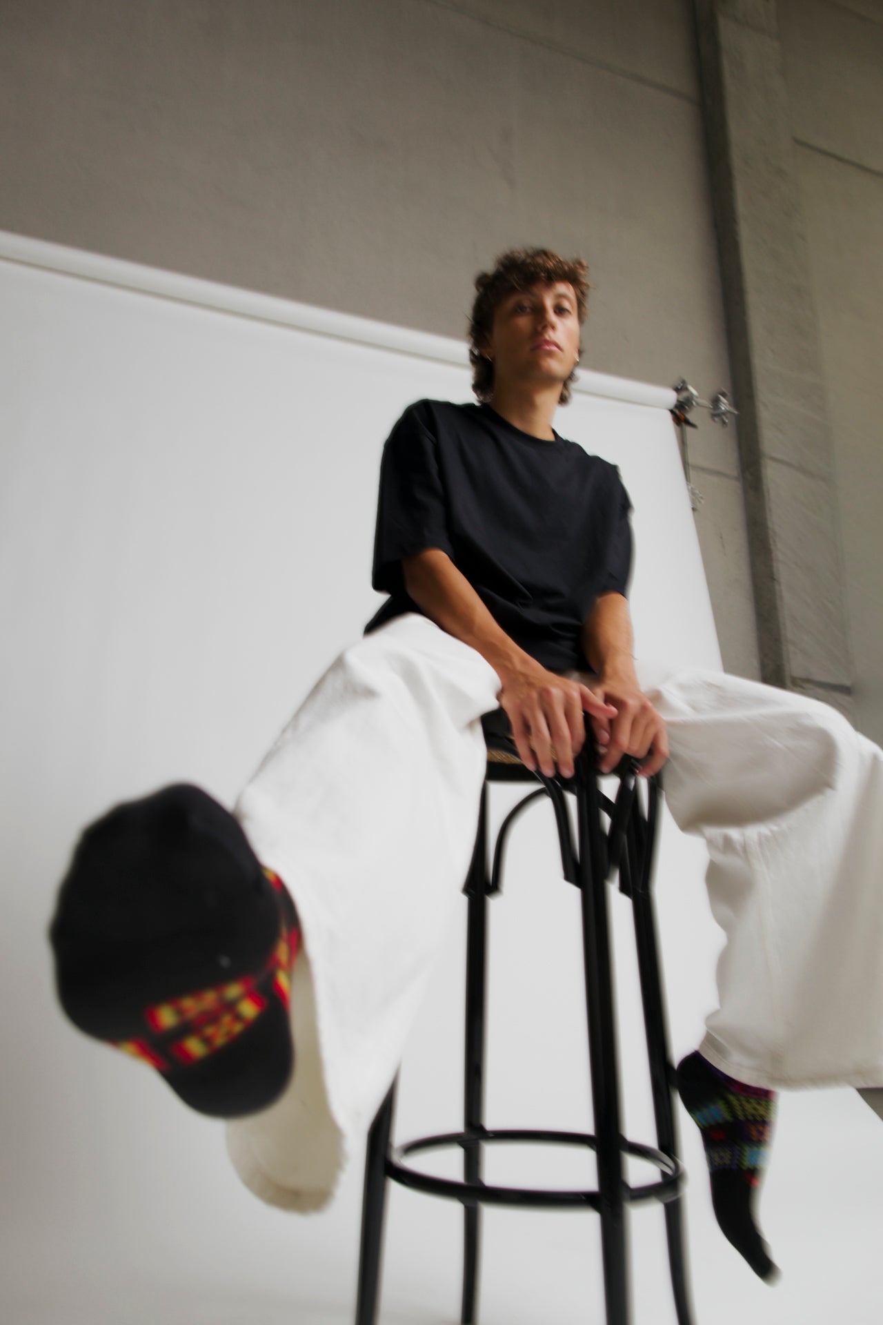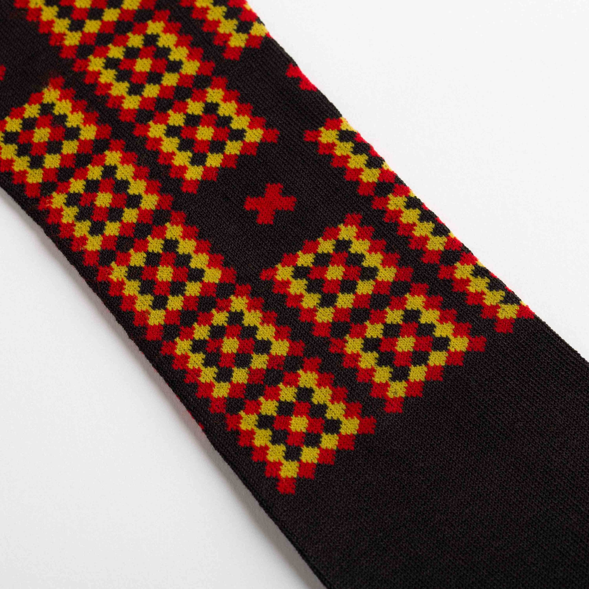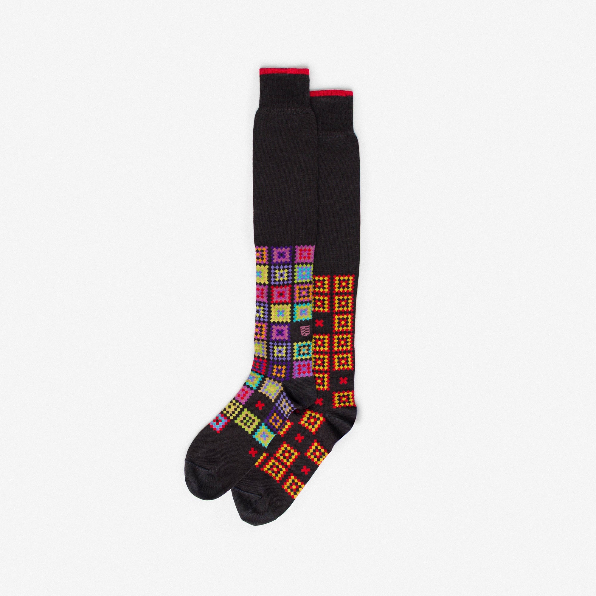 Knee-high socks in cotton with crochet-inspired embroidered motifs in multiple colours on a black base. Asymmetrical pattern with varying embroidery colours between the two socks. Made from cotton. Reinforced toe and heel, flat-knit toe seam and wide toe, and heel sections for enhanced comfort.