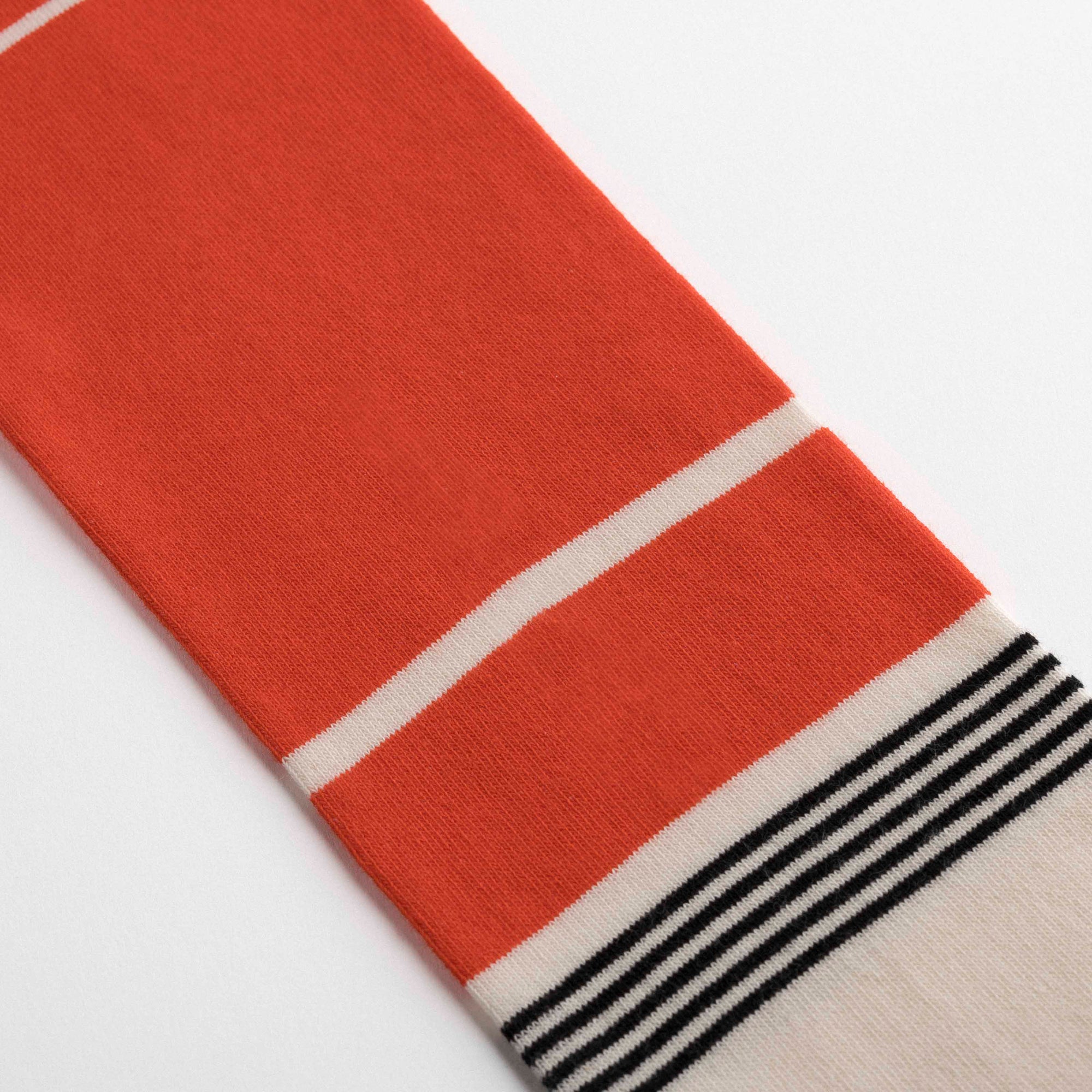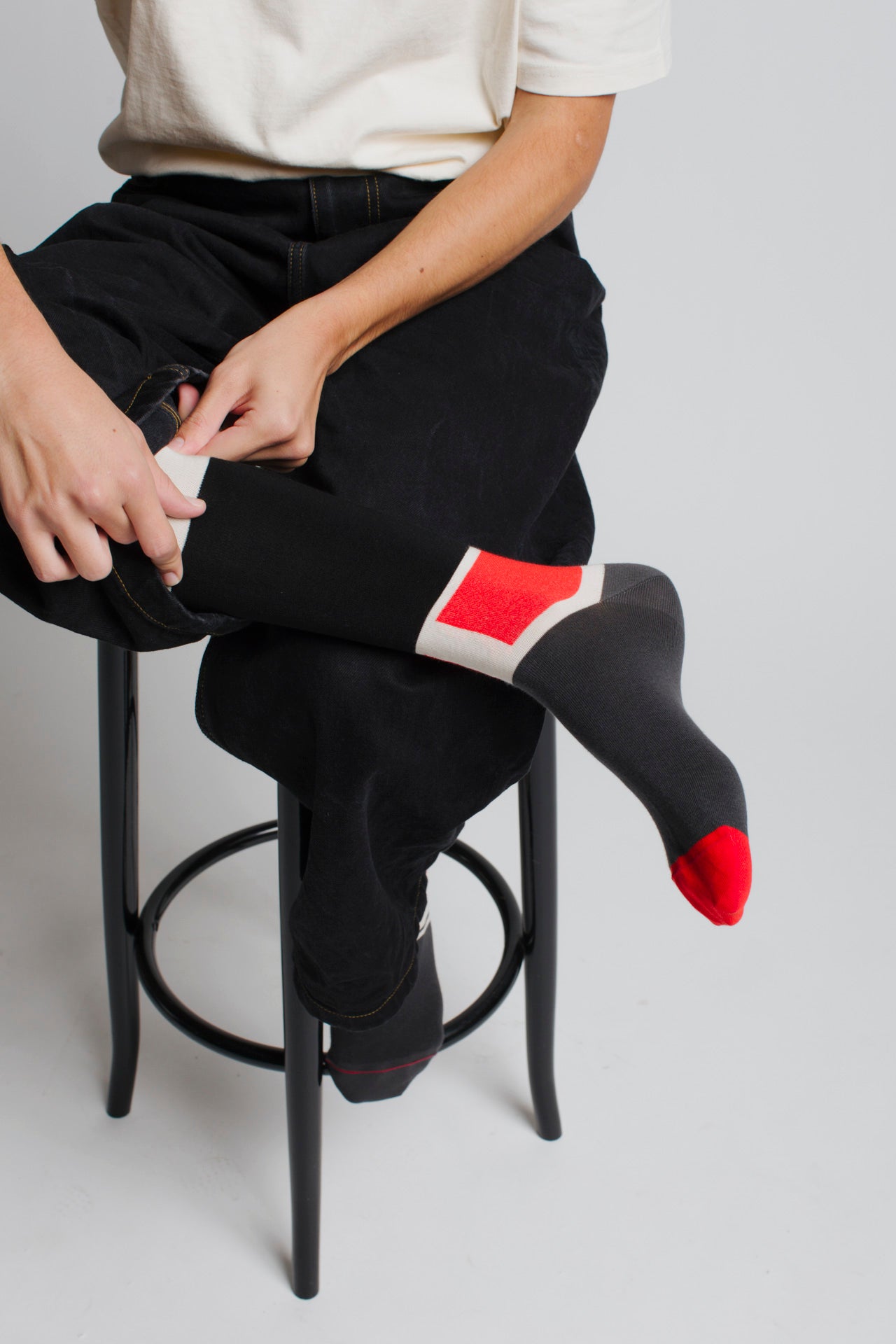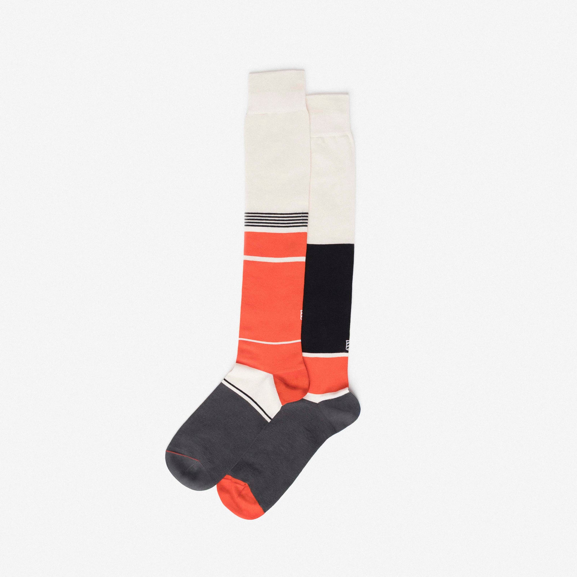 Knee-high socks in ivory with bold geometric blocks in red, black and thin horizontal stripes. Asymmetrical pattern with differing combinations of coloured panels and lines between the two socks. Made from 90% long-fibre cotton. Reinforced toe and heel, flat-knit toe seam and wide toe and heel sections for enhanced comfort.