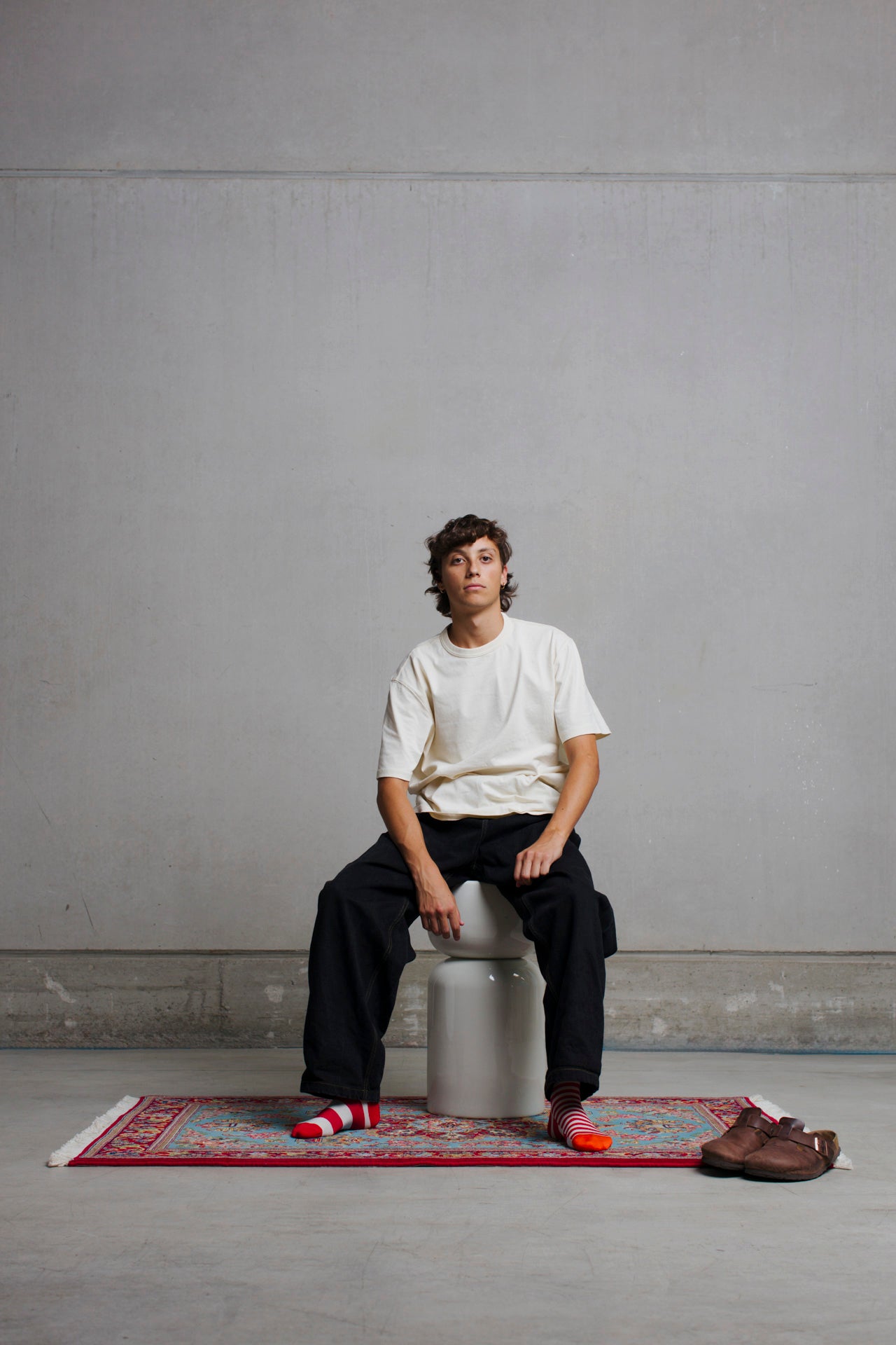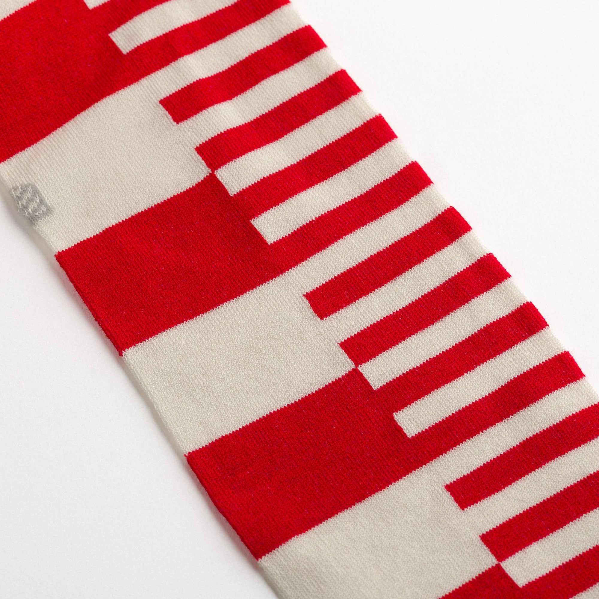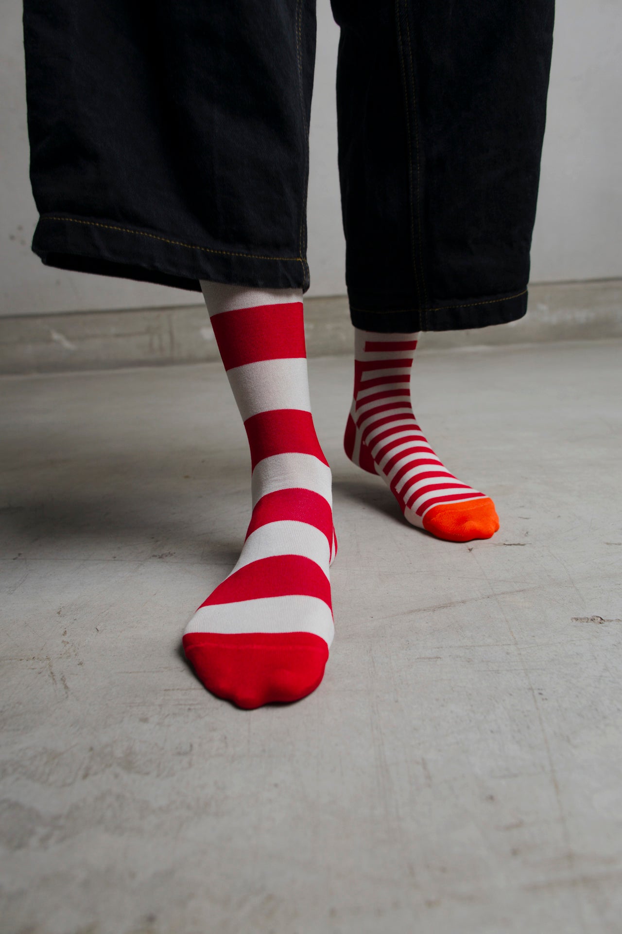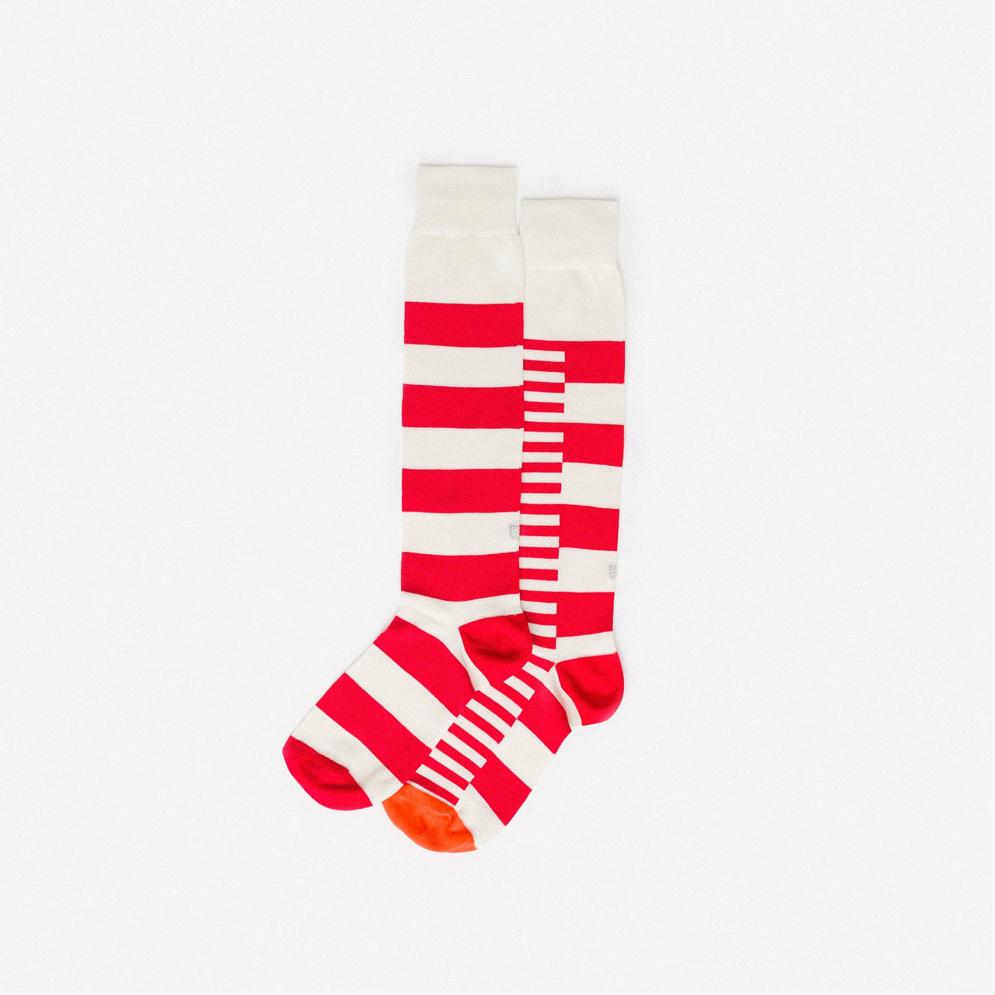 Knee-high socks in cotton with white and bright red stripes. Asymmetrical pattern with contrasting toe colours between the two socks. Made from long-fibre cotton. Reinforced toe and heel, flat-knit toe seam and wide toe and heel sections for enhanced comfort.