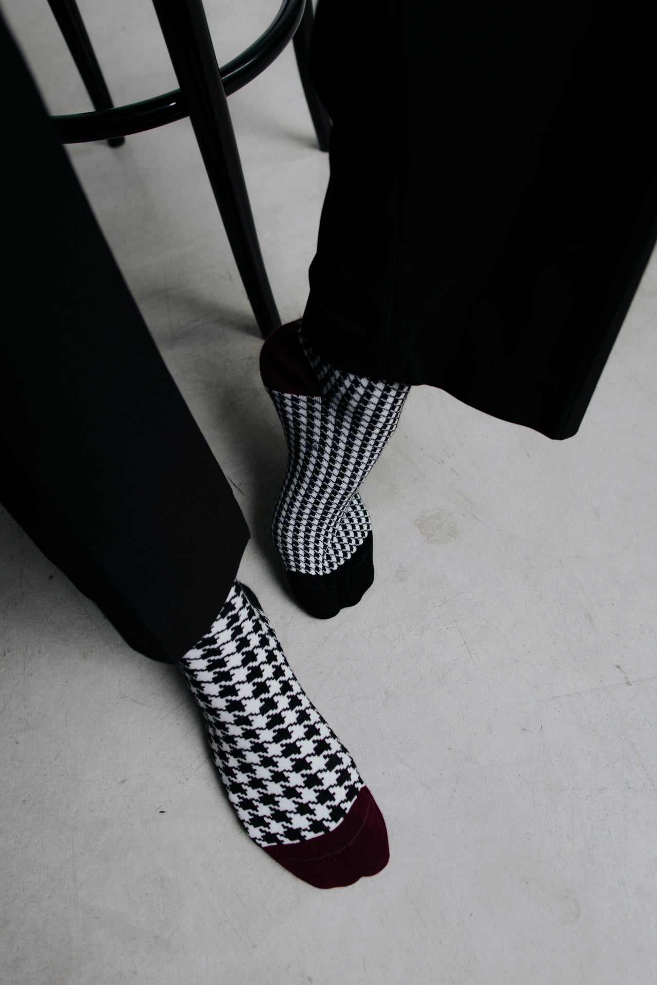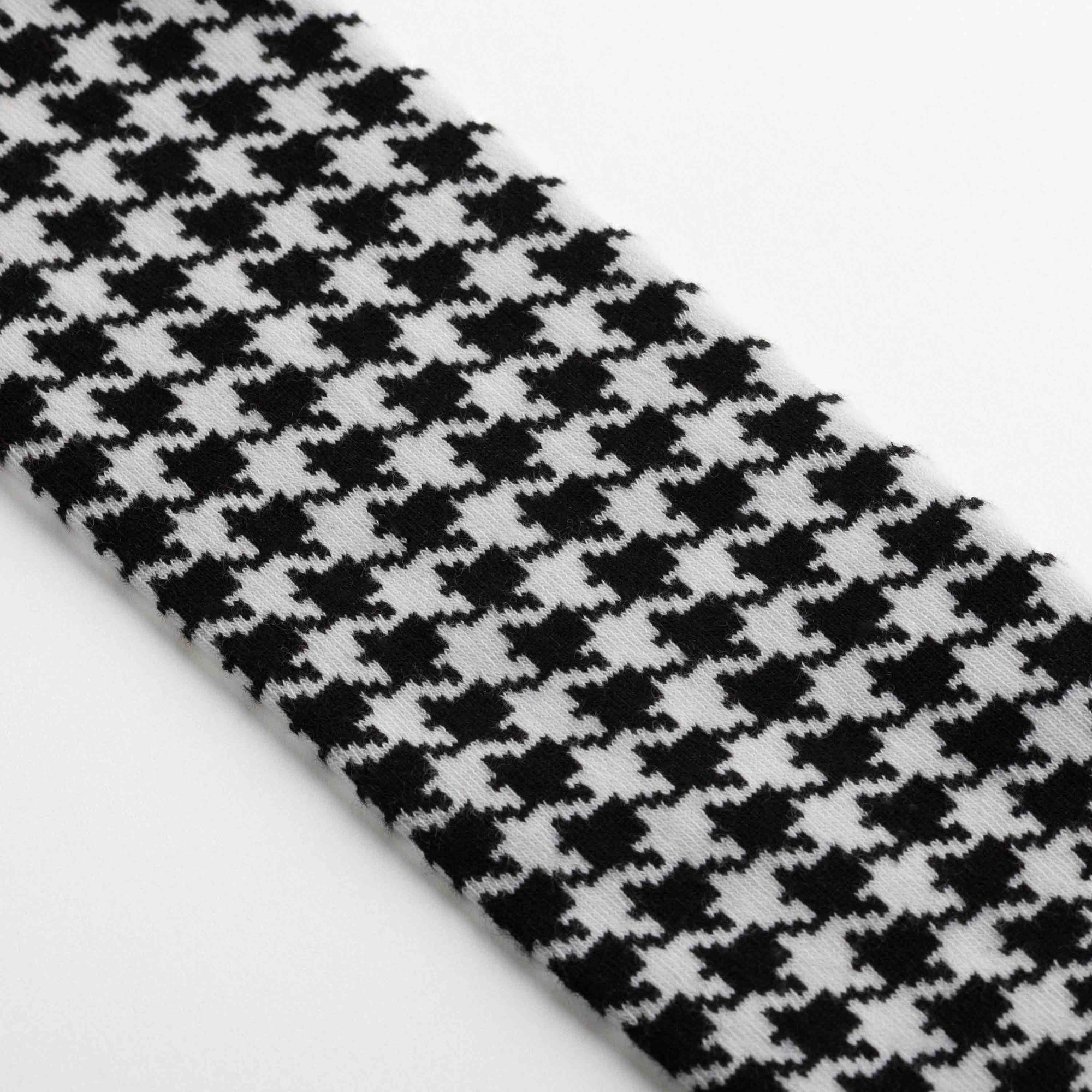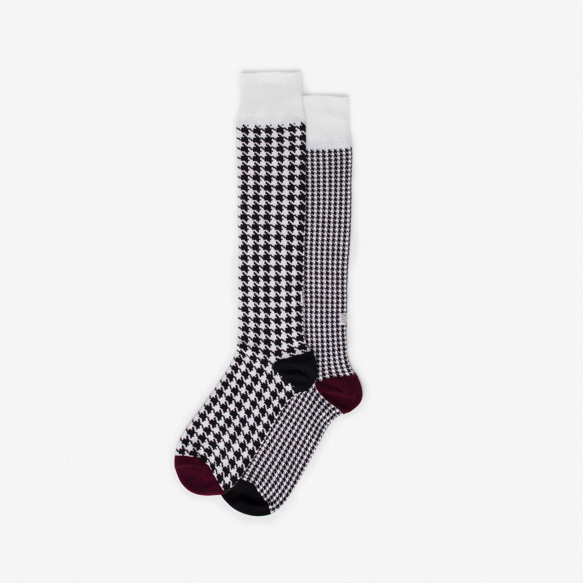 Knee-high socks in cotton with white, black and burgundy pied-de-poule motifs. Asymmetrical pattern with variations in motif size between the two socks and alternating heel and toe colours. Made from long-fibre cotton. Reinforced toe and heel, flat-knit toe seam and wide toe and heel sections for enhanced comfort.