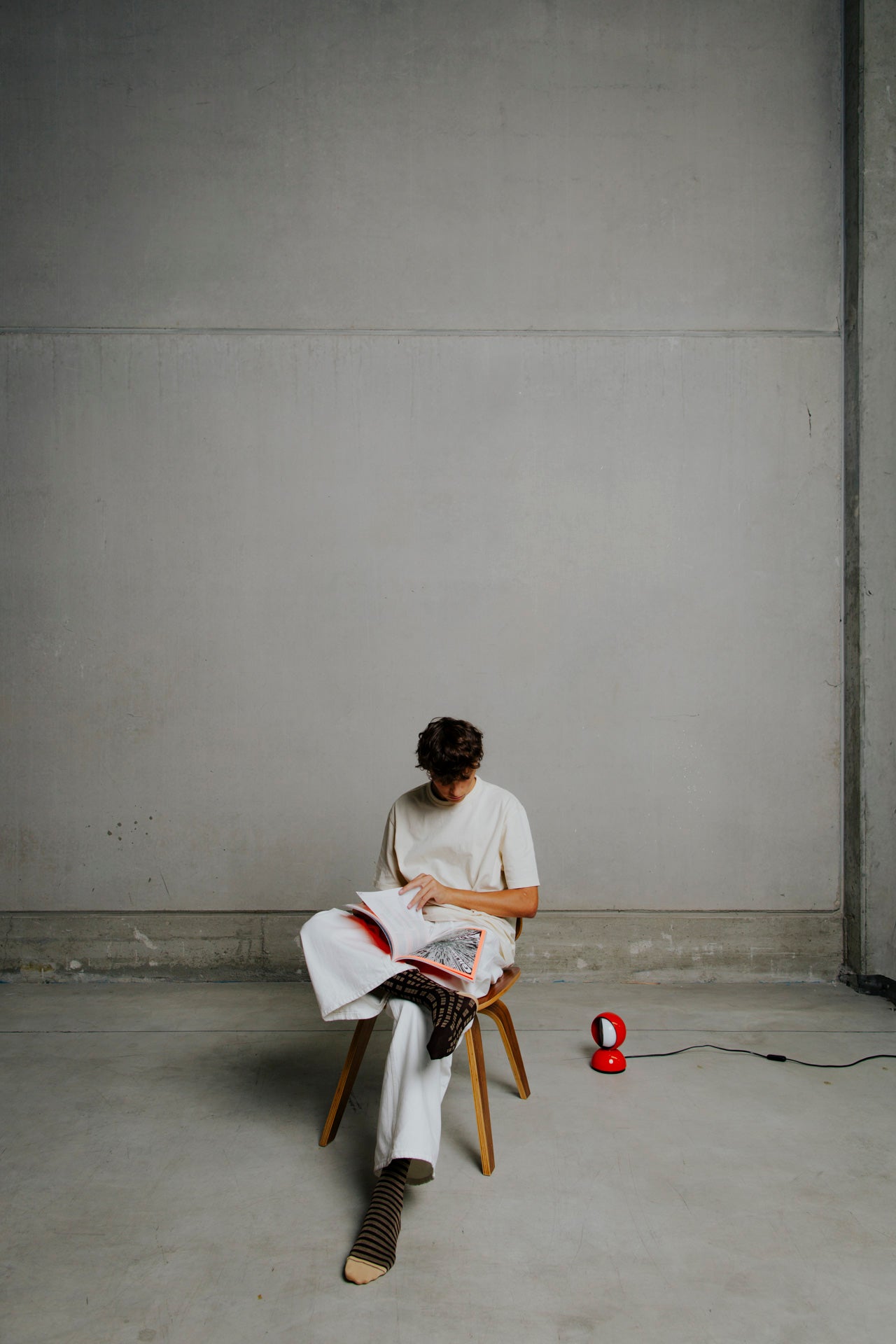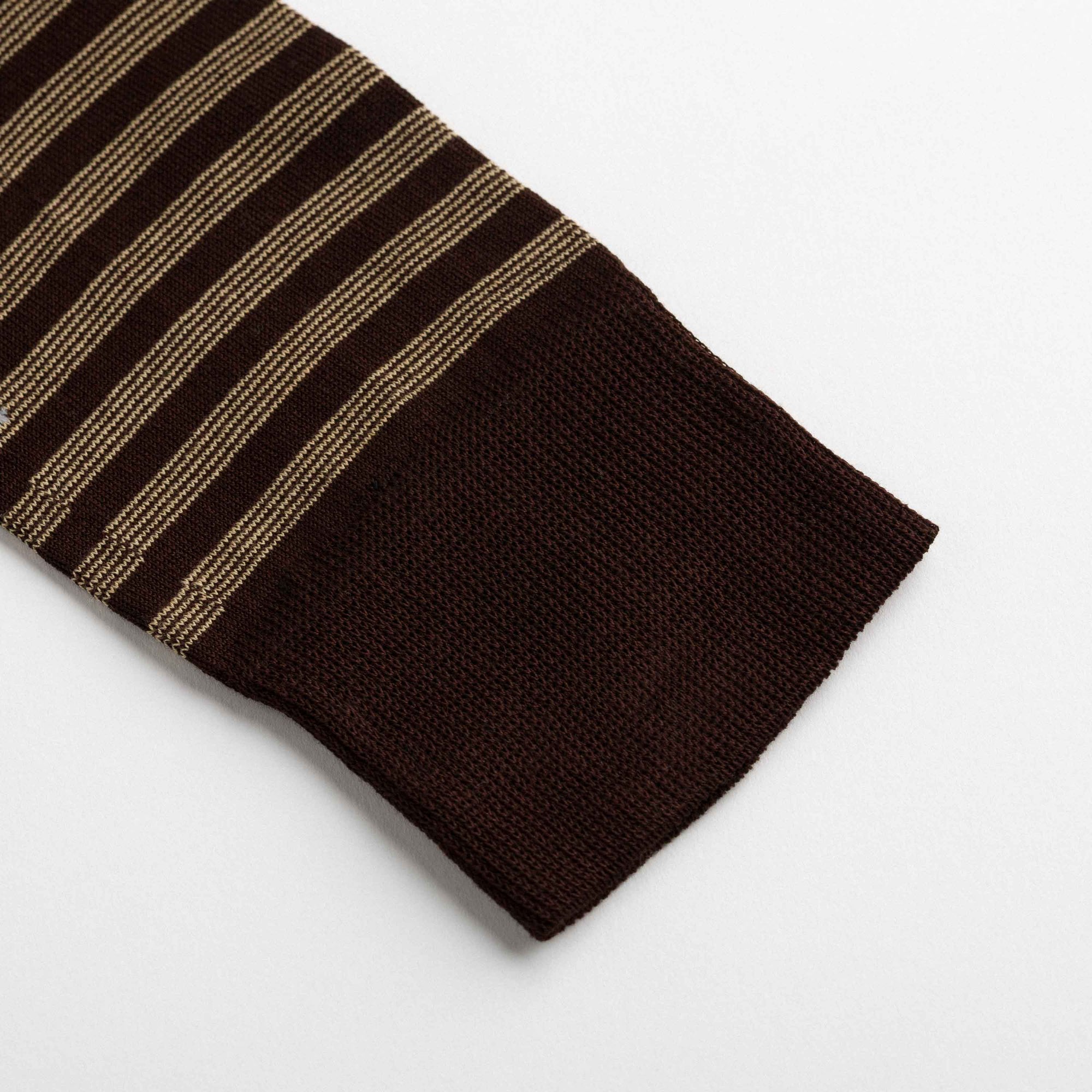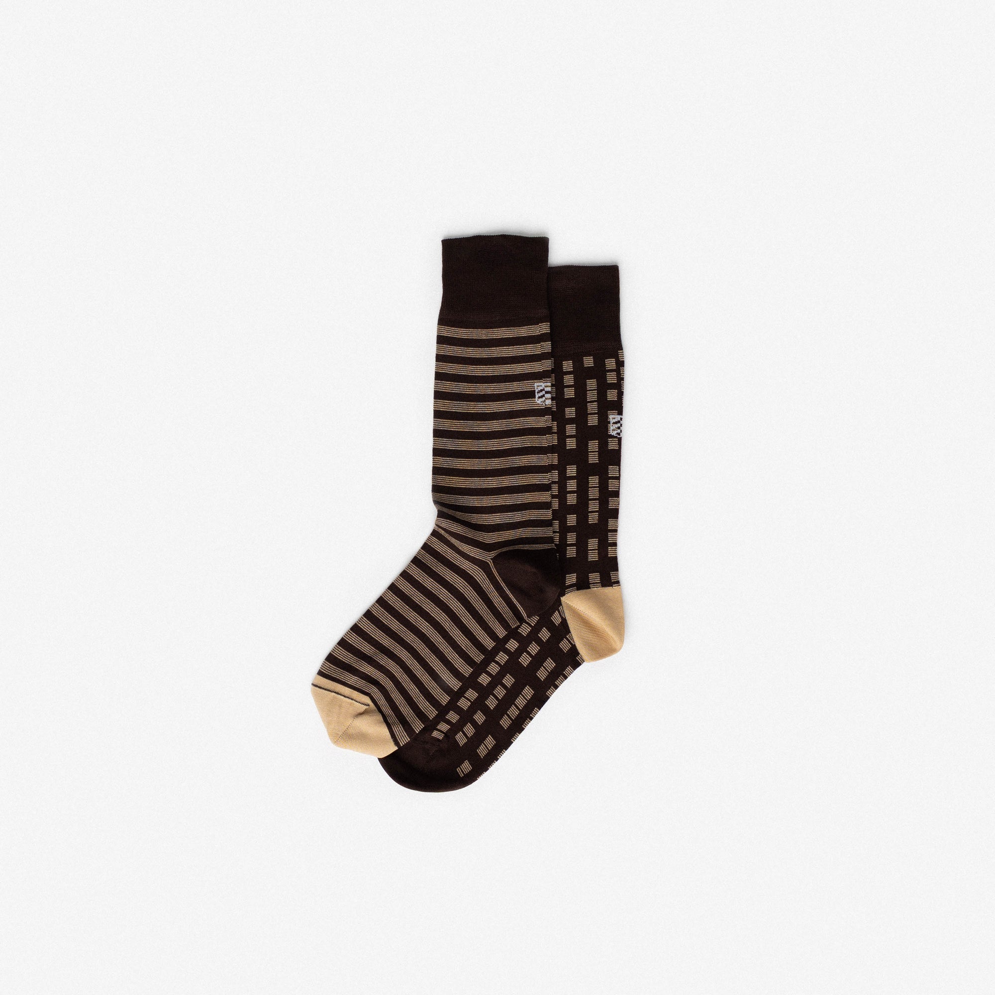 Mid-calf socks in cotton with brown and mustard geometric motifs, one striped and the other checked. Asymmetrical pattern with reversed heel and toe colours between the two socks. Made from long-fibre cotton. Reinforced toe and heel, flat-knit toe seam and wide toe and heel sections for enhanced comfort.