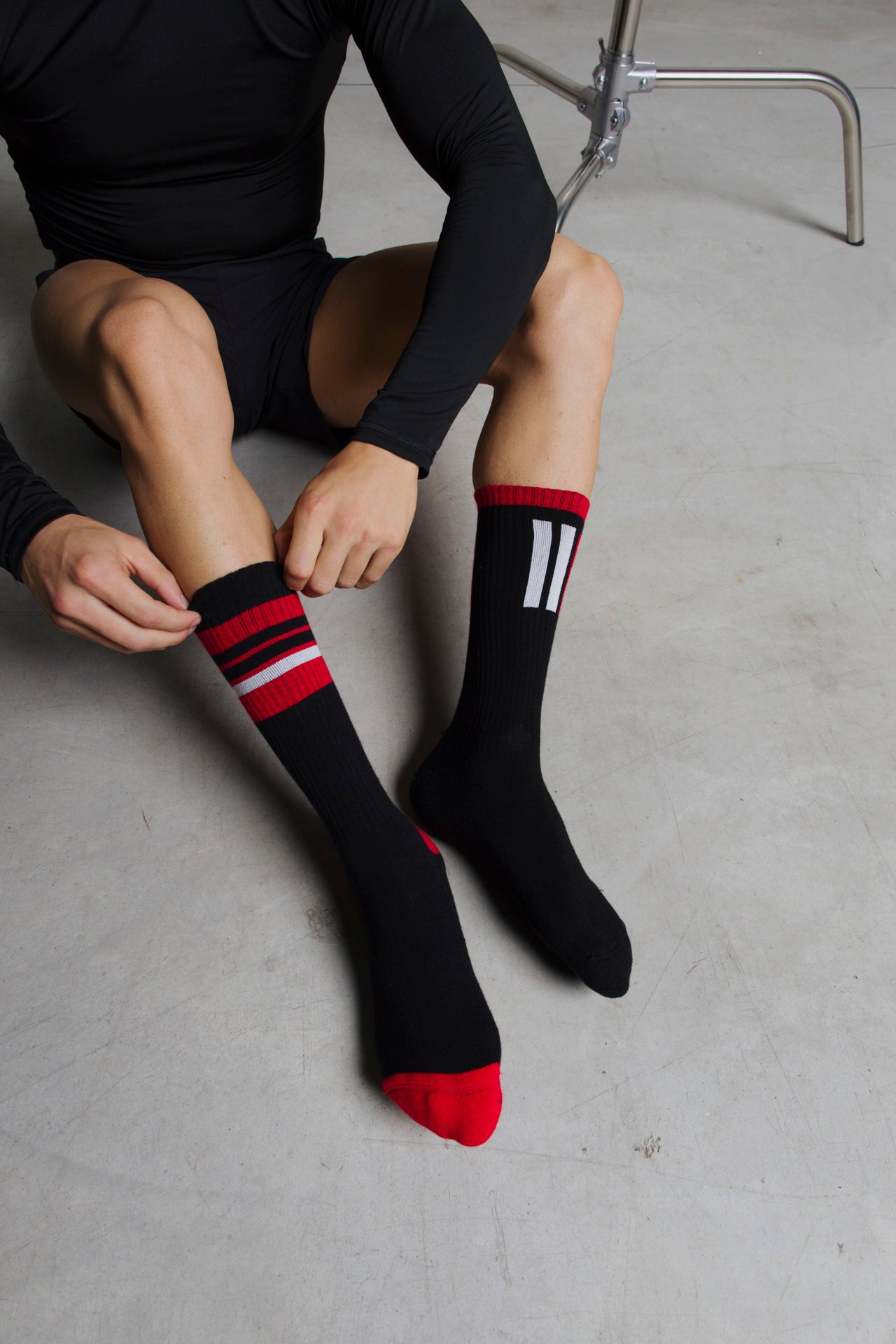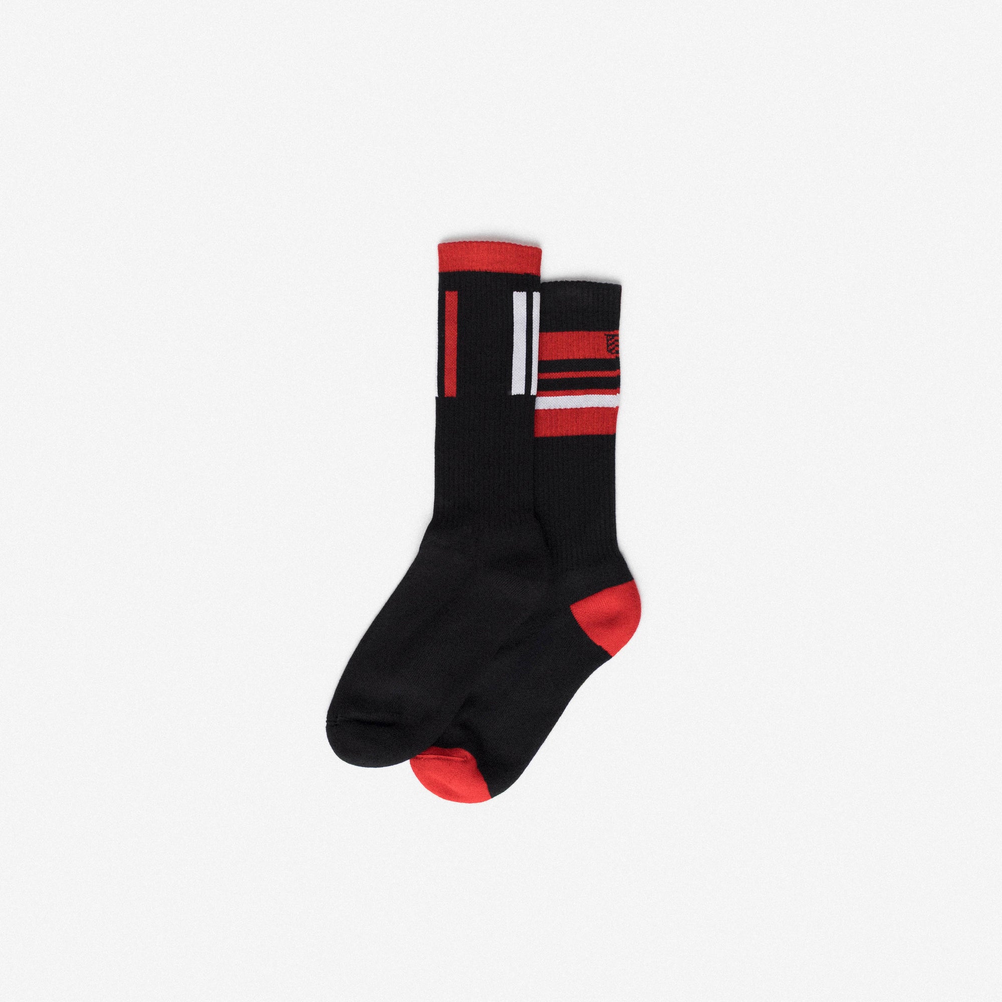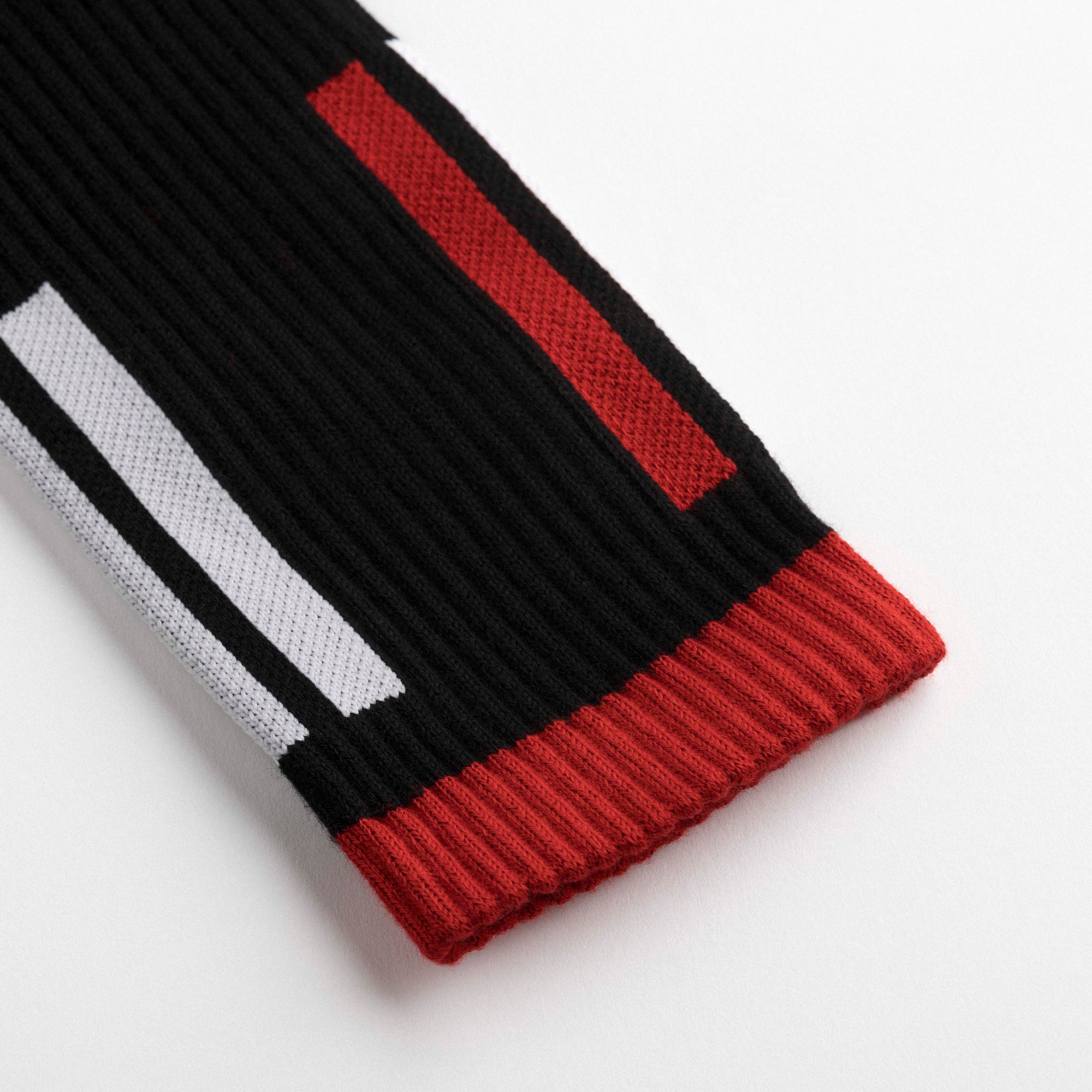 Ankle-length sports socks in terry cotton with a black base and red and white graphic line motifs. Asymmetrical pattern with differing stripe arrangements between the two socks and contrasting heel and toe in red or black. Made from 90% long-fibre cotton. Reinforced toe and heel, flat-knit toe seam and wide toe and heel sections for enhanced comfort.