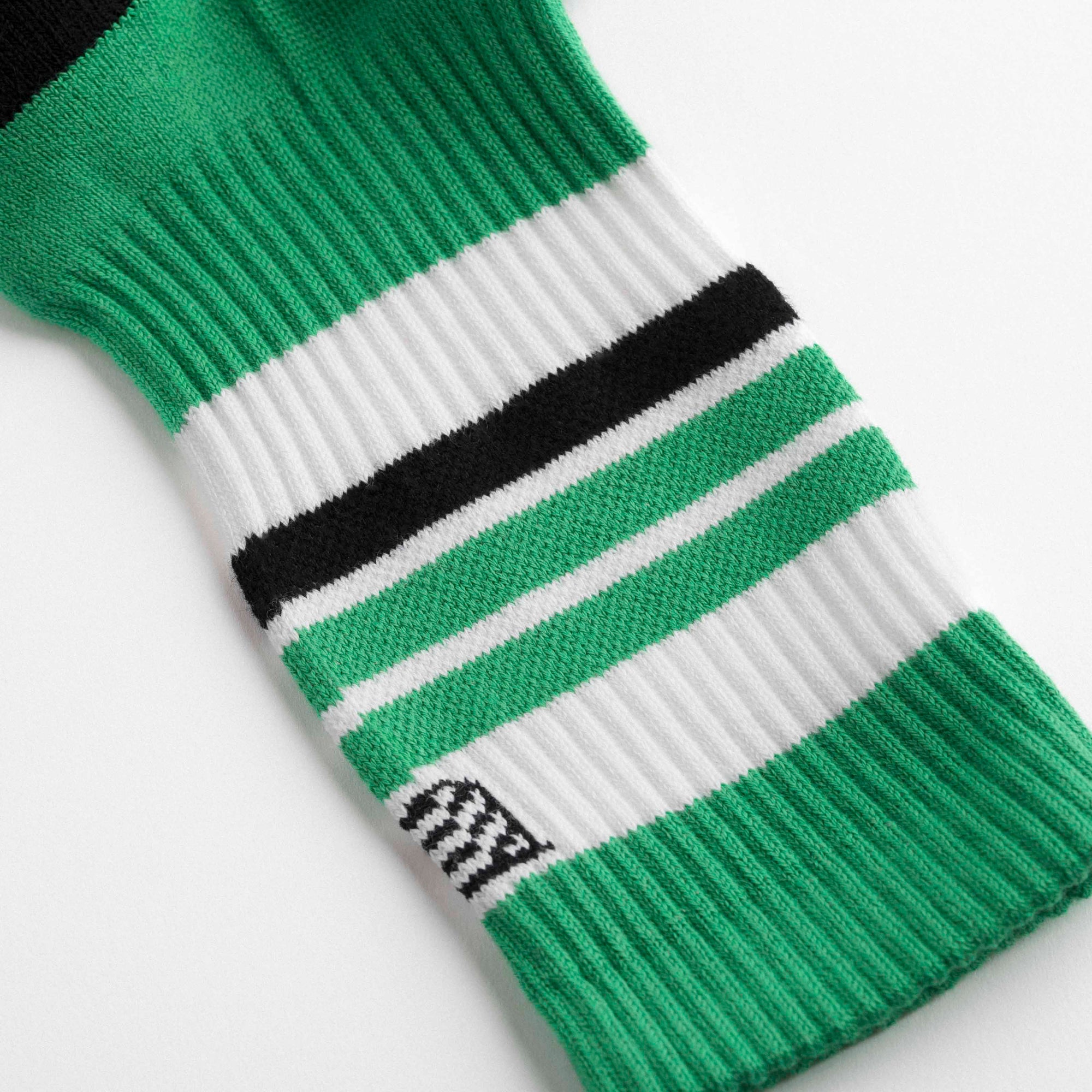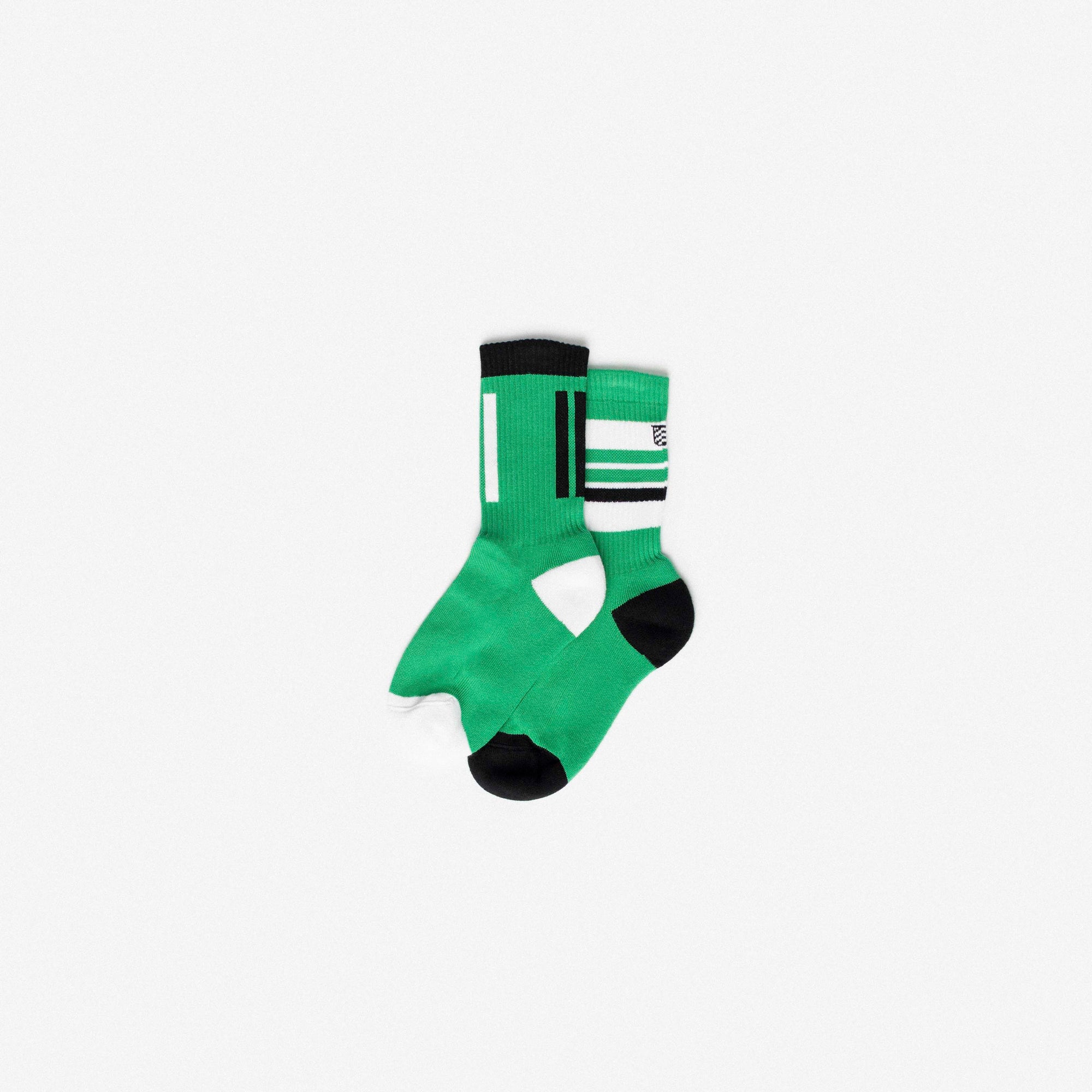 Ankle-length sports socks in terry cotton with a vibrant green base and black and white line details. Asymmetrical pattern with variations in stripe placement and width between the two socks, and contrasting heel and toe in black and white. Made from 90% long-fibre cotton. Reinforced toe and heel, flat-knit toe seam and wide toe and heel sections for enhanced comfort.