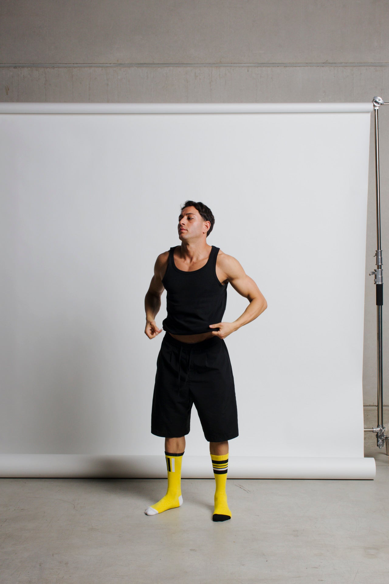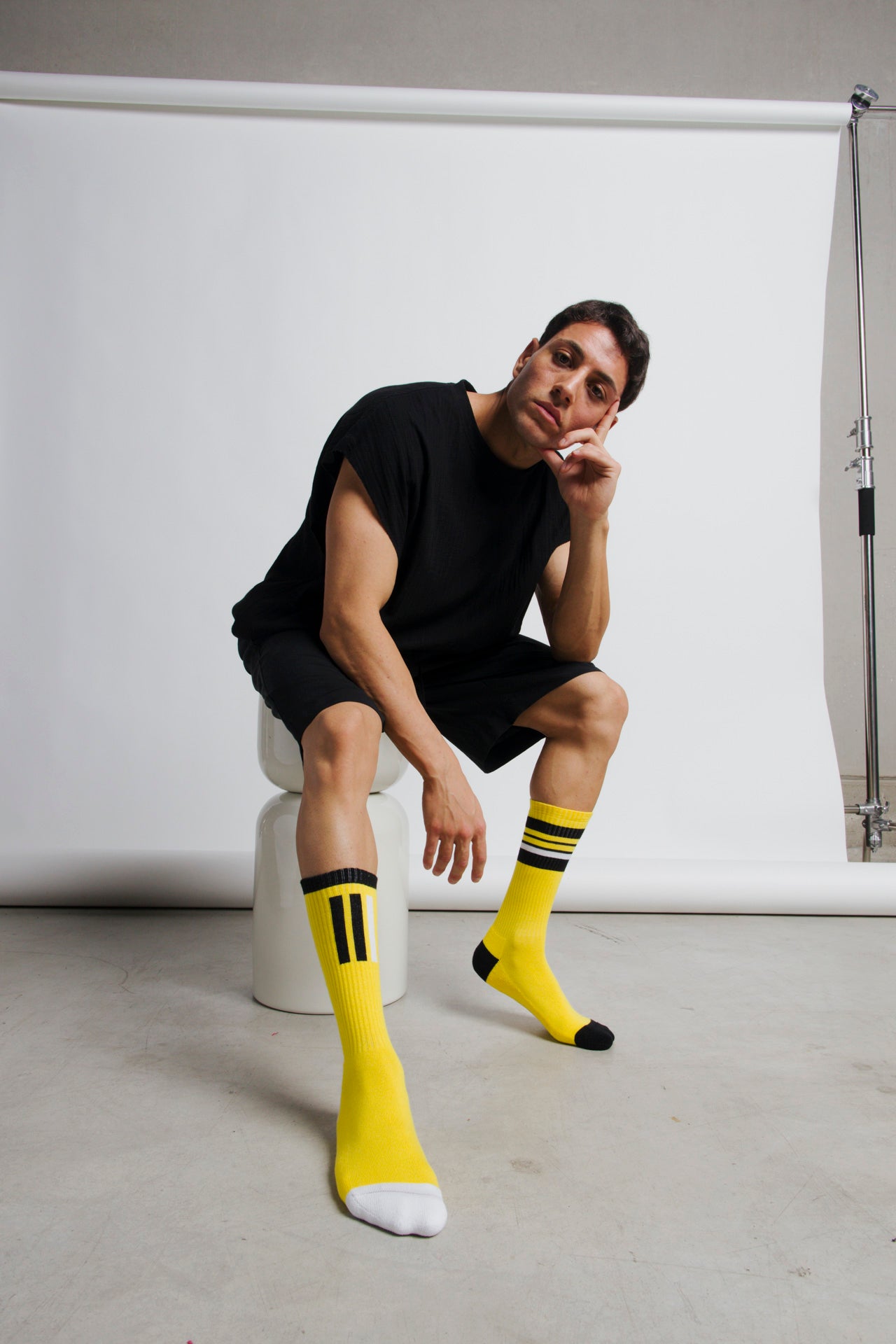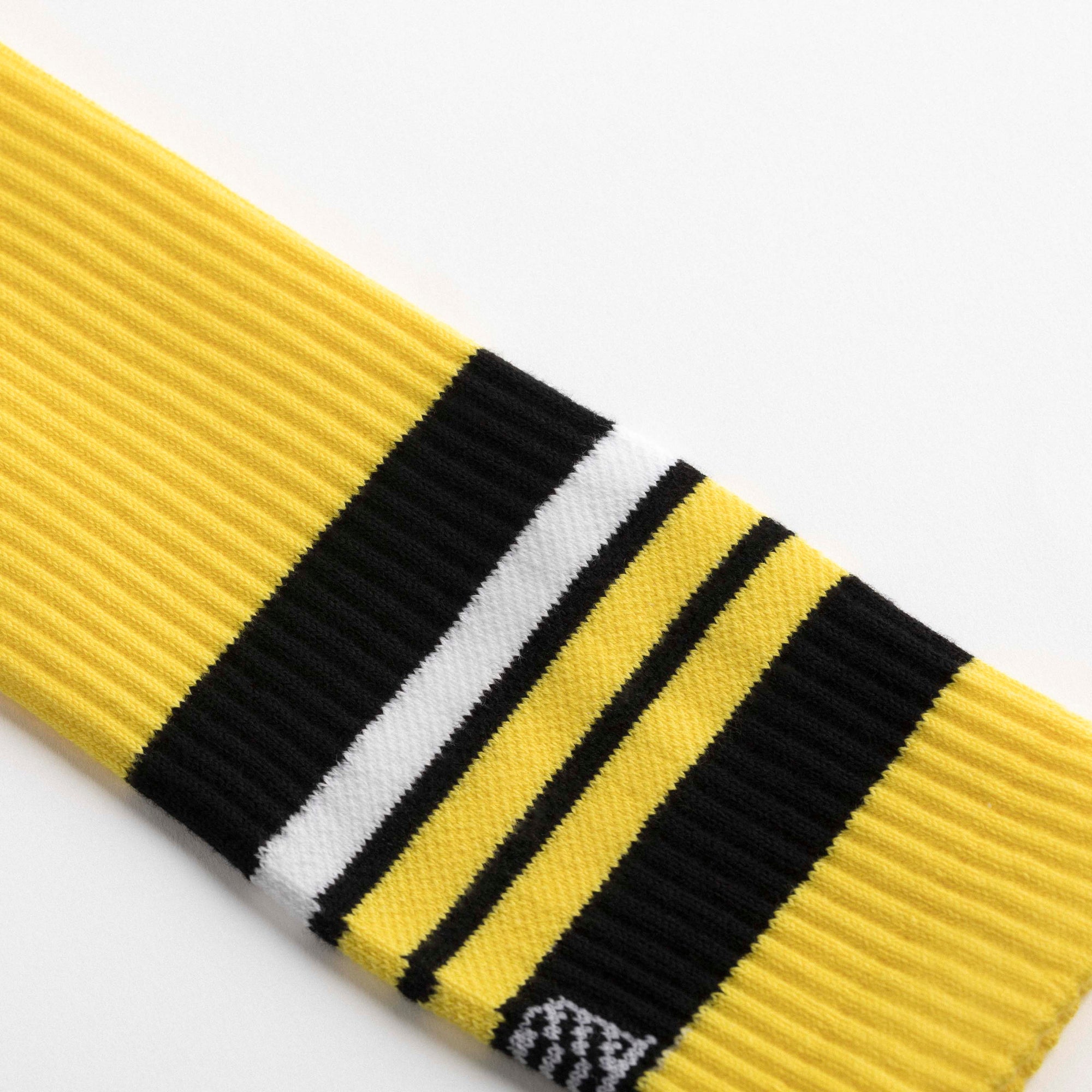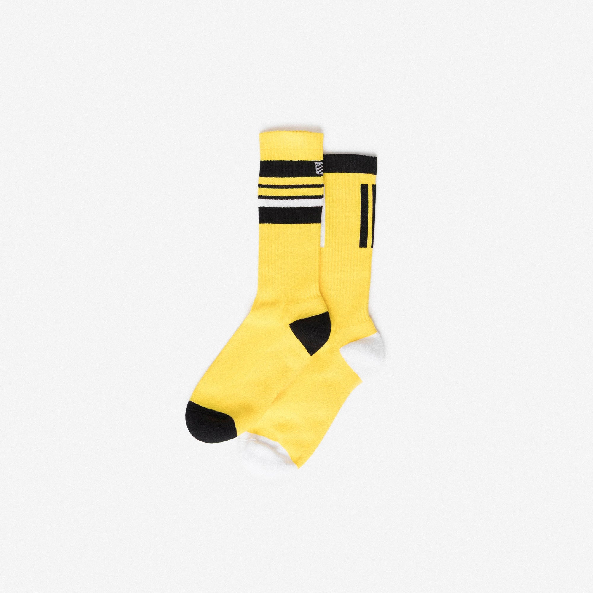 Ankle-length sports socks in terry cotton with a bold yellow base and black and white line motifs. Asymmetrical pattern with differing line combinations between the two socks and contrasting heel and toe in black and white. Made from 90% long-fibre cotton. Reinforced toe and heel, flat-knit toe seam and wide toe and heel sections for enhanced comfort.