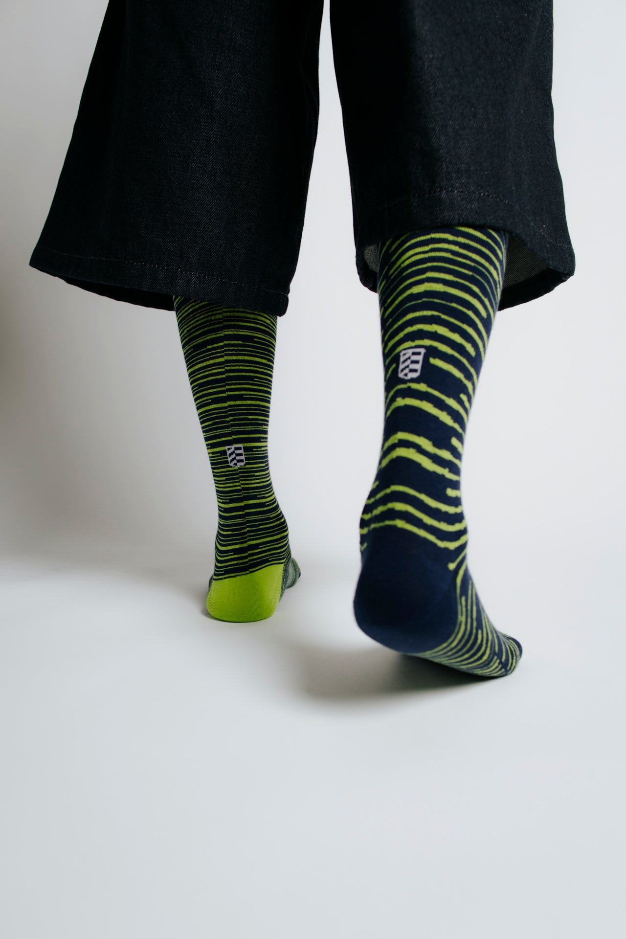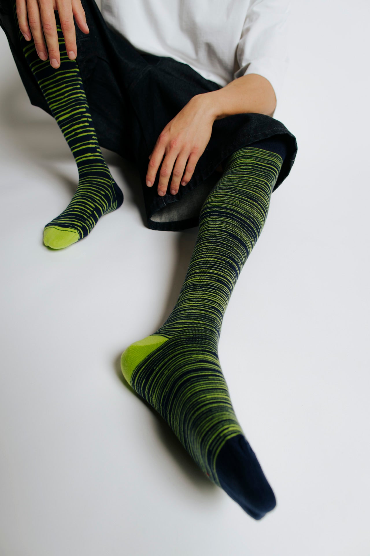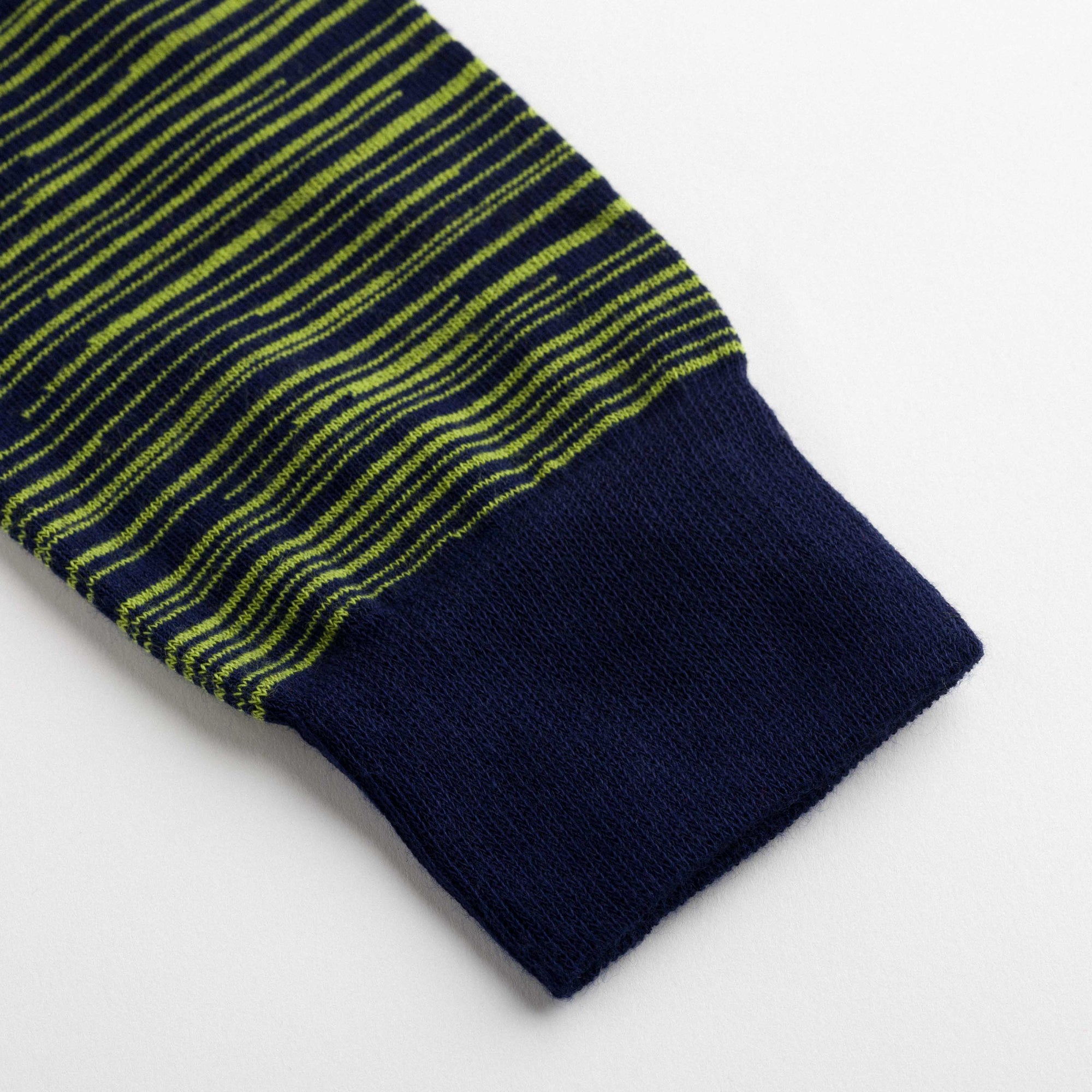 Knee-high socks with irregular lime green and navy blue linear stripes. Asymmetrical pattern with differing stripe density and orientation between the two socks. Made from 90% long-fibre cotton. Reinforced toe and heel, flat-knit toe seam and wide toe and heel sections for enhanced comfort.