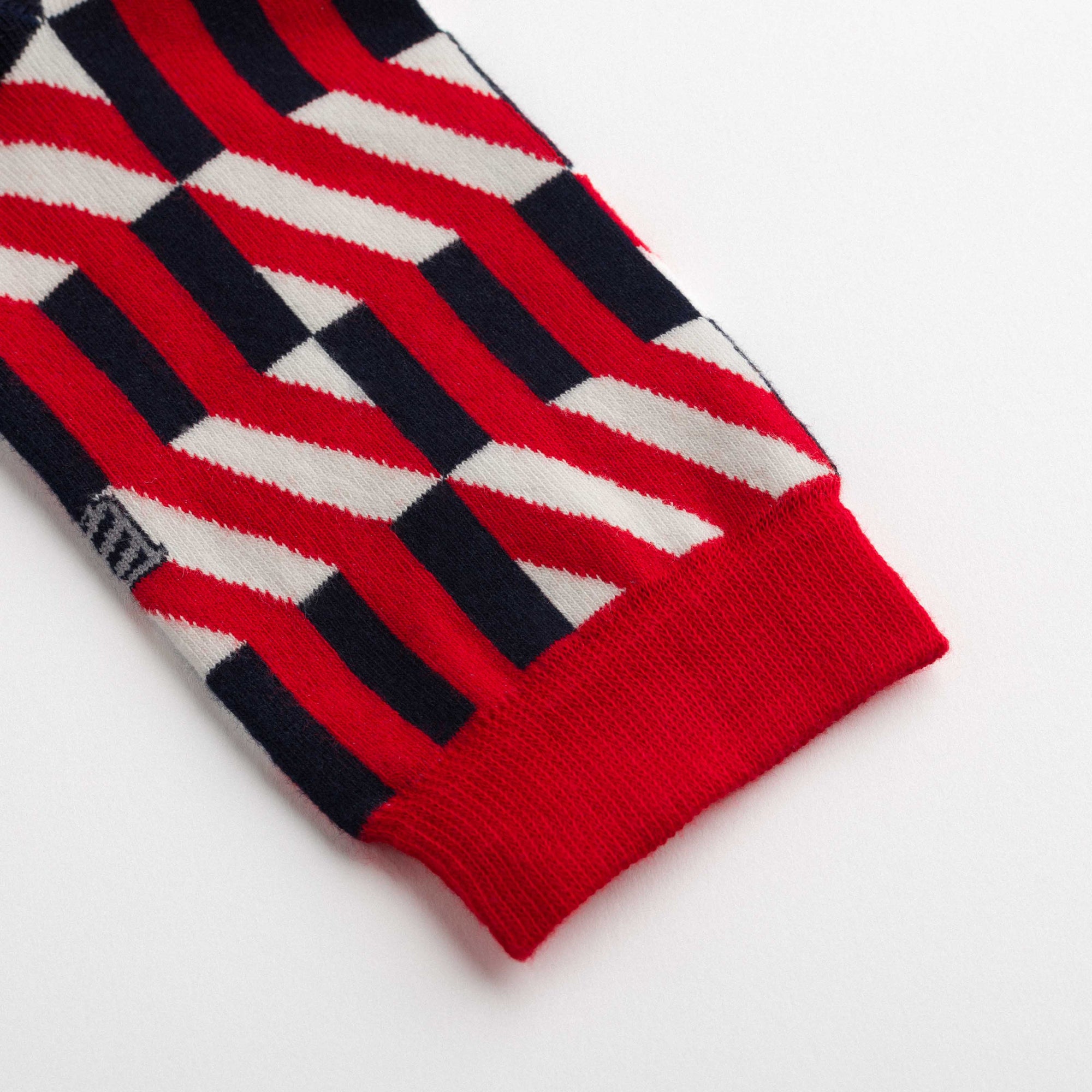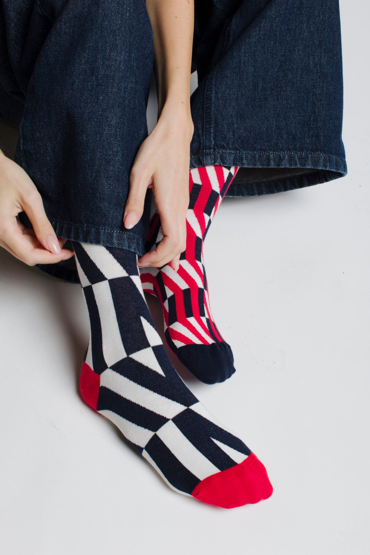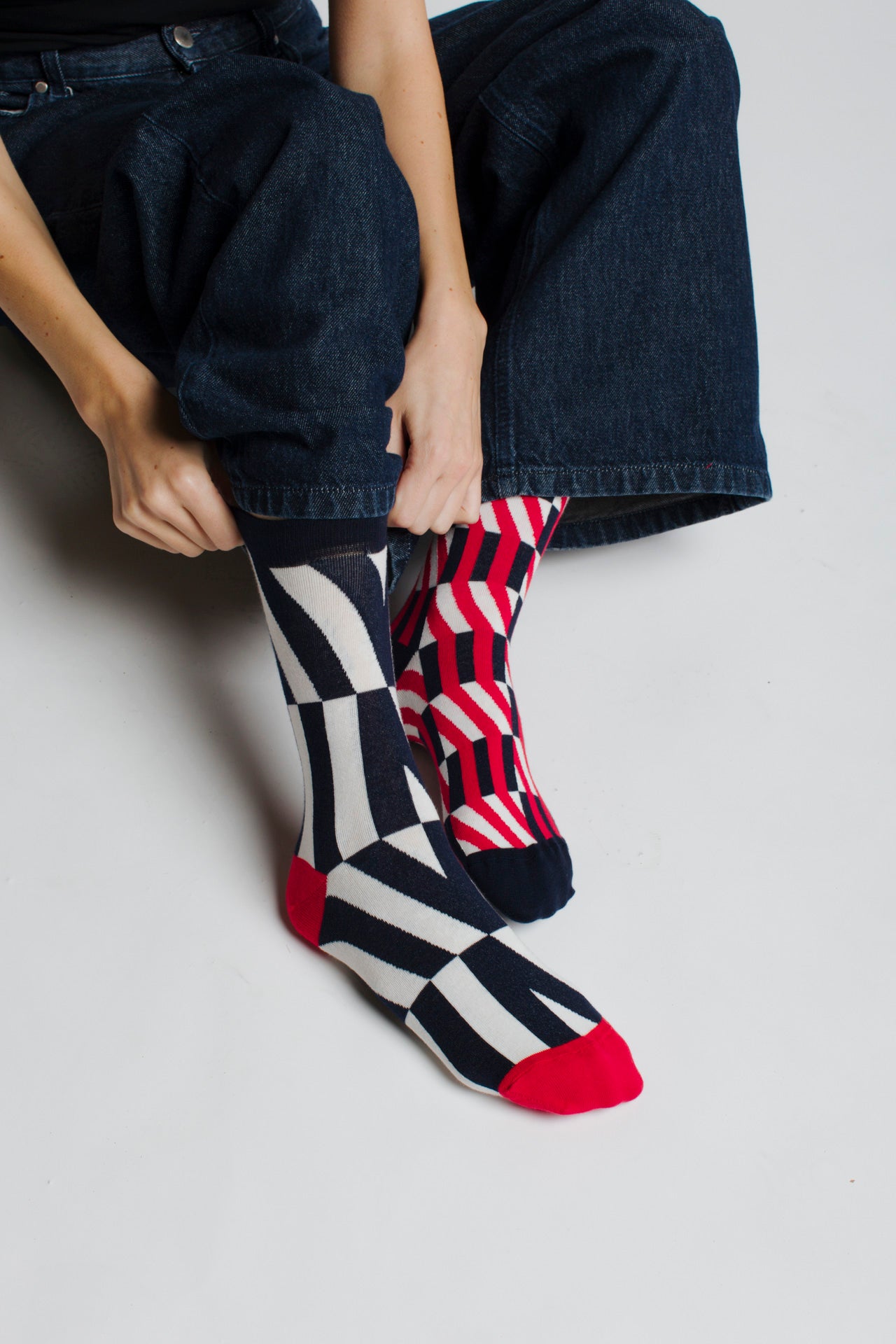 Ankle socks in cotton with bold diagonal and vertical stripes in red, navy and white. Asymmetrical pattern with differing stripe layouts and colour placement between the two socks, finished with contrasting red or navy toes. Made from 90% long-fibre cotton. Reinforced toe and heel and a flat-knit toe seam for enhanced comfort.