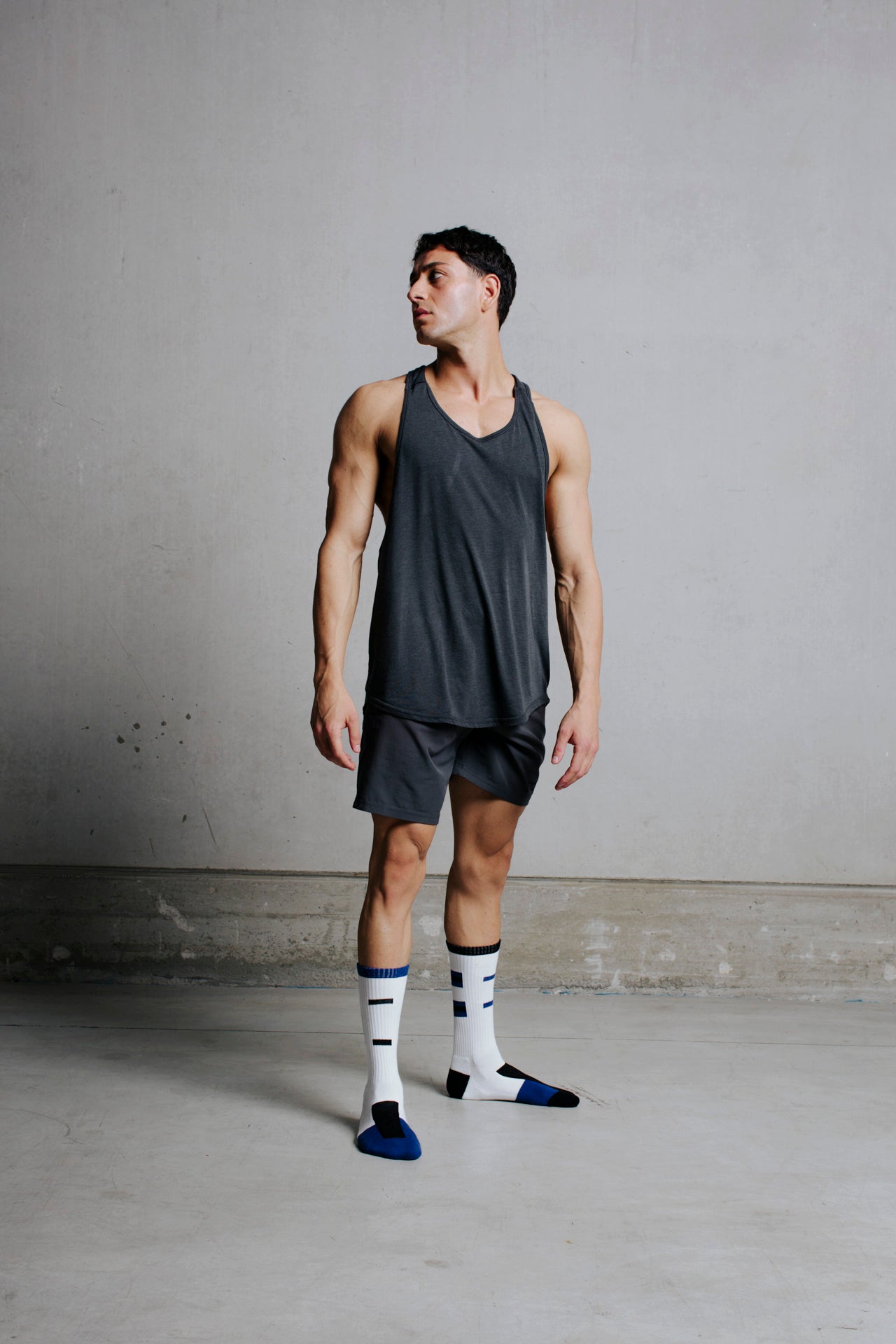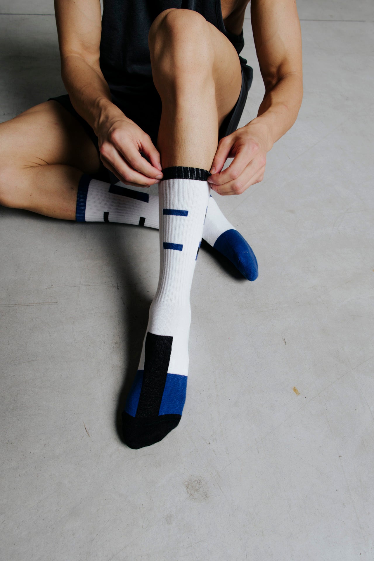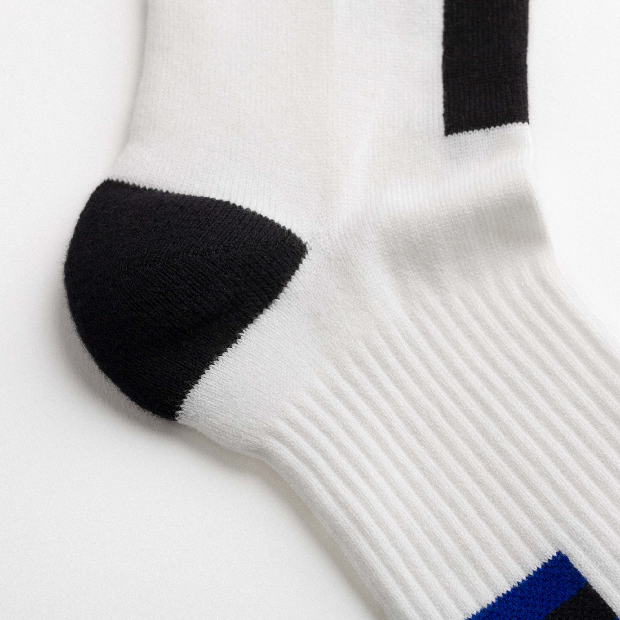 Ankle-length sports socks in terry cotton with a white base and green and black graphic inserts. Asymmetrical pattern created by the differing placement of coloured blocks between the two socks. Made from 90% long-fibre cotton. Reinforced toe and heel, flat-knit toe seam and wide toe and heel sections for enhanced comfort.