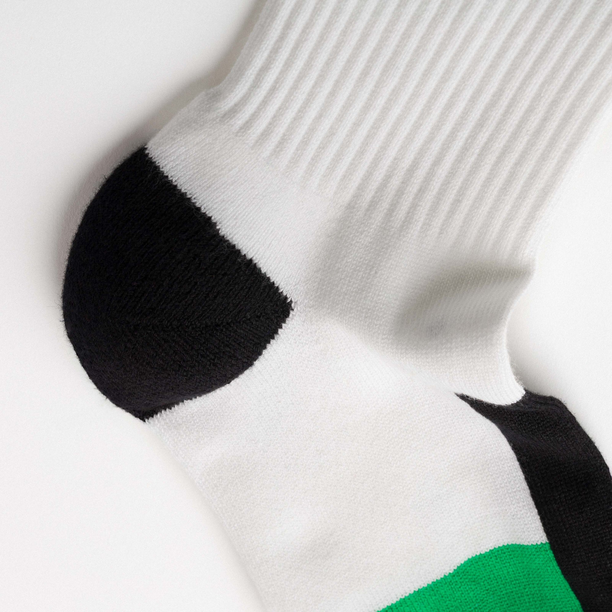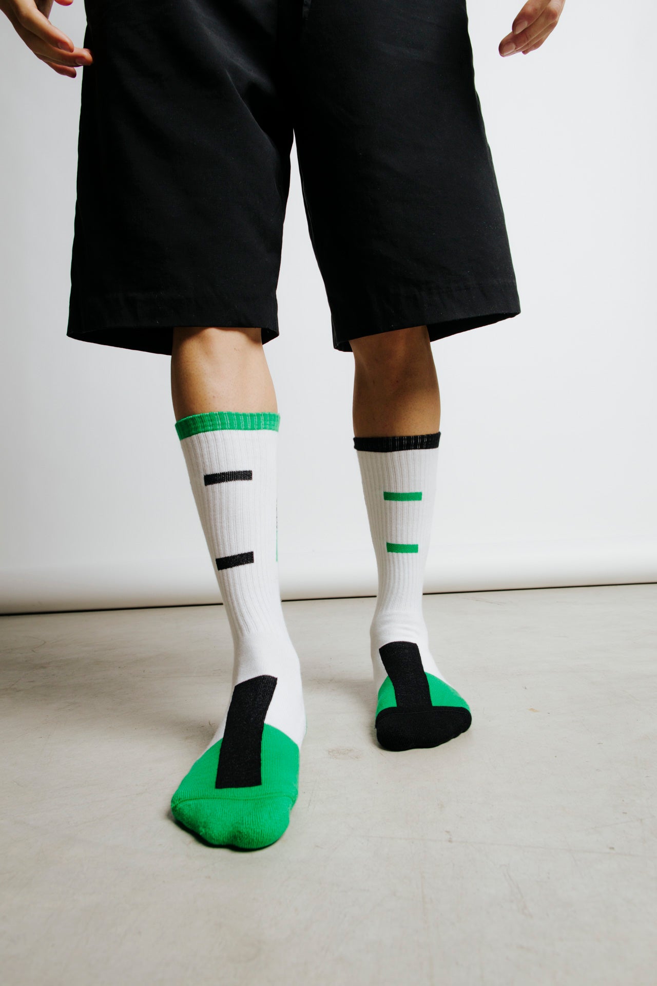 Ankle-length sports socks in terry cotton with a white base and green and black graphic inserts. Asymmetrical pattern created by the differing placement of coloured blocks between the two socks. Made from 90% long-fibre cotton. Reinforced toe and heel, flat-knit toe seam and wide toe and heel sections for enhanced comfort.