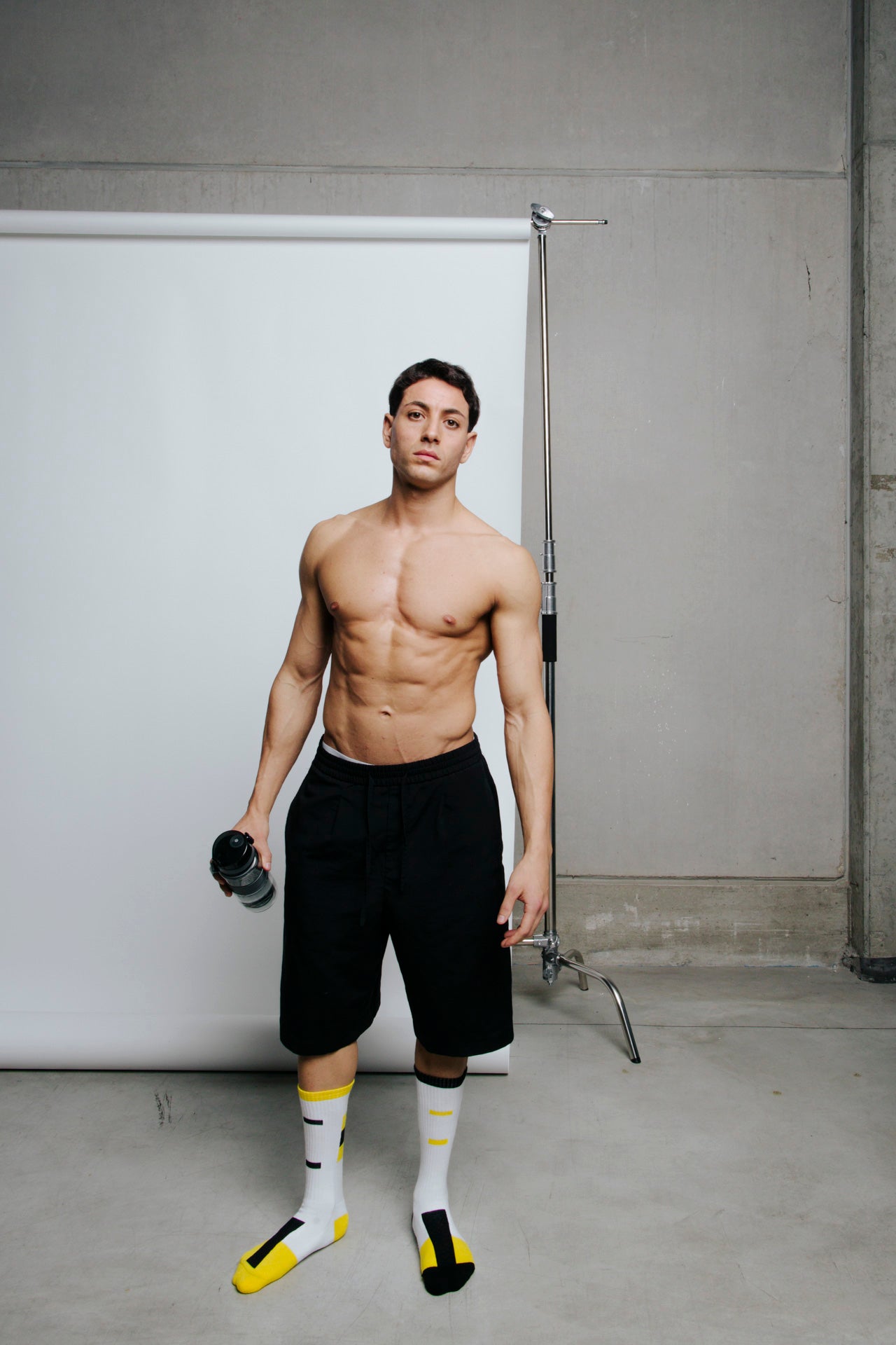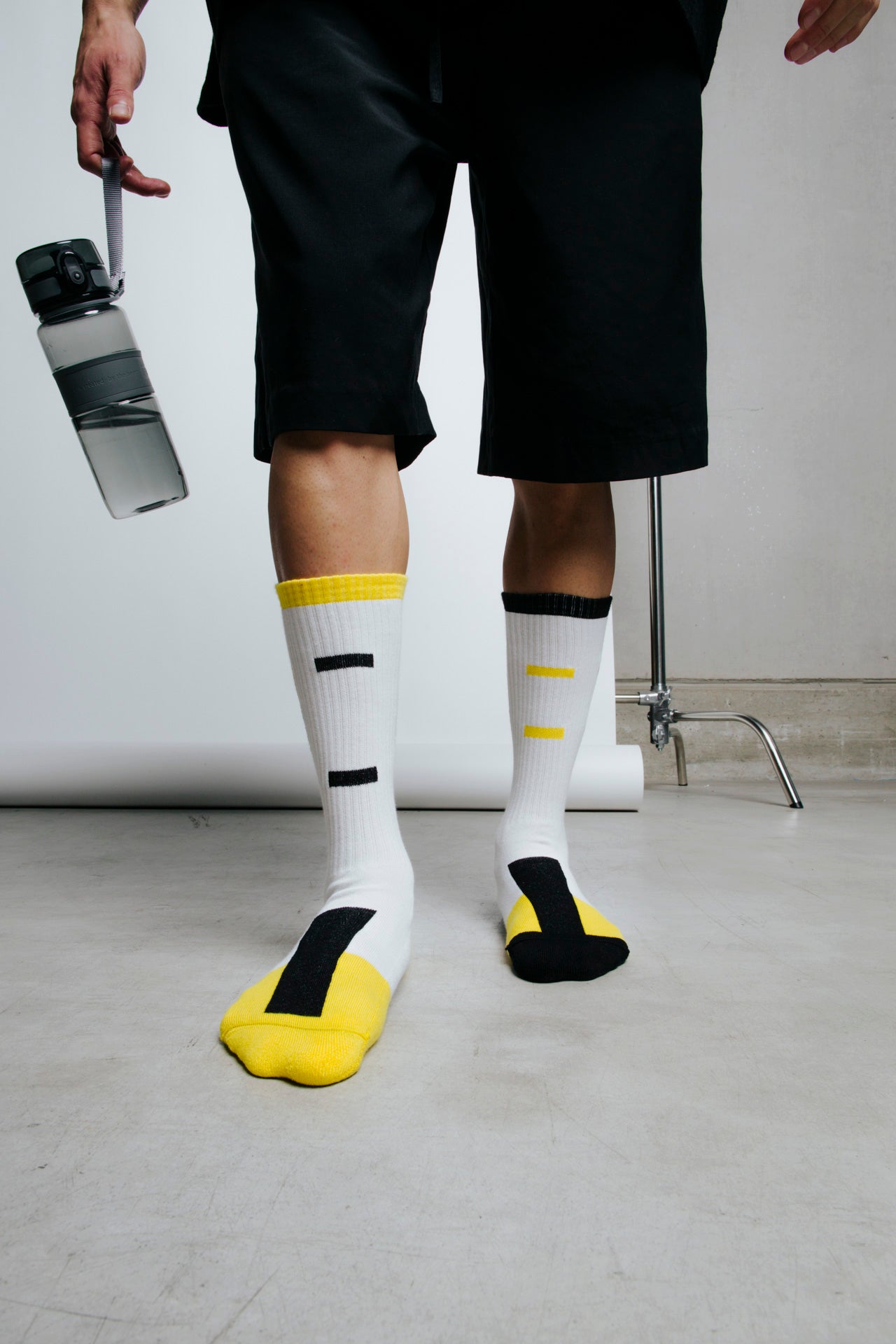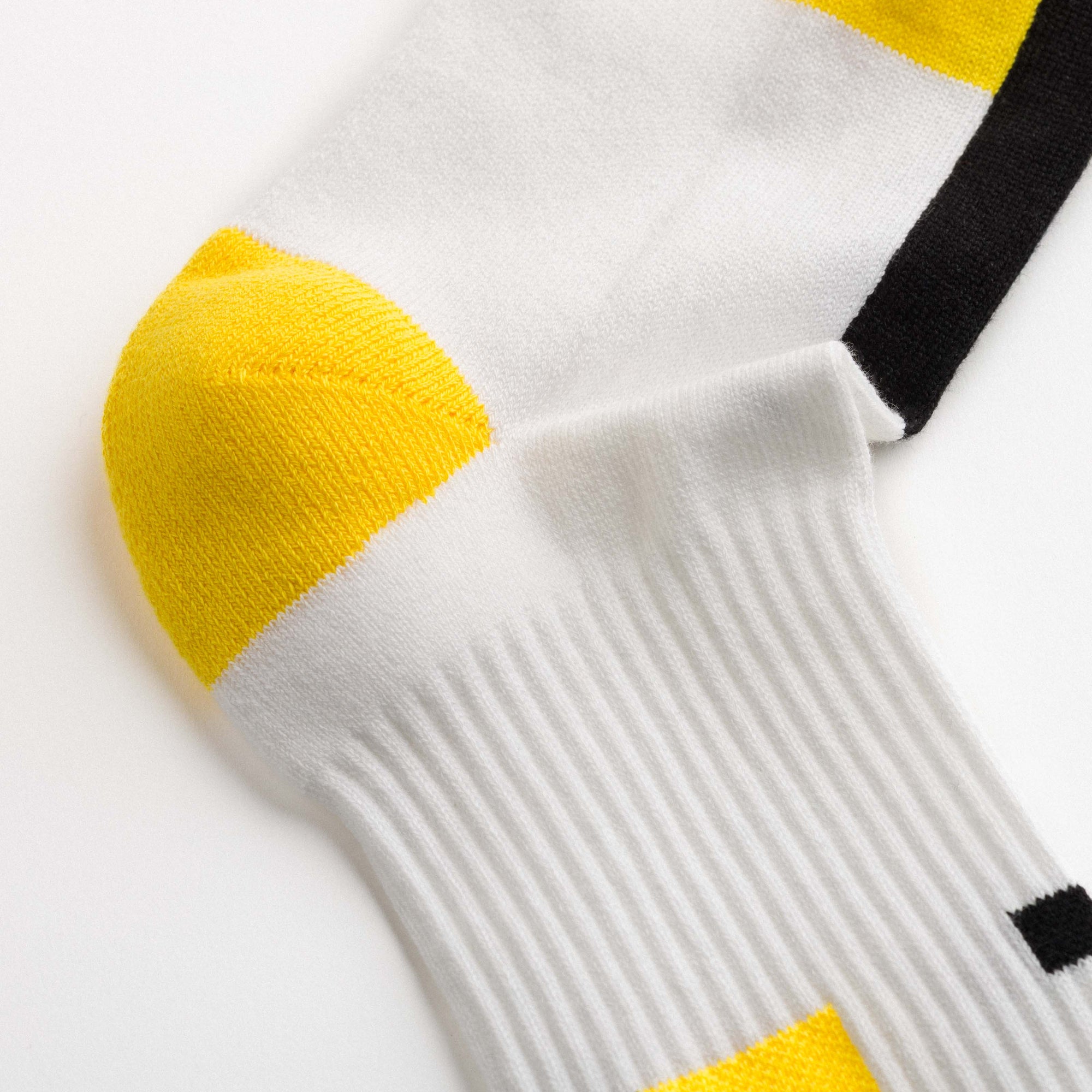 Ankle-length sports socks in terry cotton with a white base and yellow and black graphic inserts. Asymmetrical pattern created by the unique arrangement of coloured blocks between the two socks. Made from 90% long-fibre cotton. Reinforced toe and heel, flat-knit toe seam and wide toe and heel sections for enhanced comfort.