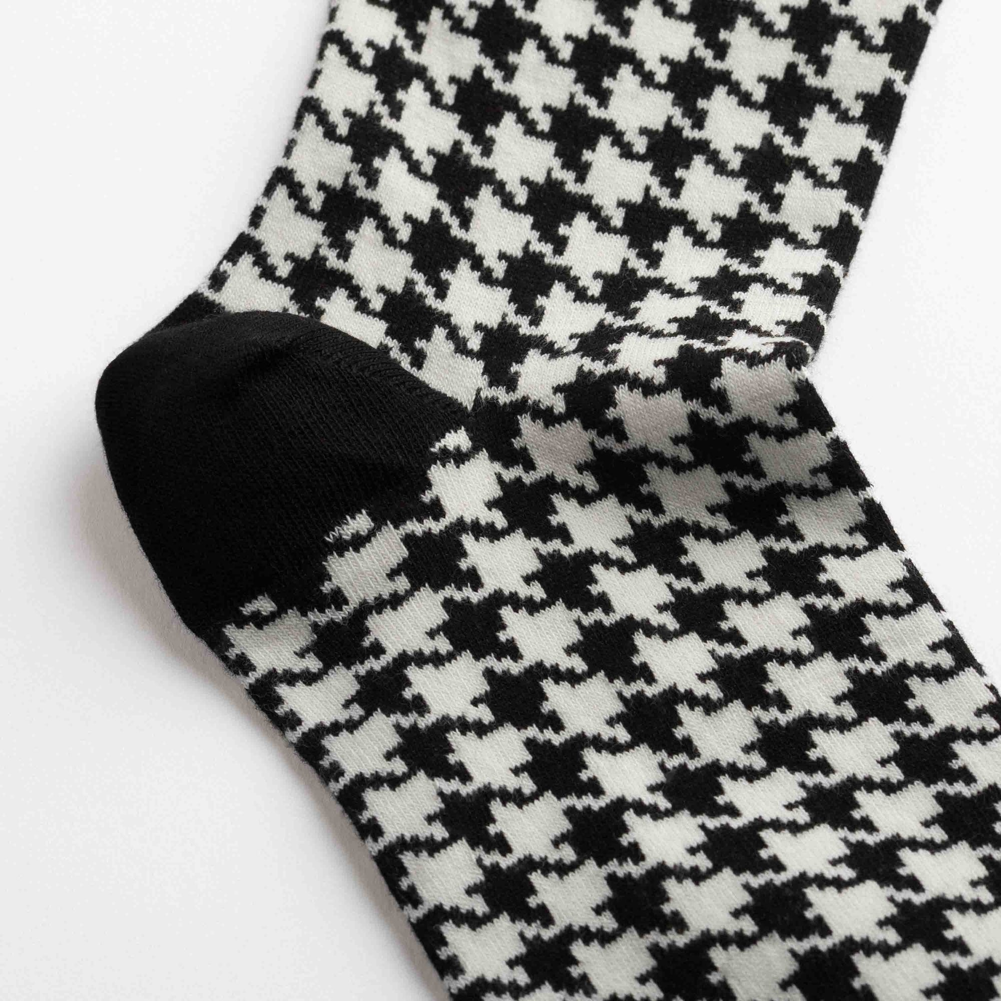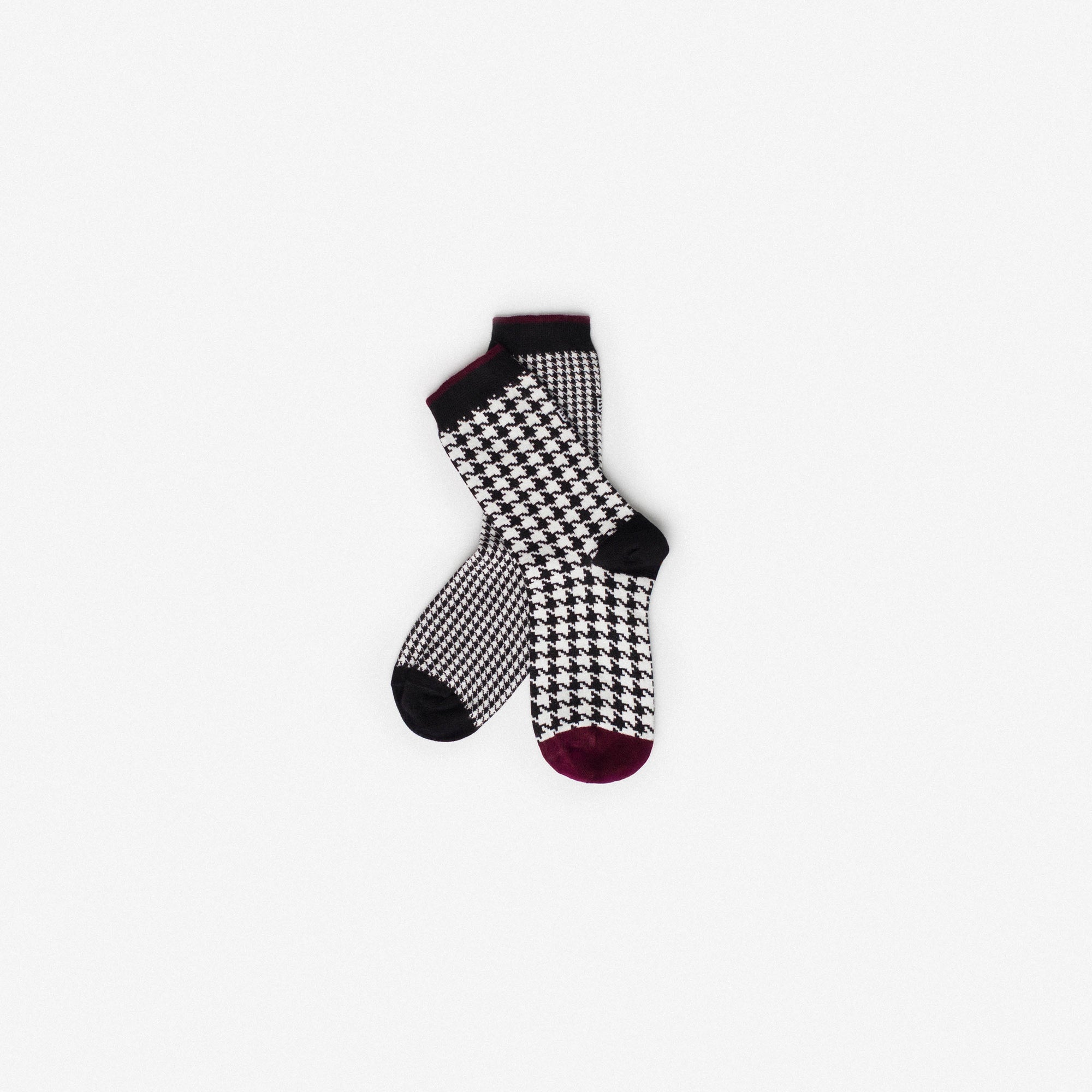 Ankle socks in cotton with black and white pied-de-poule motifs. Asymmetrical pattern with one sock featuring larger motifs and the other smaller, with alternating black and burgundy heel and toe colours. Made from long-fibre cotton. Reinforced toe and heel and a flat-knit toe seam for enhanced comfort.