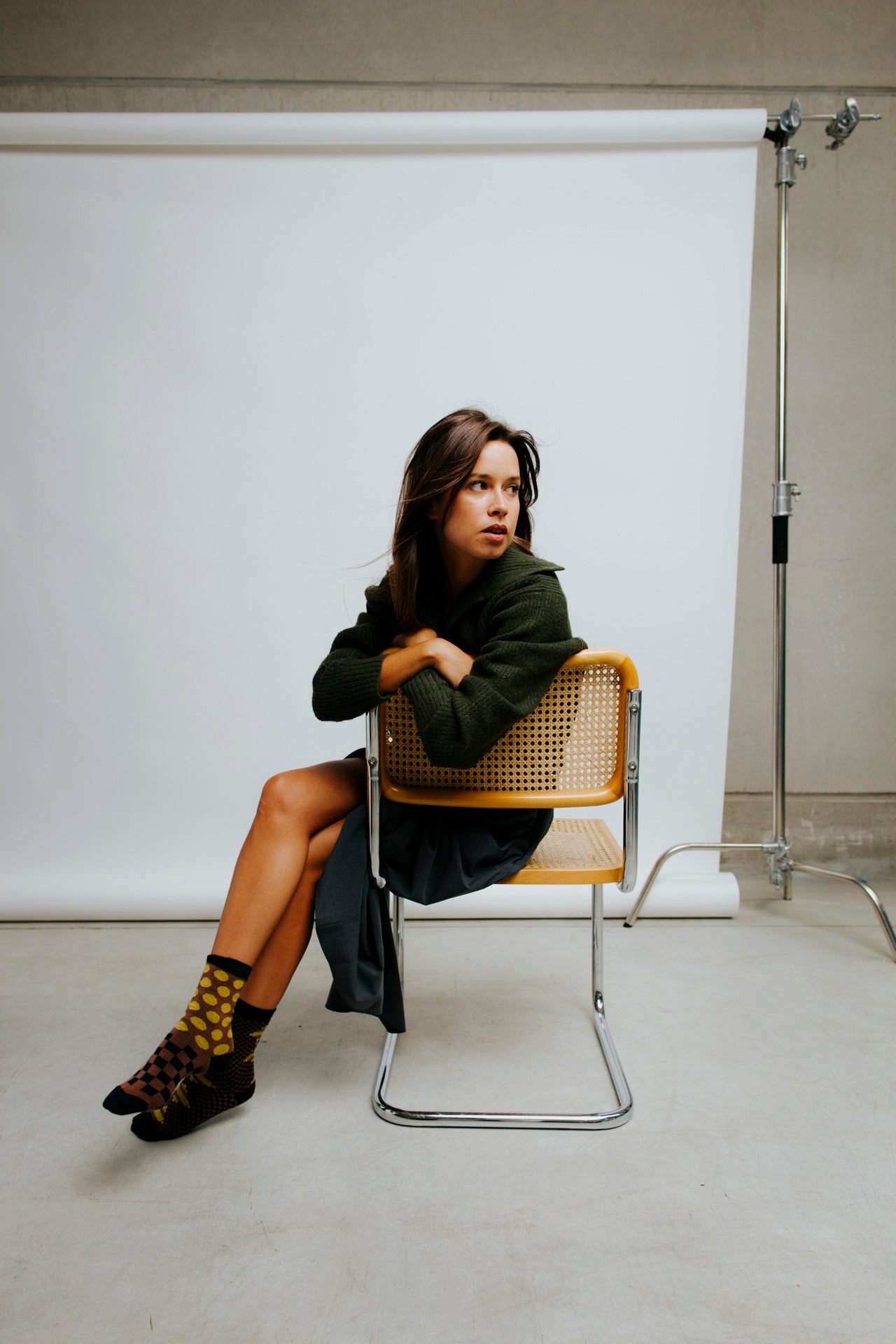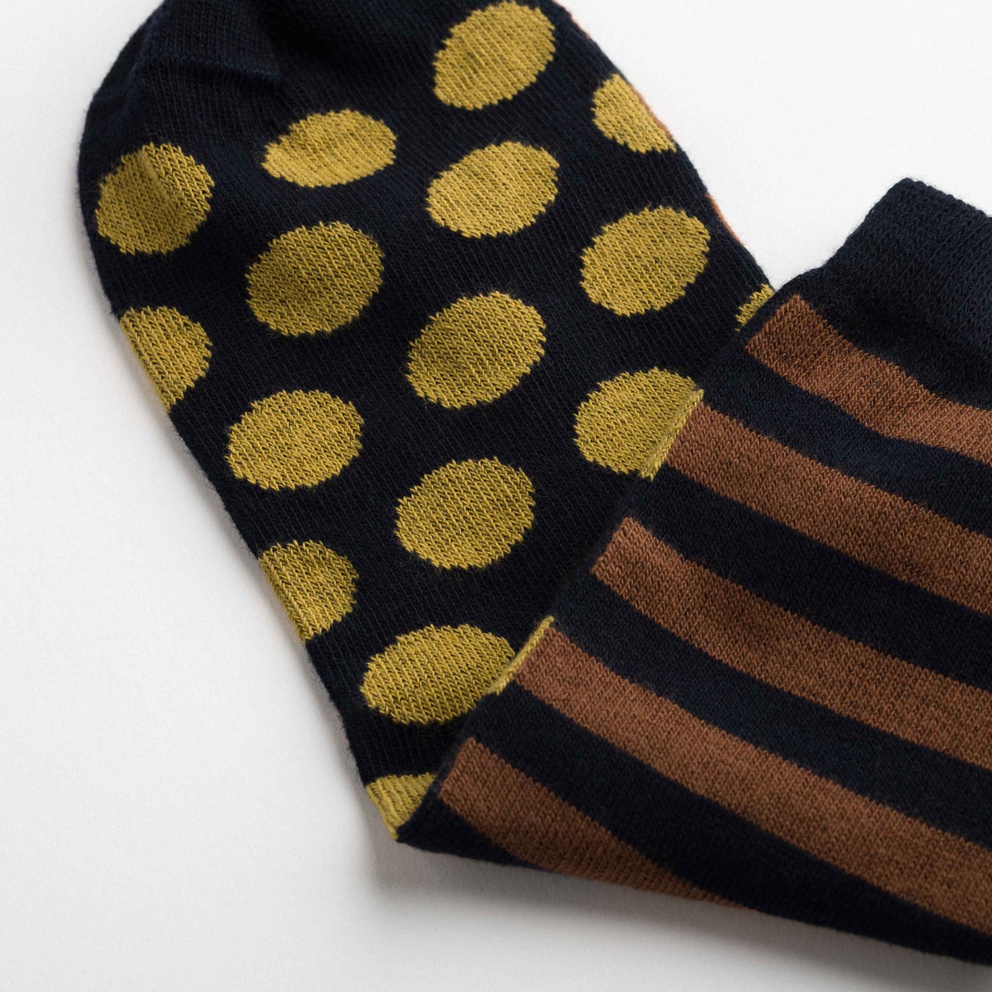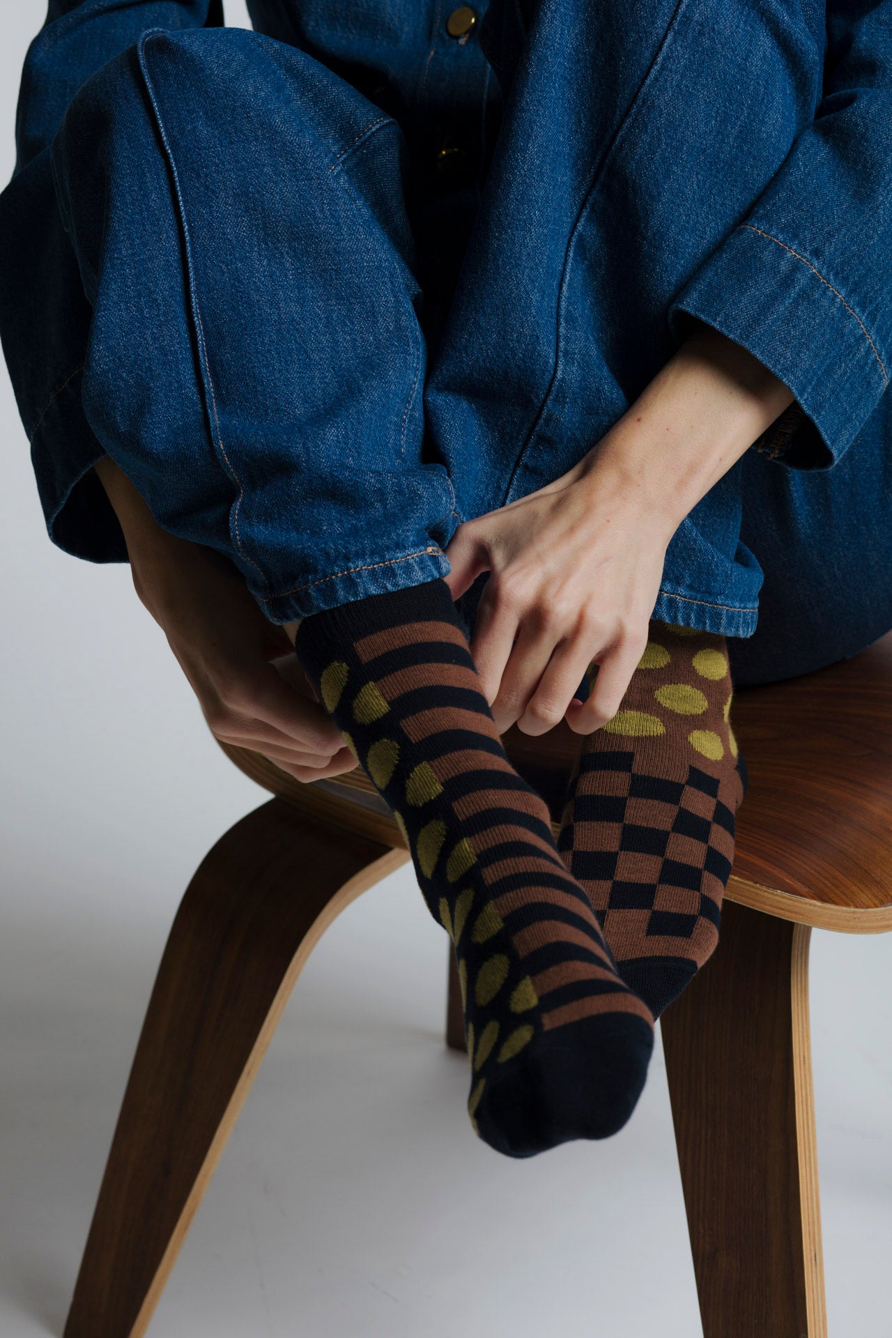 Set of five ankle socks in cotton with brown, khaki and black geometric motifs including dots, stripes and squares. Asymmetrical construction with each sock featuring a unique design for mix-and-match combinations. Made from long-fibre cotton. Reinforced toe and heel, flat-knit toe seam and wide toe and heel sections for enhanced comfort.