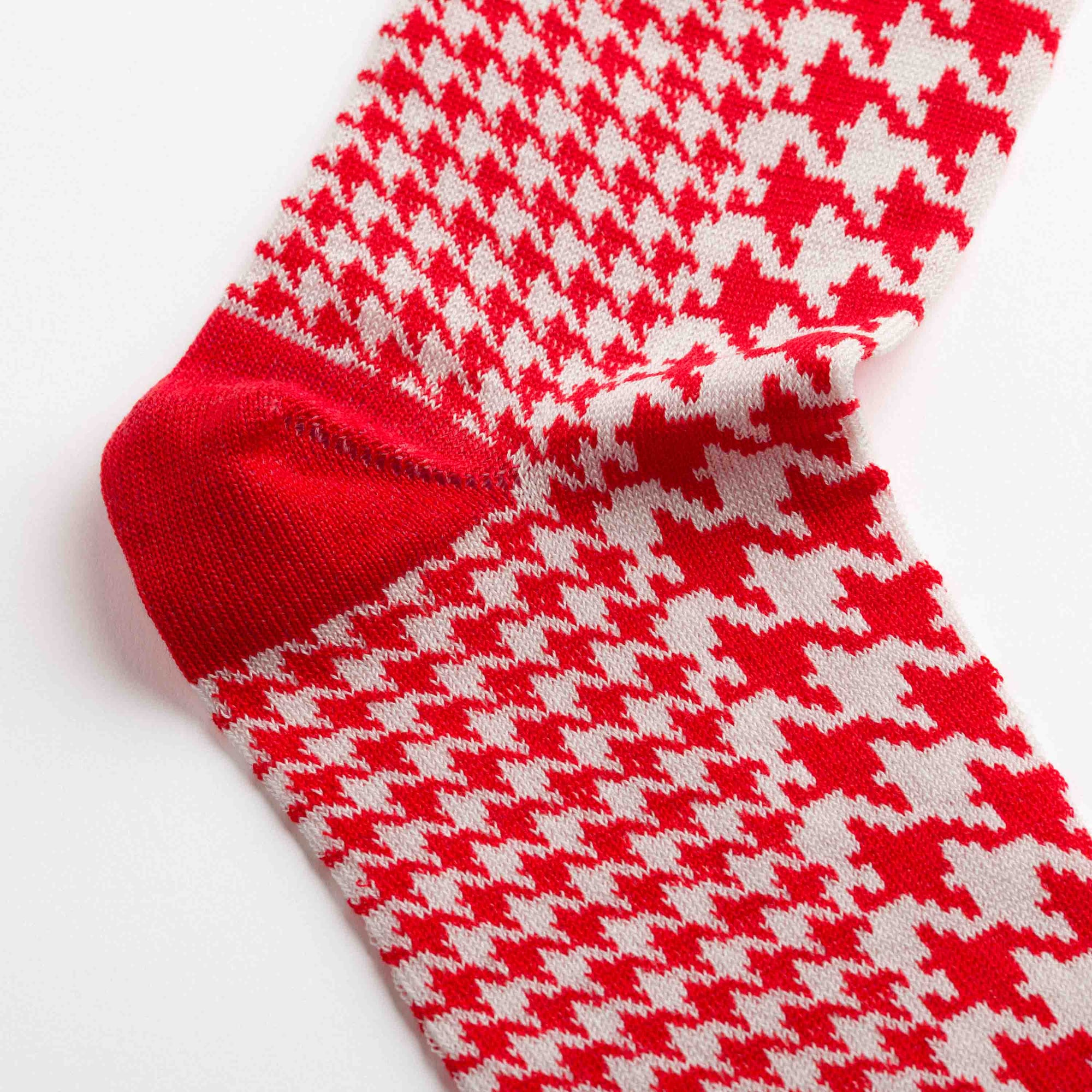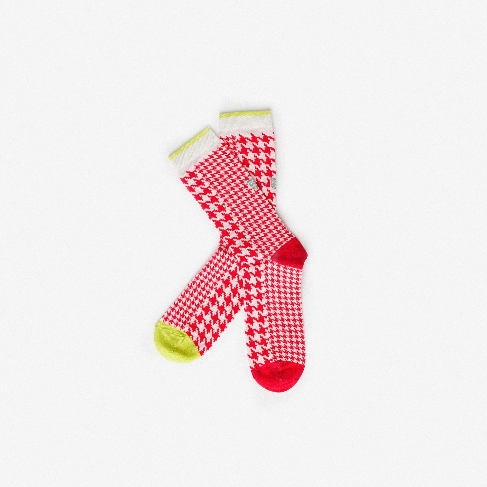 Ankle socks in cotton with red and white pied-de-poule motifs and a lime-green cuff. Asymmetrical pattern with one sock featuring larger motifs and the other smaller, and reversed toe colours in red and green. Made from long-fibre cotton. Reinforced toe and heel, flat-knit toe seam and wide toe and heel sections for enhanced comfort.