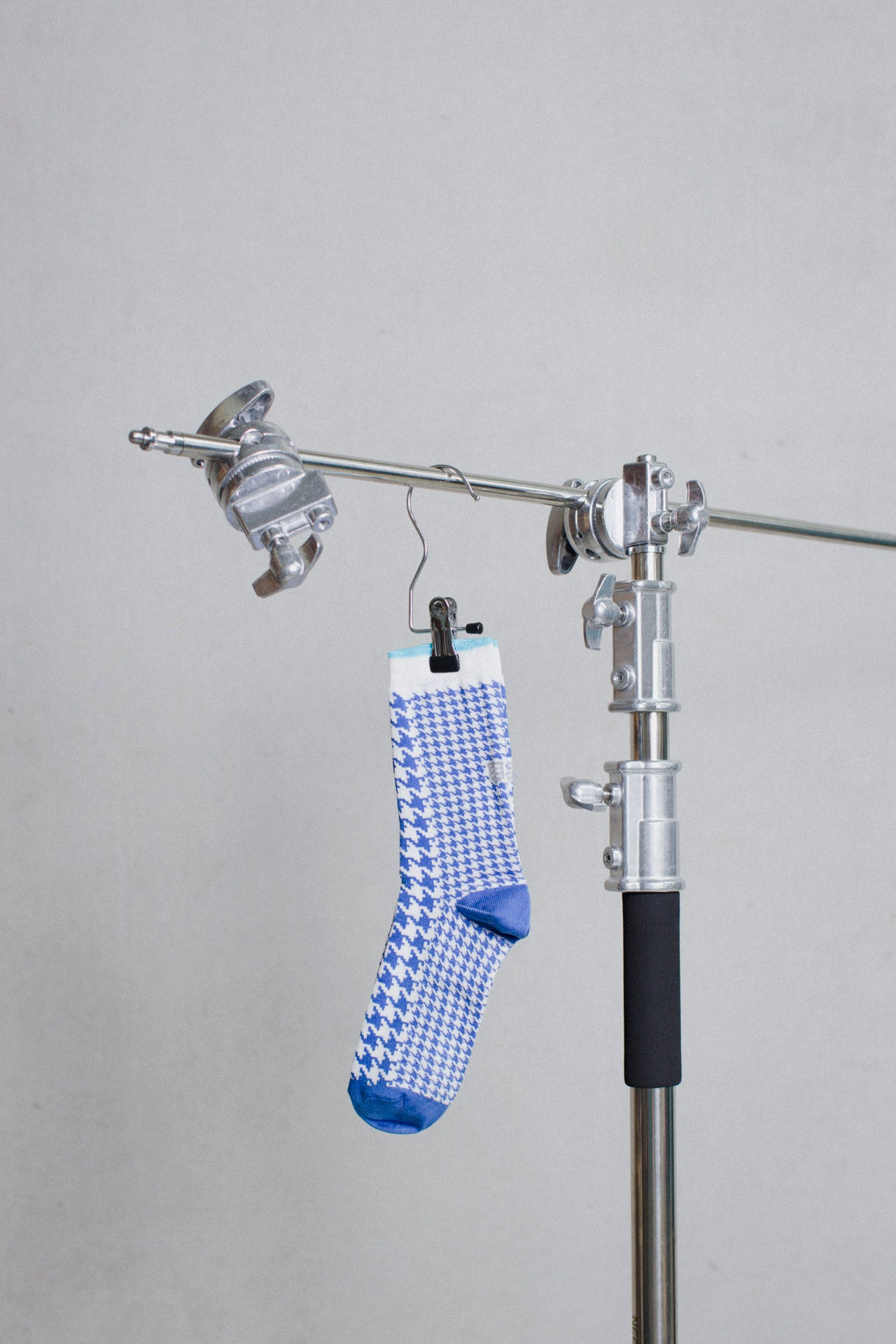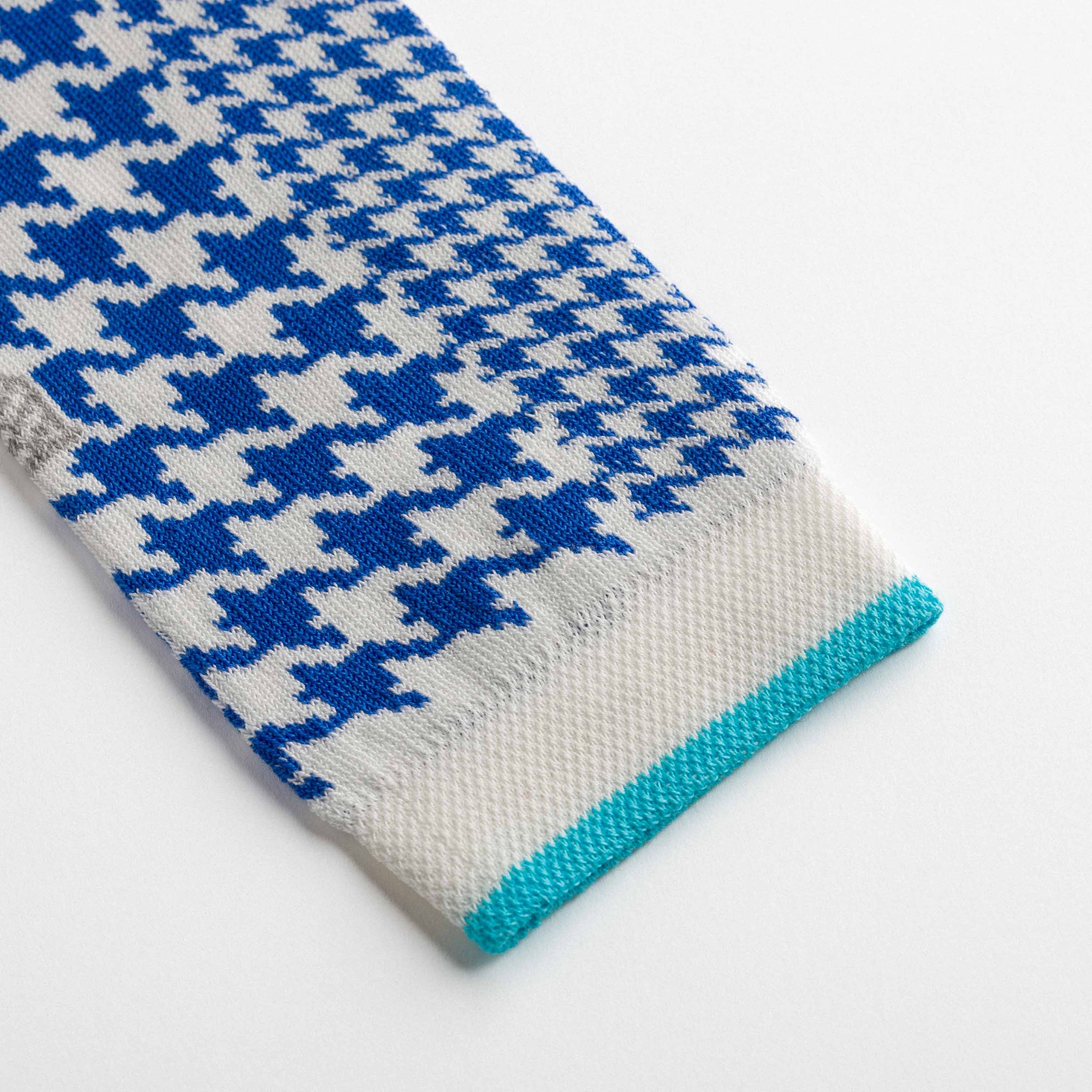 Ankle socks in cotton with blue and white pied-de-poule motifs and a sky-blue cuff. Asymmetrical pattern with one sock featuring larger motifs and the other smaller, and reversed toe colours in blue and sky-blue. Made from long-fibre cotton. Reinforced toe and heel, flat-knit toe seam and wide toe and heel sections for enhanced comfort.