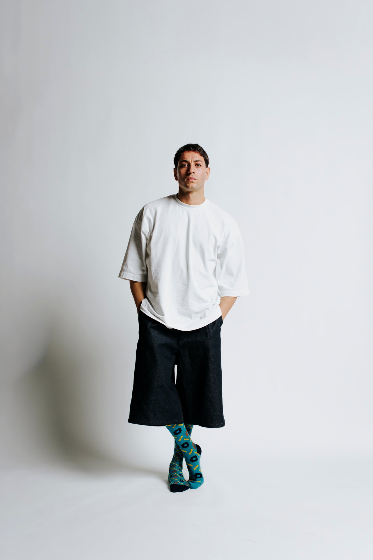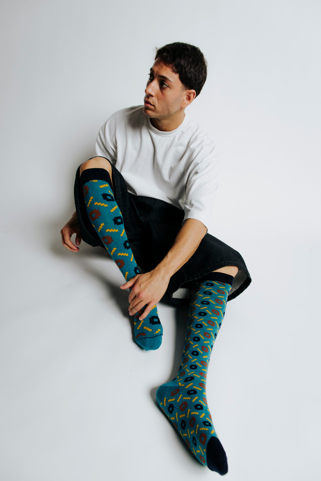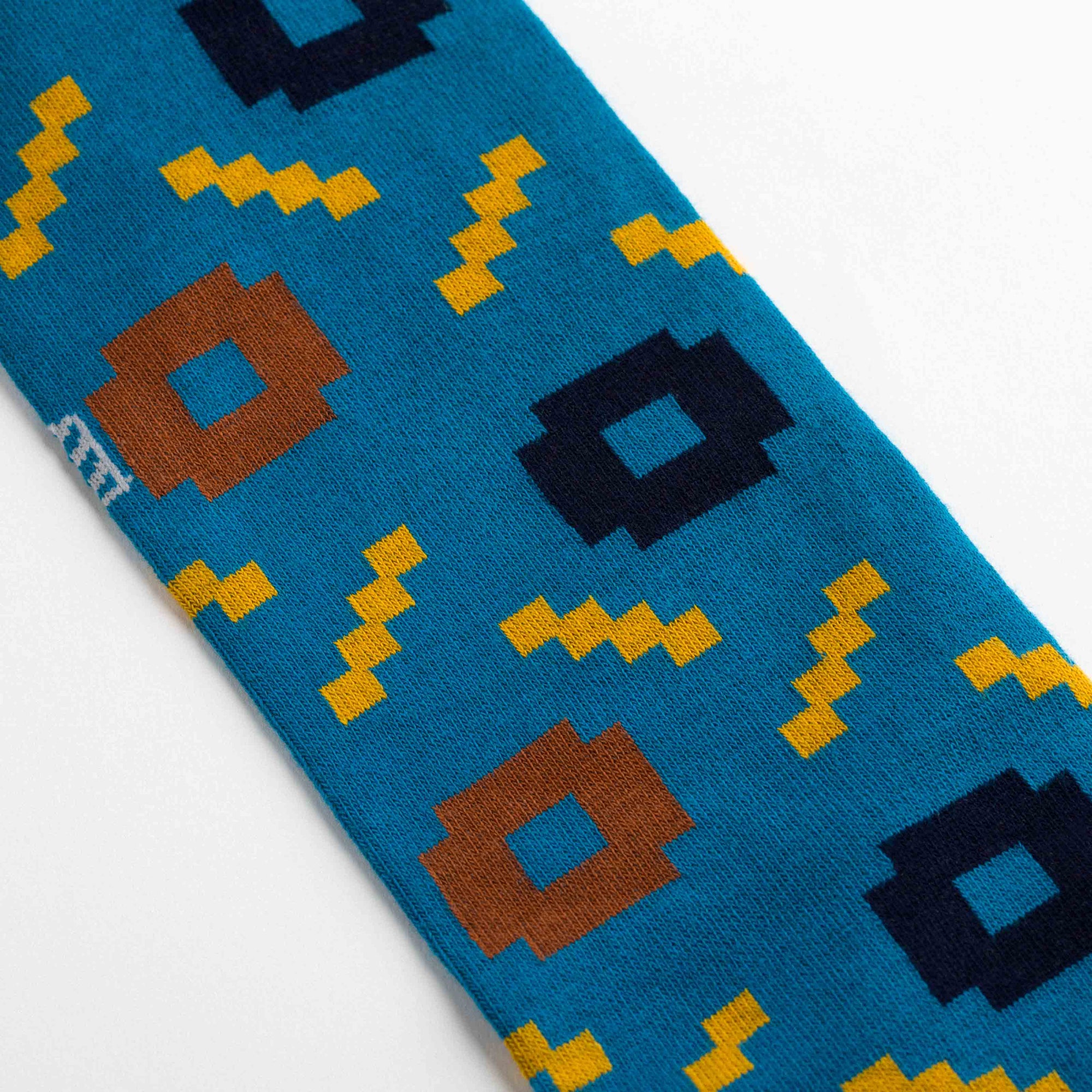 Knee-high socks in cerulean blue with pixelated circle and stripe motifs in ochre, brown and navy. Asymmetrical pattern with differing motif sizes between the two socks. Made from 90% long-fibre cotton. Reinforced toe and heel, flat-knit toe seam and wide toe and heel sections for enhanced comfort.
