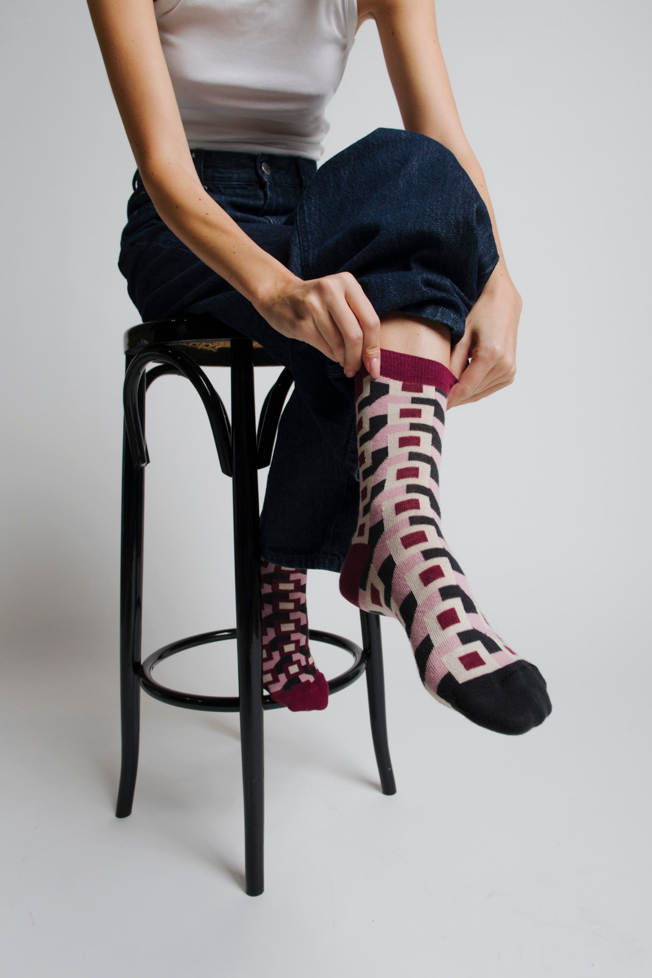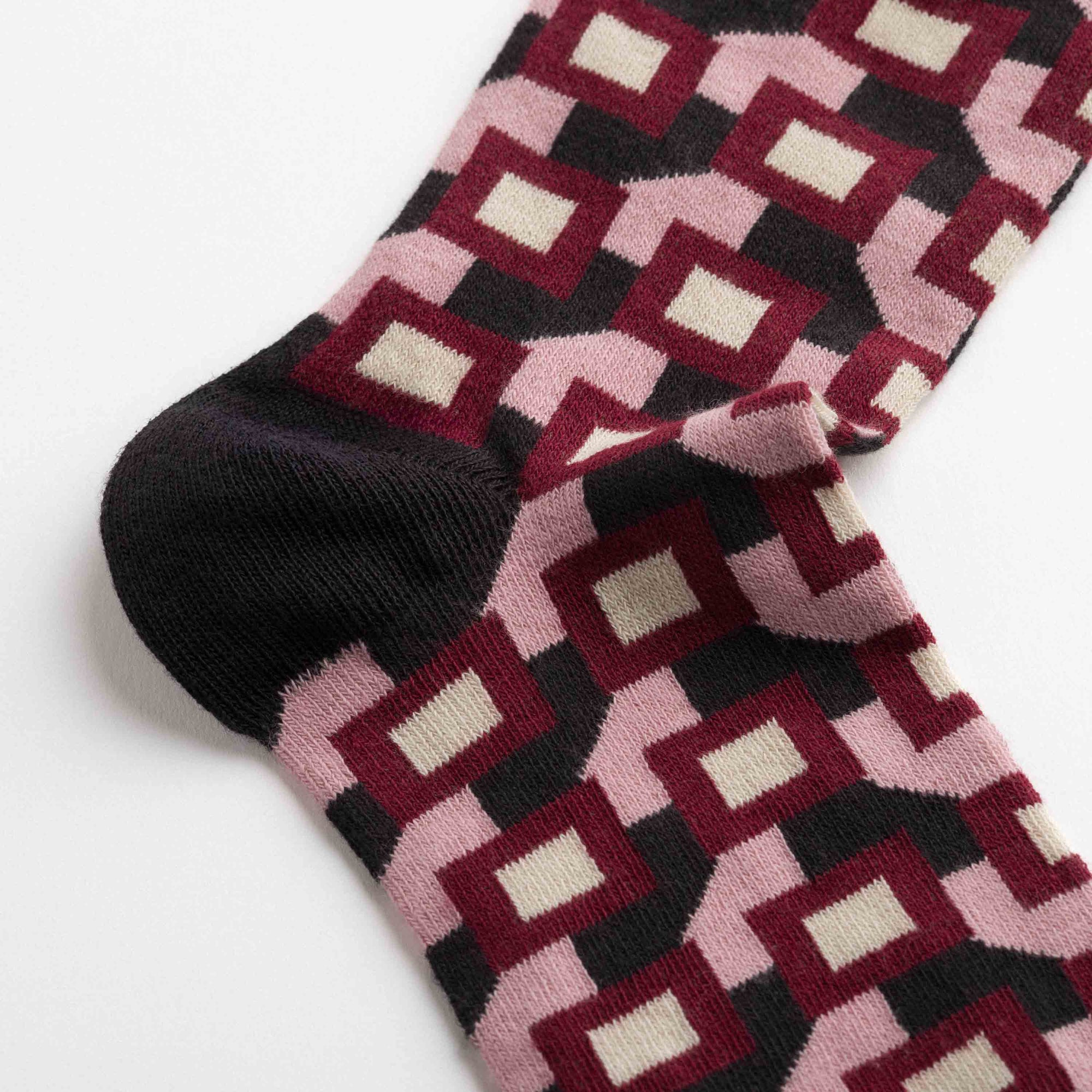 Ankle socks in cotton with geometric motifs in burgundy, black, pink and cream inspired by squares and cubes. Asymmetrical pattern with colour inversions between the two socks. Made from long-fibre cotton. Reinforced toe and heel, flat-knit toe seam and wide toe and heel sections for enhanced comfort.