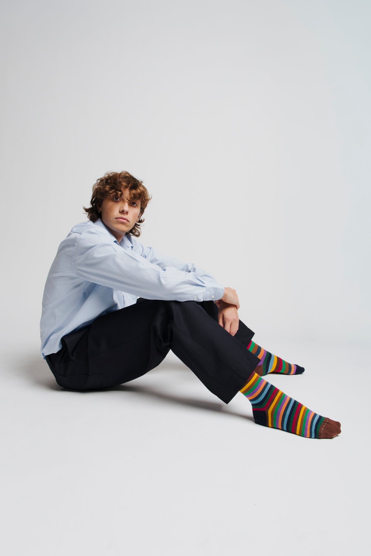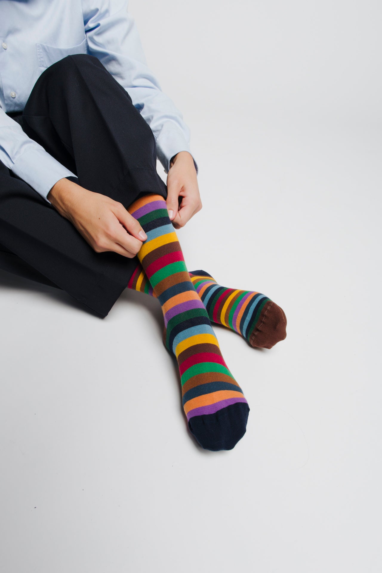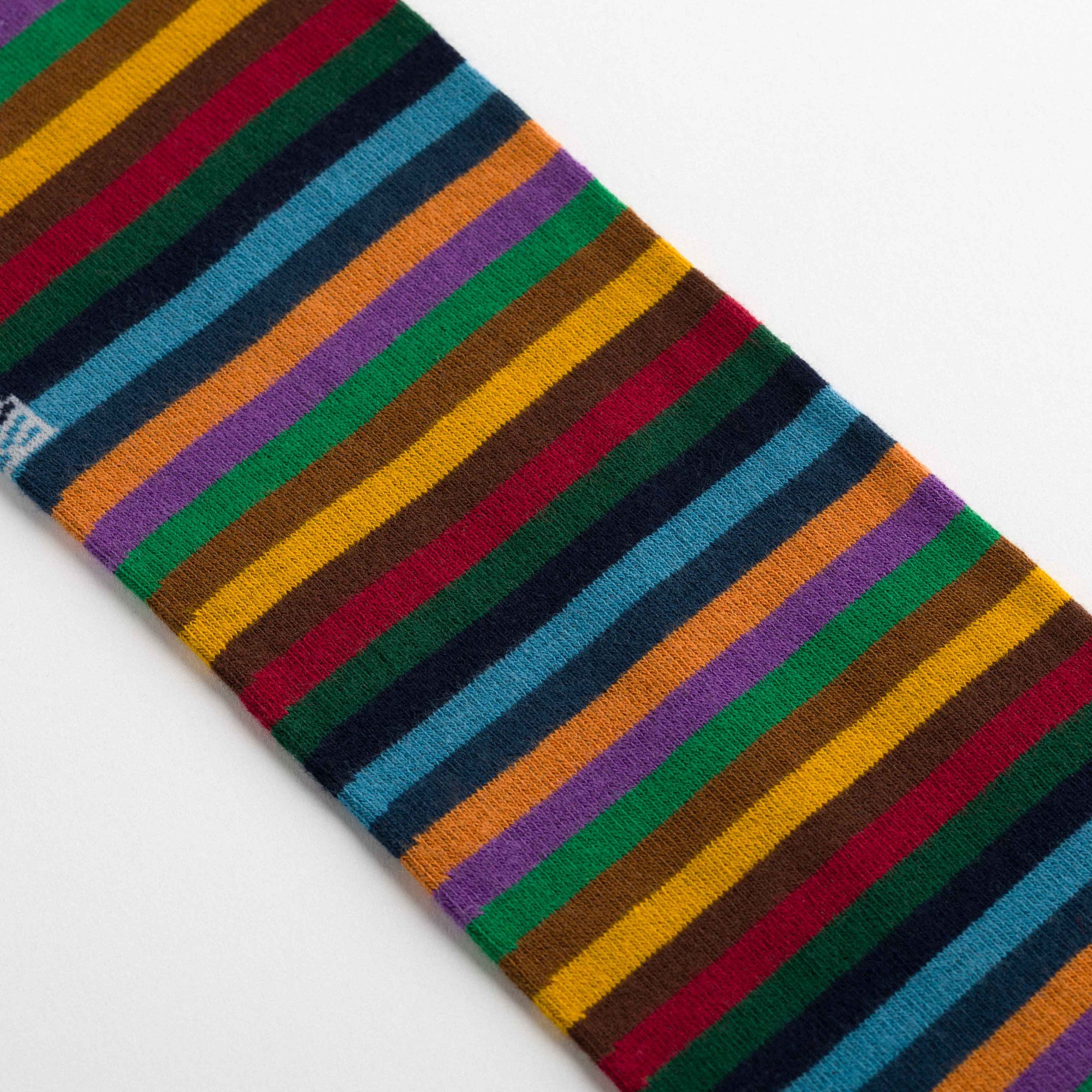 Knee-high socks in cotton with multicolour stripes. Asymmetrical pattern with varying stripe widths between the two socks and contrasting cuff colours in blue and brown. Made from 90% long-fibre cotton. Reinforced toe and heel, flat-knit toe seam and wide toe and heel sections for enhanced comfort.