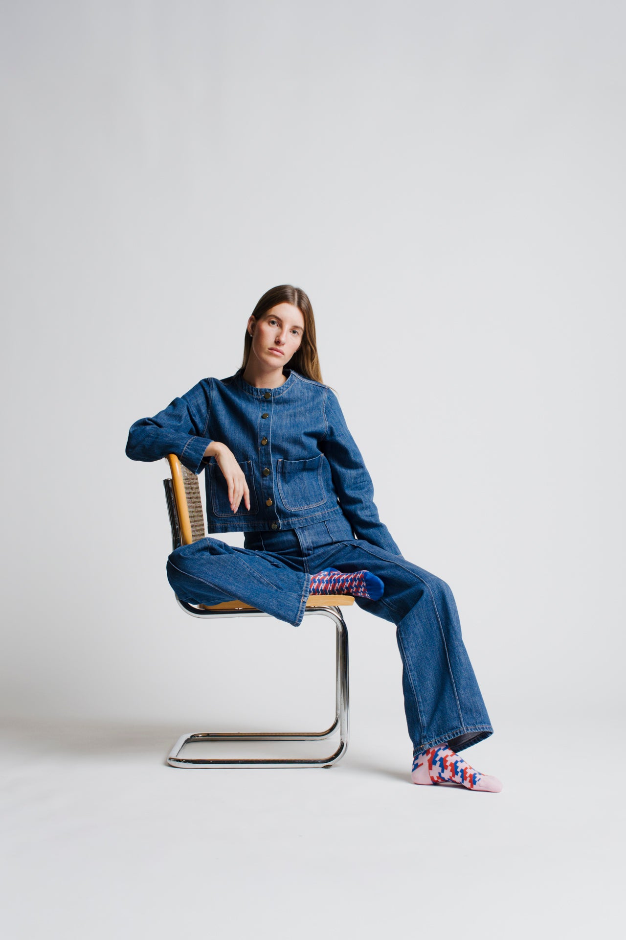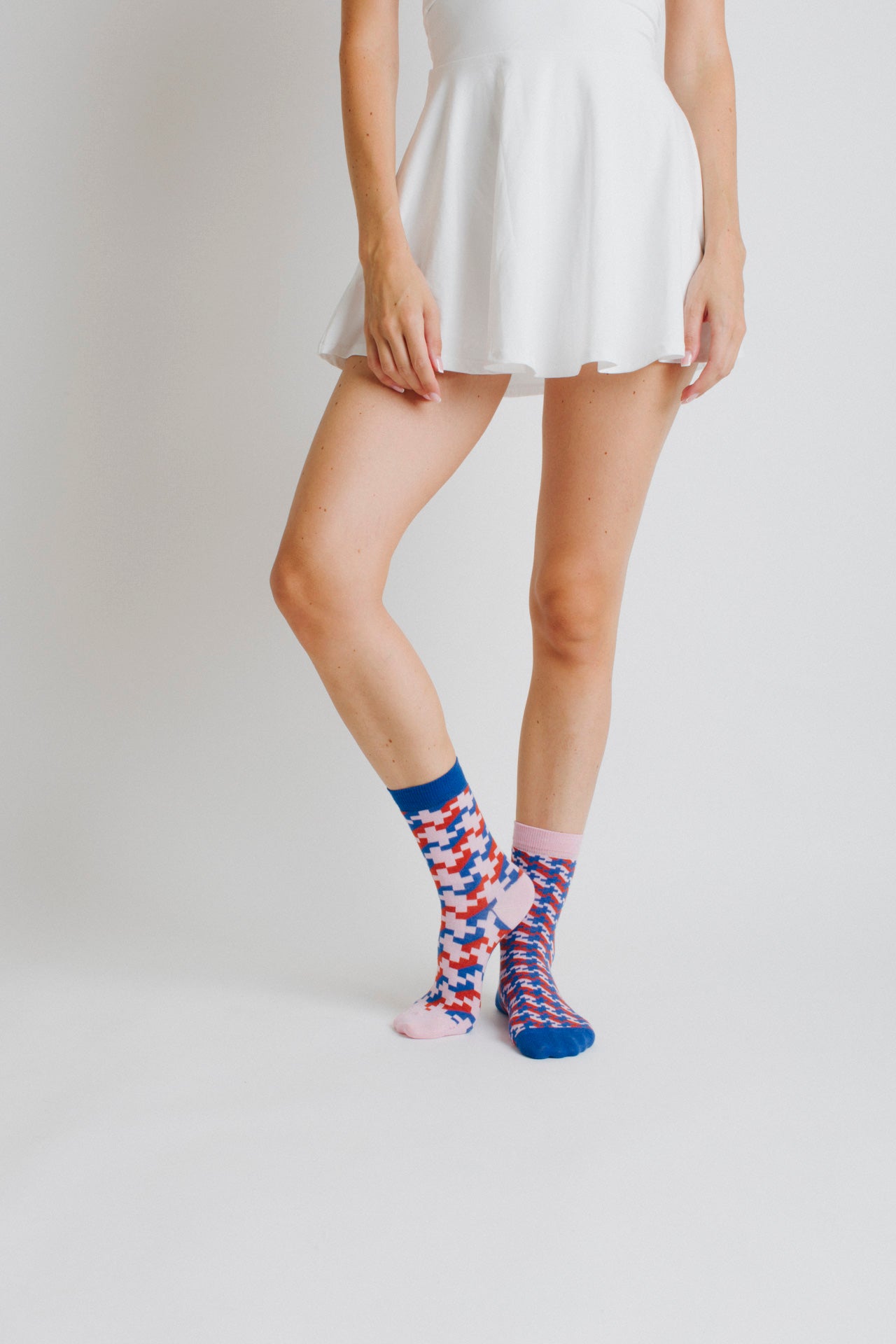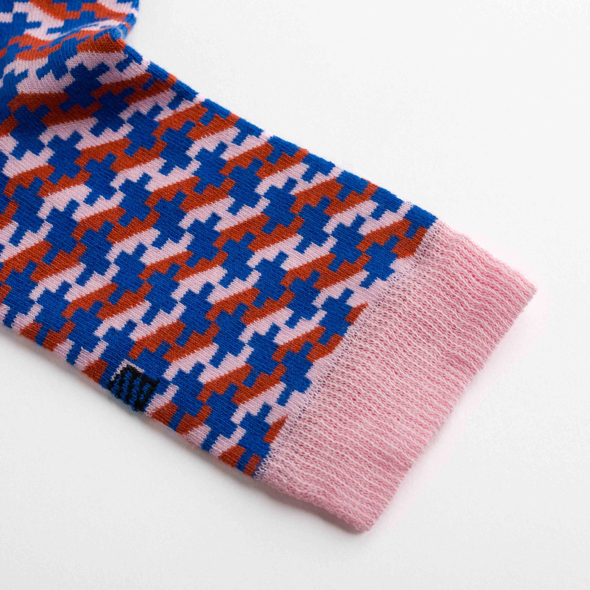 Ankle socks in cotton with pink, blue and red oblique stripes and geometric motifs. Asymmetrical pattern with one sock featuring enlarged motifs and the other smaller.