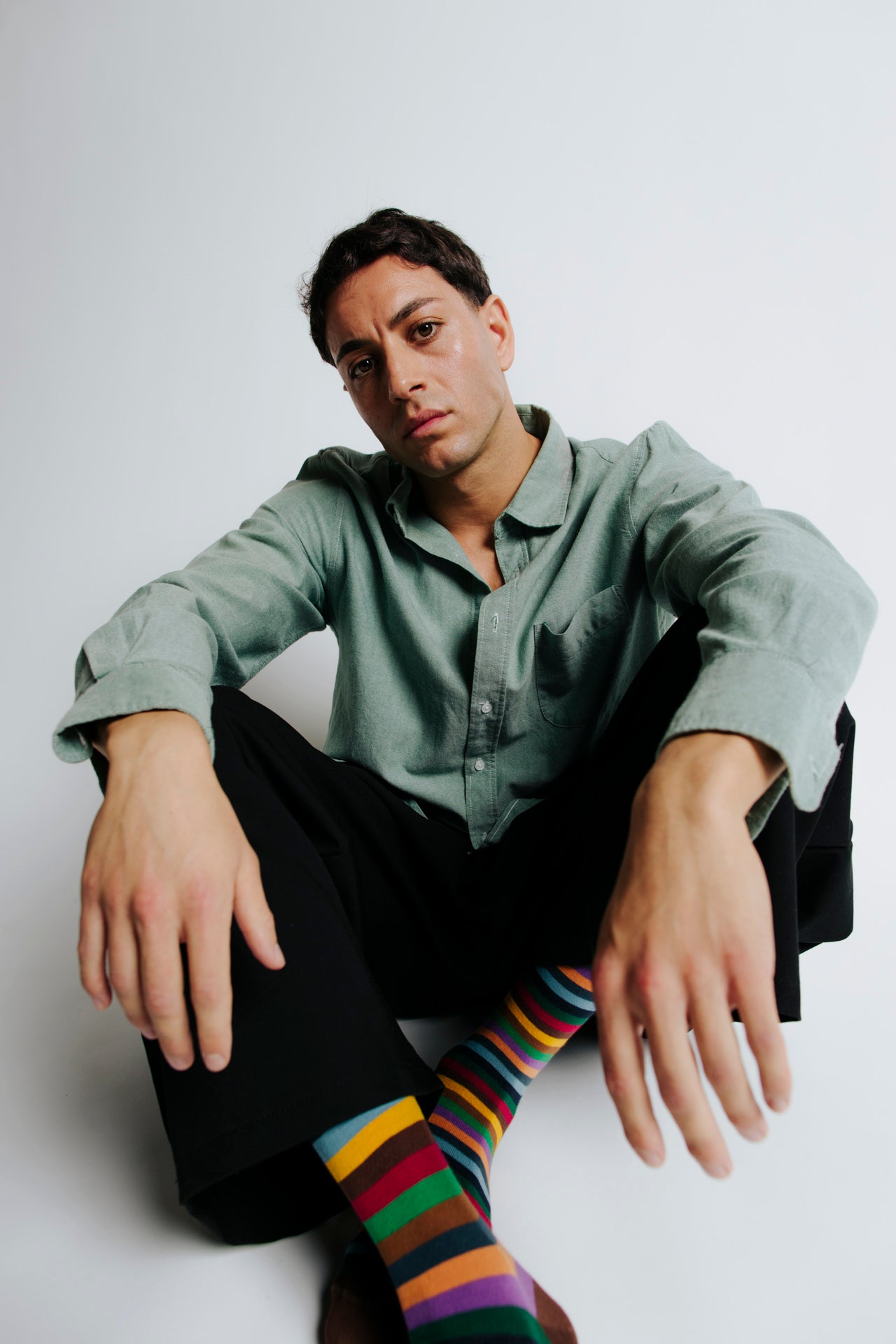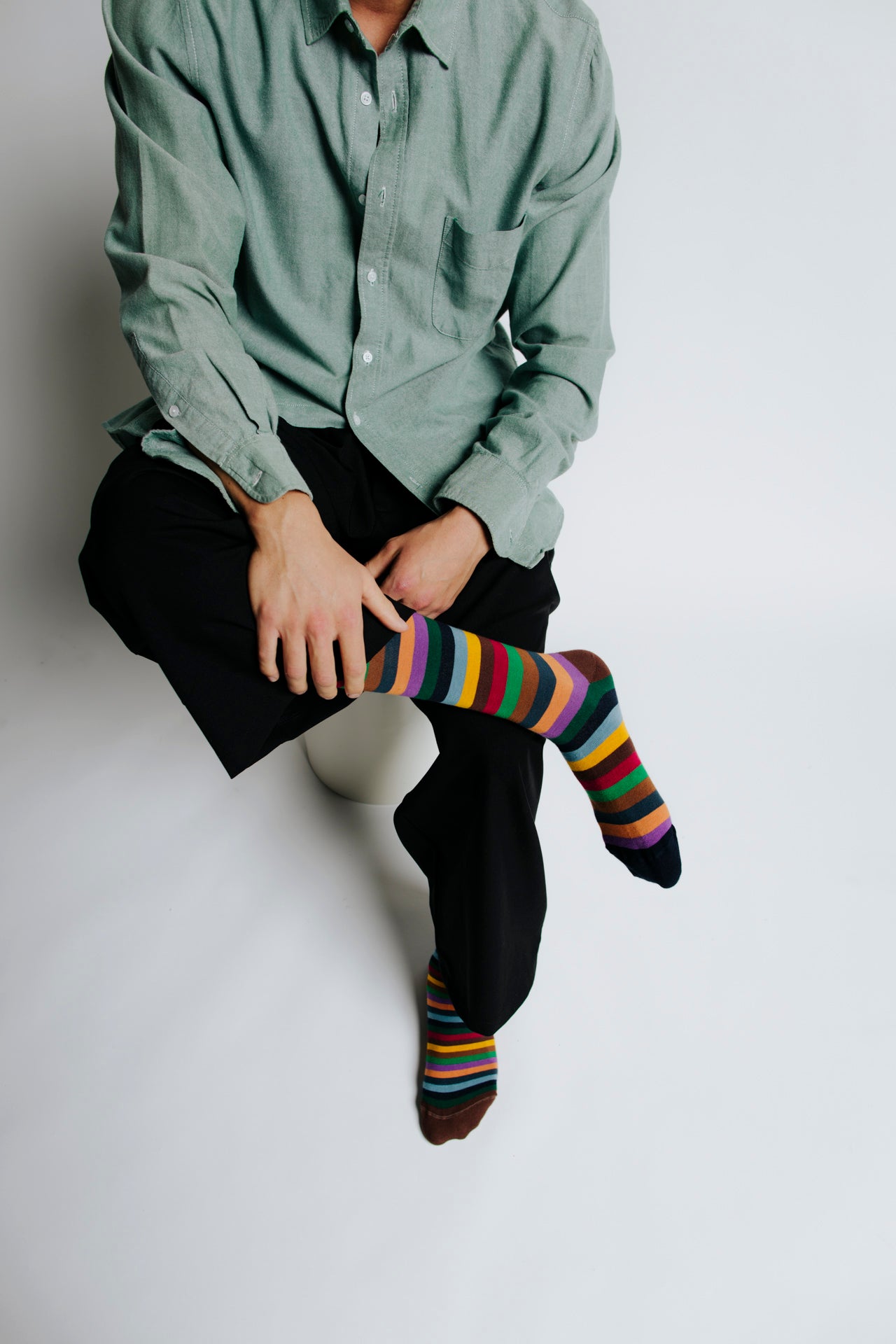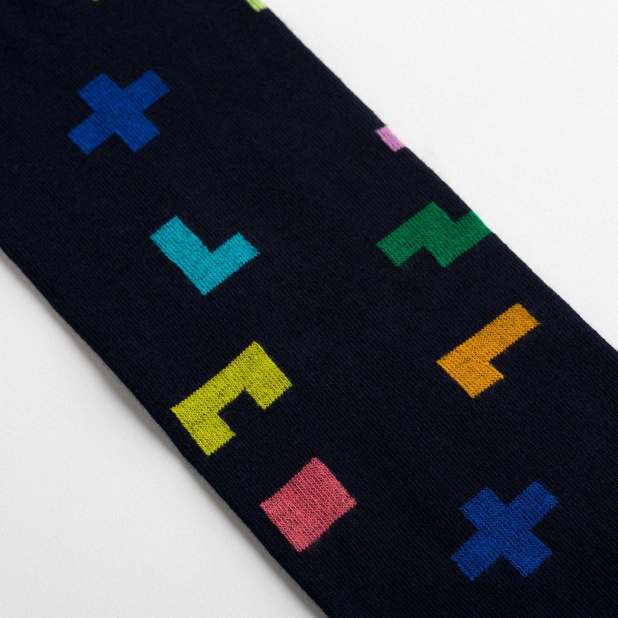 Knee-high socks in midnight blue with a multicolour Tetris-inspired brick pattern. Asymmetrical pattern with differing brick sizes between the two socks. Made from 90% long-fibre cotton. Reinforced toe and heel, flat-knit toe seam and wide toe and heel sections for enhanced comfort.