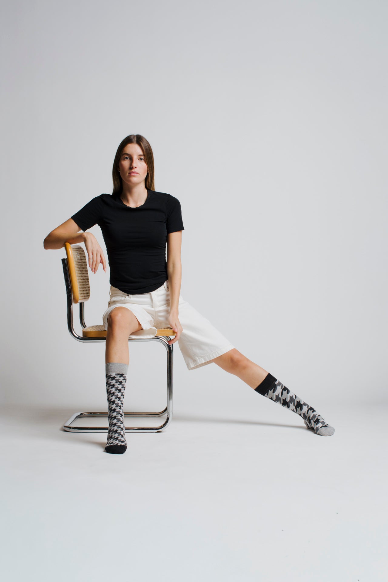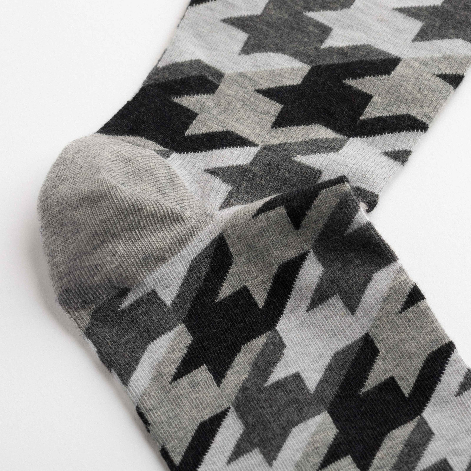 Ankle socks in cotton with pied-de-poule motifs in shades of grey and black. Asymmetrical pattern with variations in motif scale and colour arrangement between the two socks, featuring contrasting toe and cuff colours. Made from 90% long-fibre cotton. Reinforced toe and heel and a flat-knit toe seam for enhanced comfort.