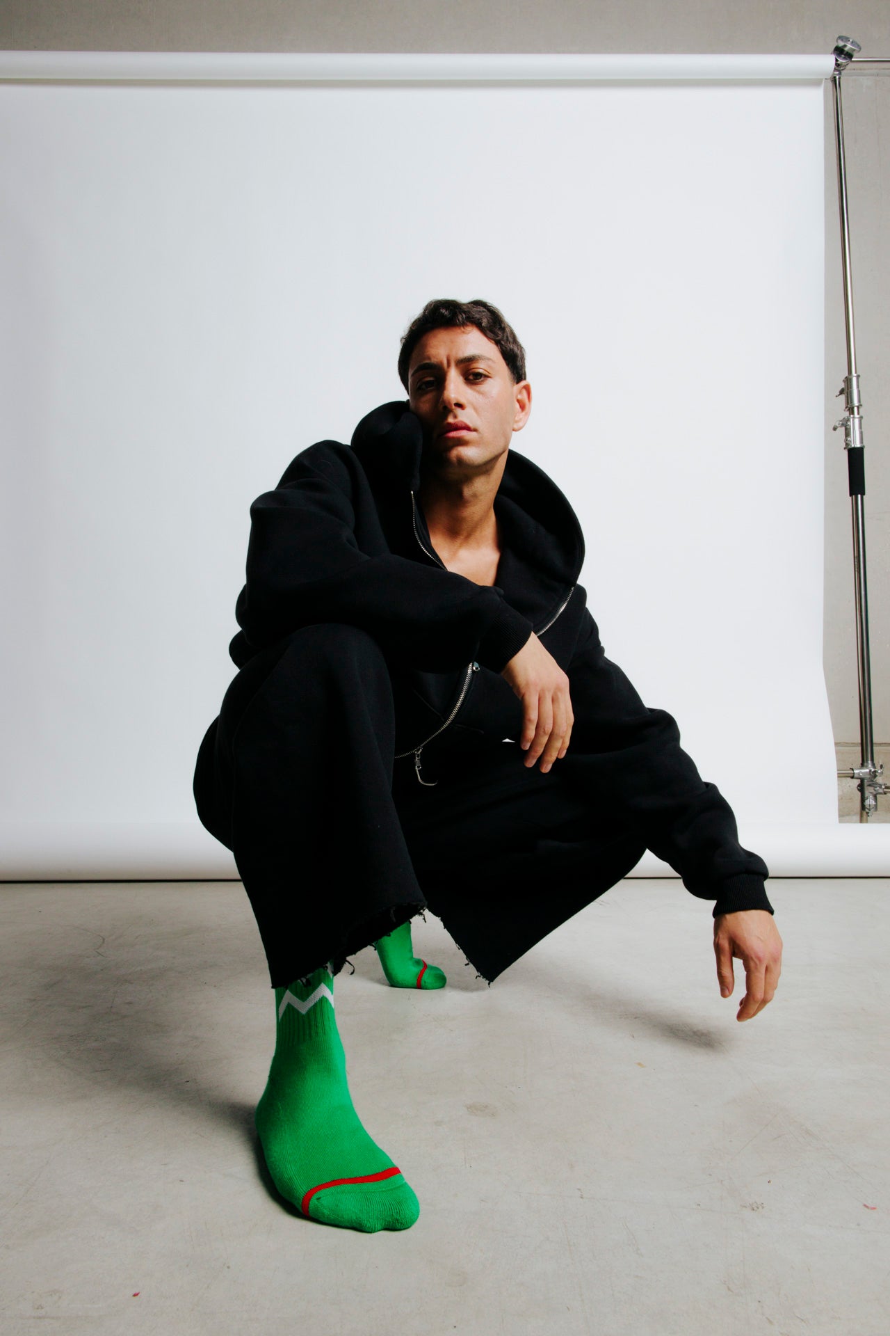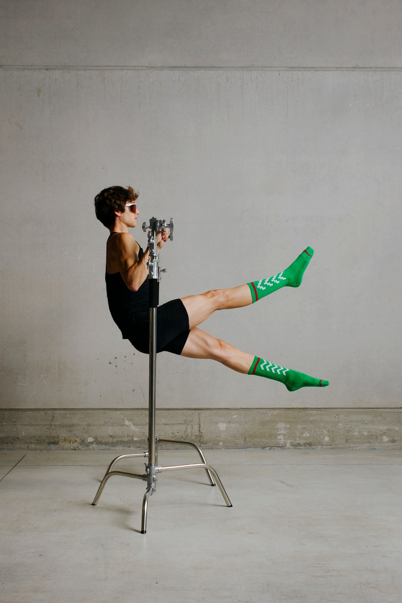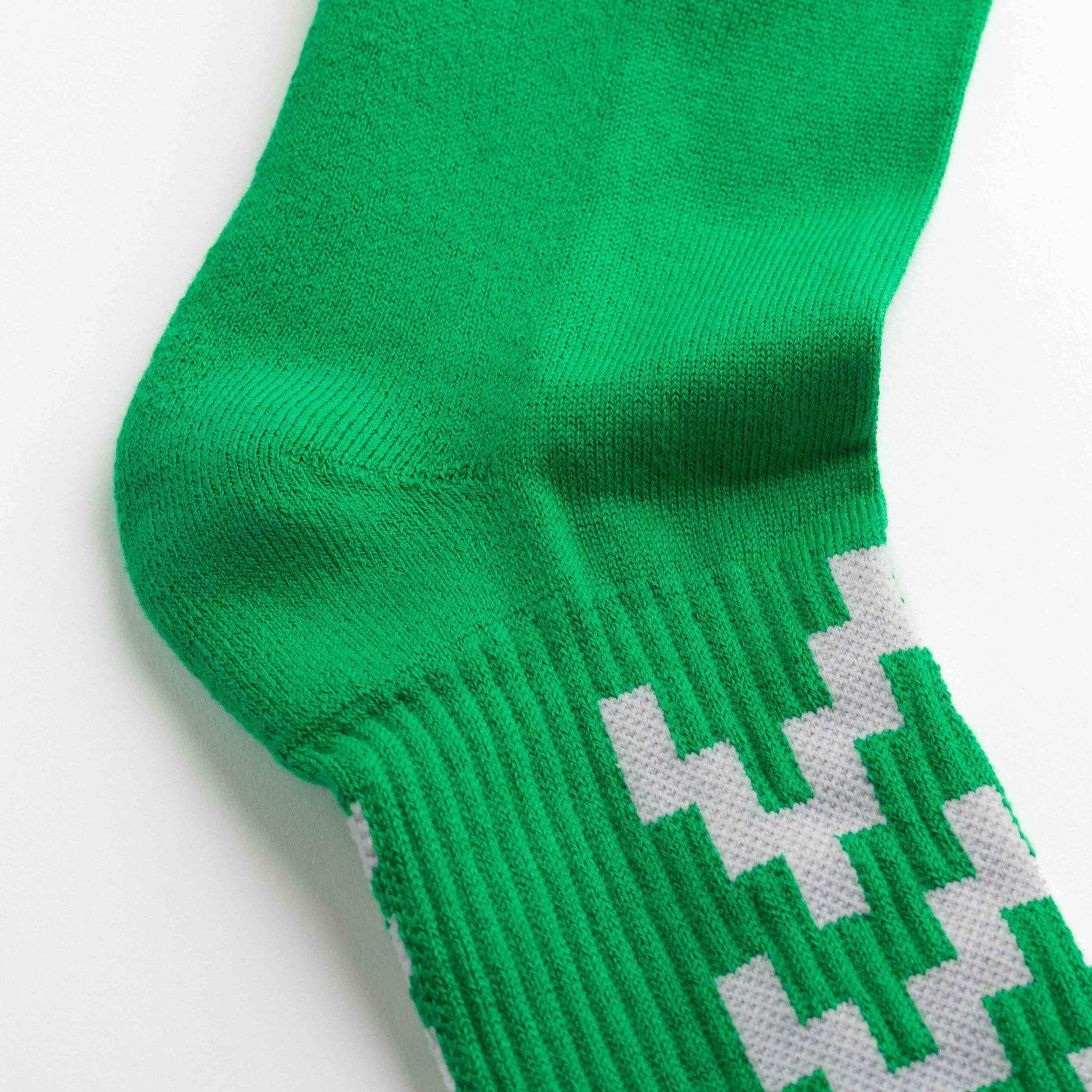 Mid-calf terry socks in cotton with a green base, red stripes and white arrow motifs. Asymmetrical pattern with one sock featuring straight arrows and the other pixelated variants. Made from 90% long-fibre cotton. Reinforced toe and heel, flat-knit toe seam and wide toe and heel sections for enhanced comfort.