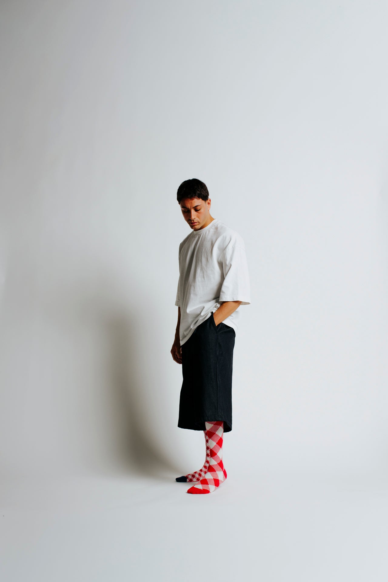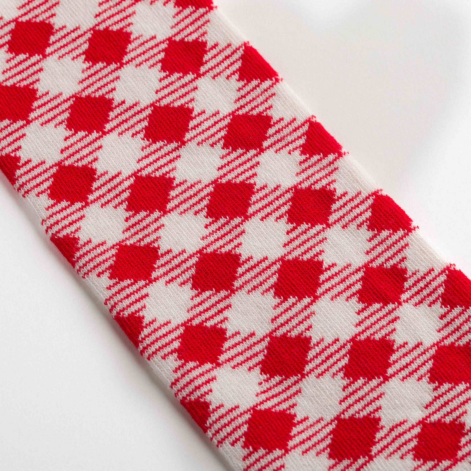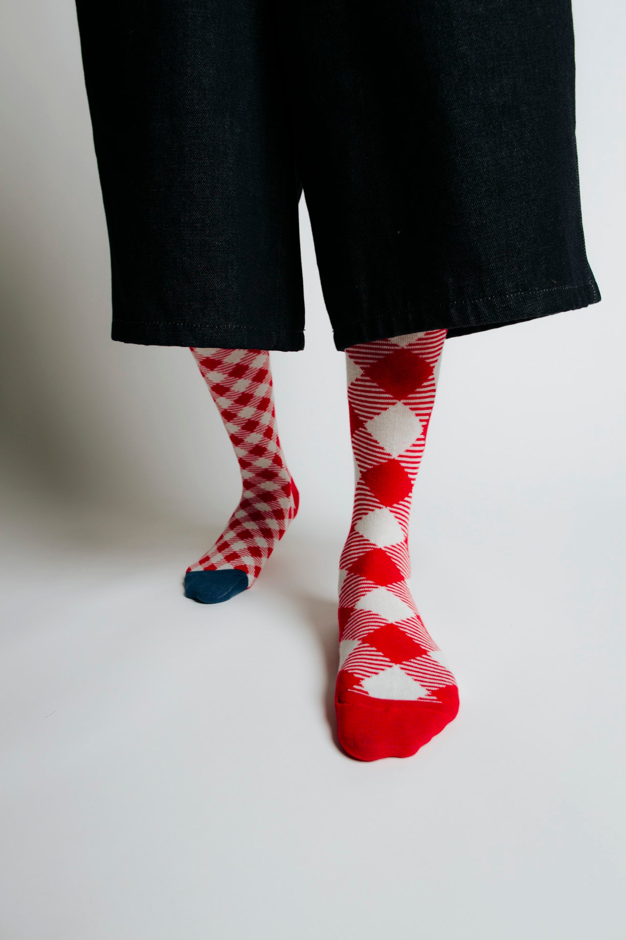 Knee-high socks in cotton with red and white checks and red stripes. Asymmetrical pattern with one sock featuring larger checks and the other smaller. Made from long-fibre cotton. Reinforced toe and heel, flat-knit toe seam and wide toe and heel sections for enhanced comfort.