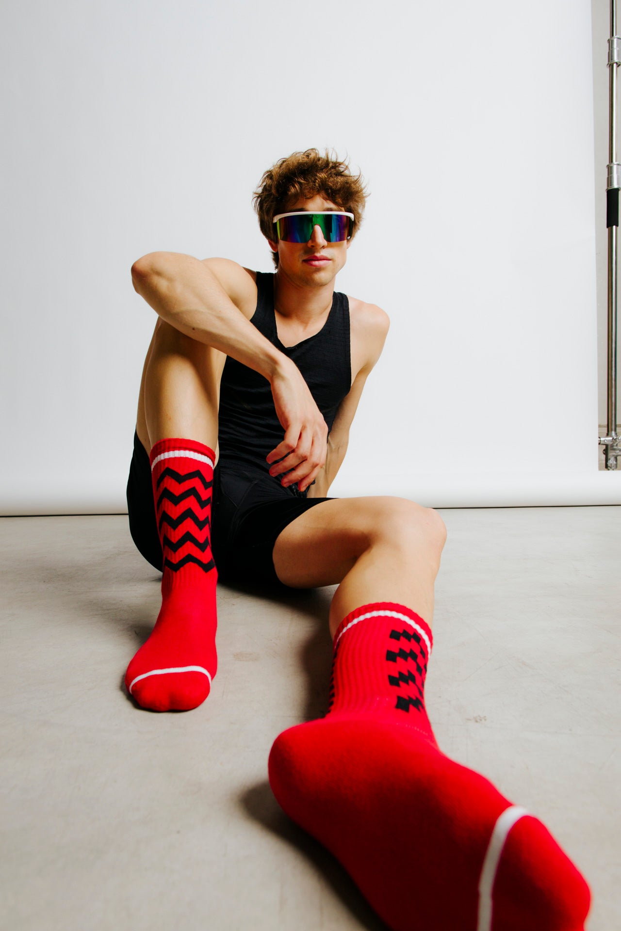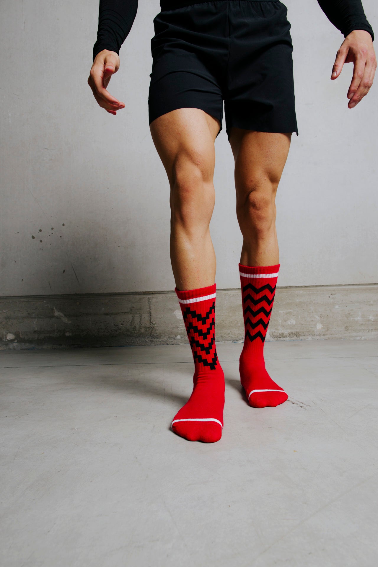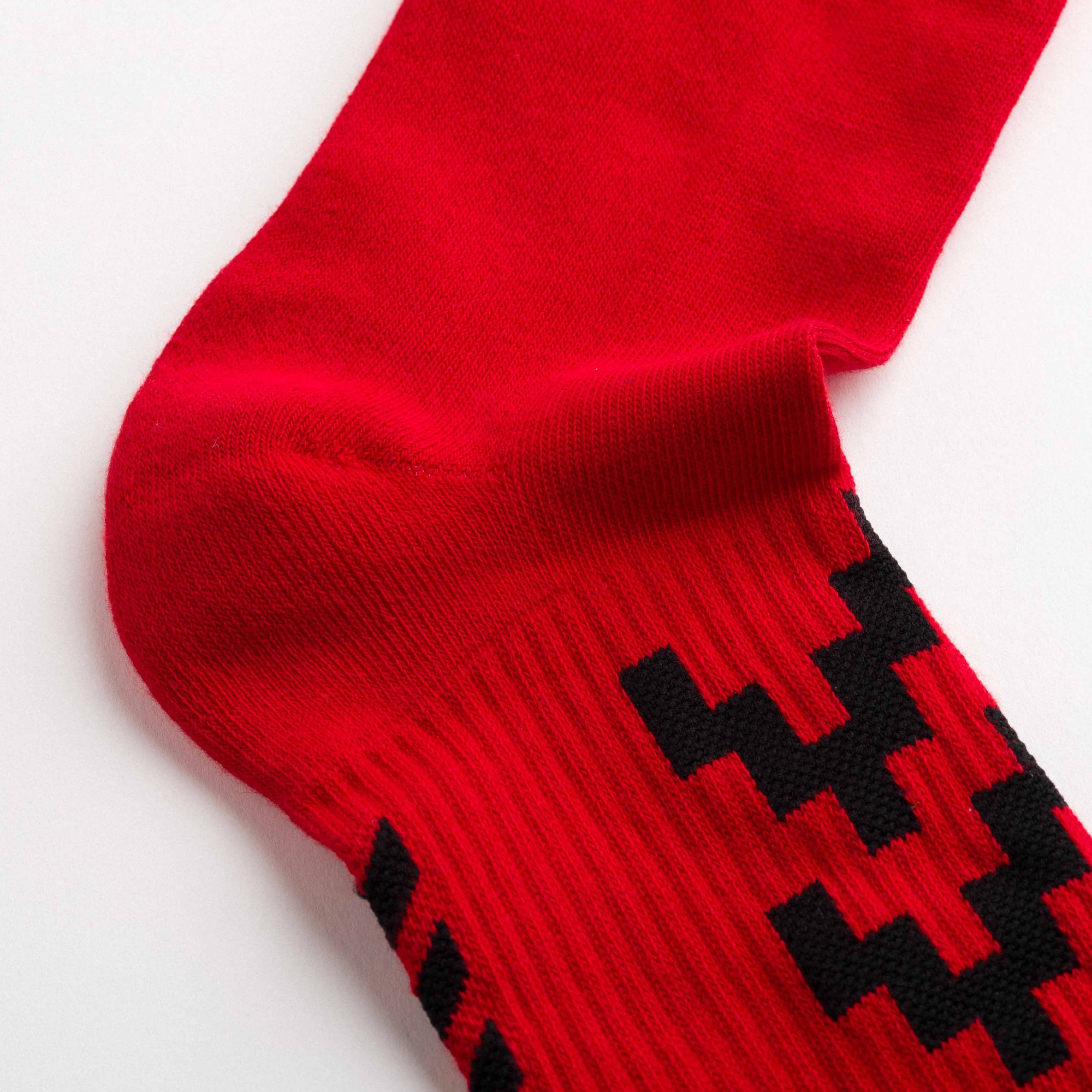 Mid-calf terry socks in cotton with a red base, white stripes and black arrow motifs. Asymmetrical pattern with one sock featuring straight arrows and the other pixelated variants. Made from 90% long-fibre cotton. Reinforced toe and heel, flat-knit toe seam and wide toe and heel sections for enhanced comfort.
