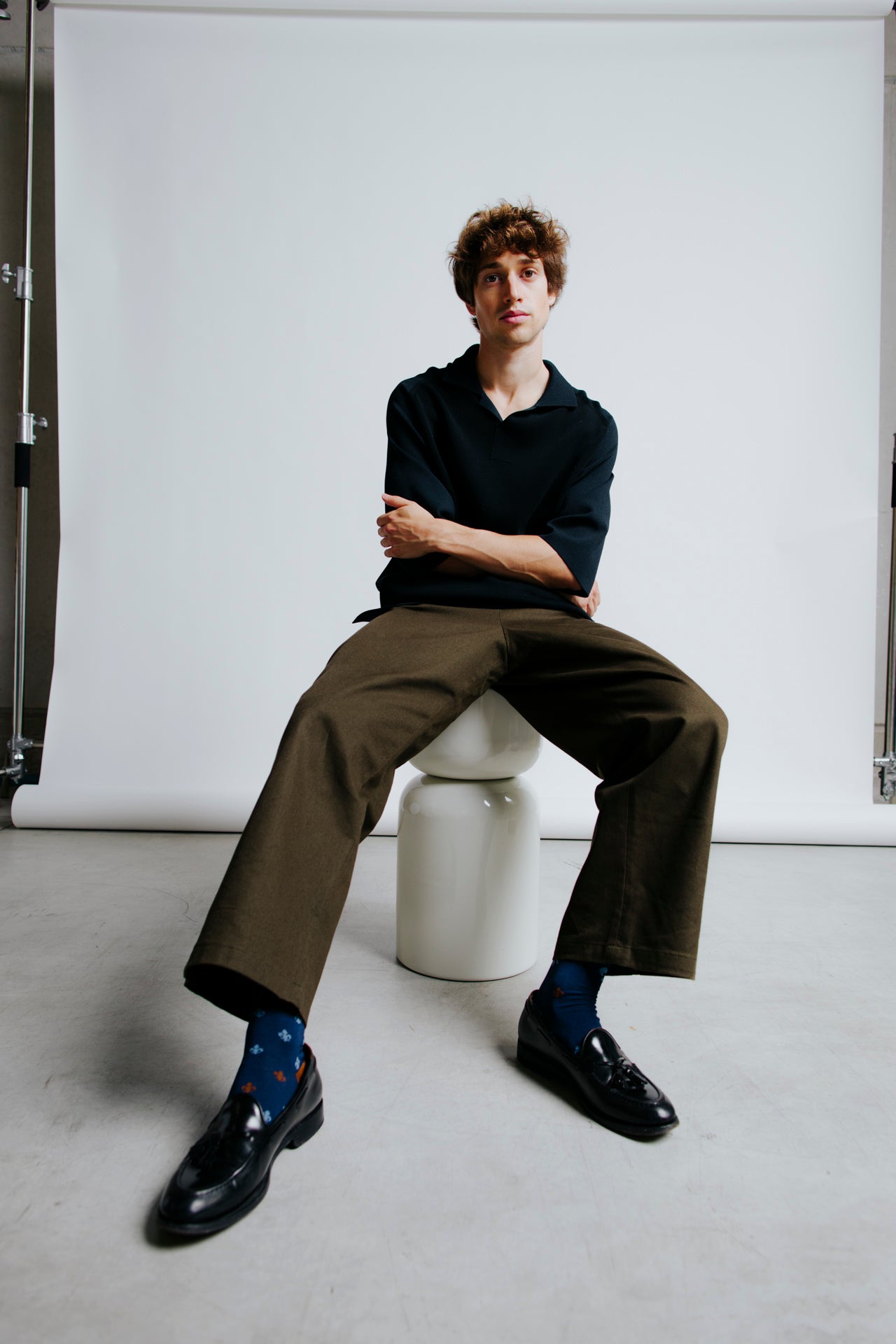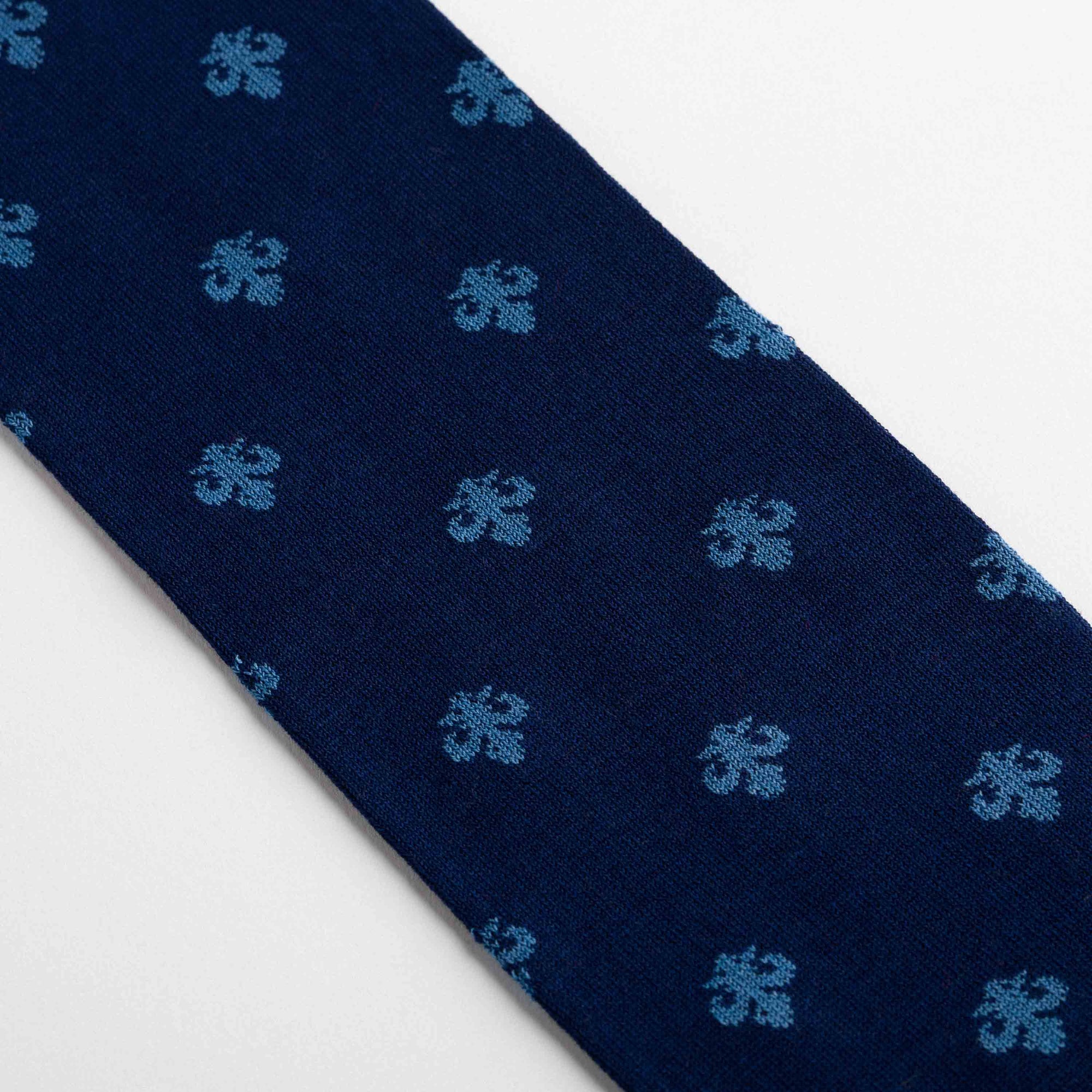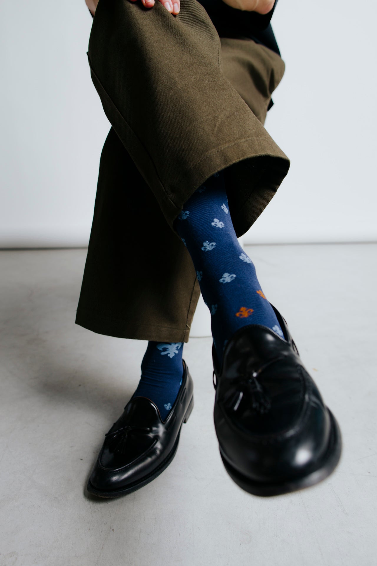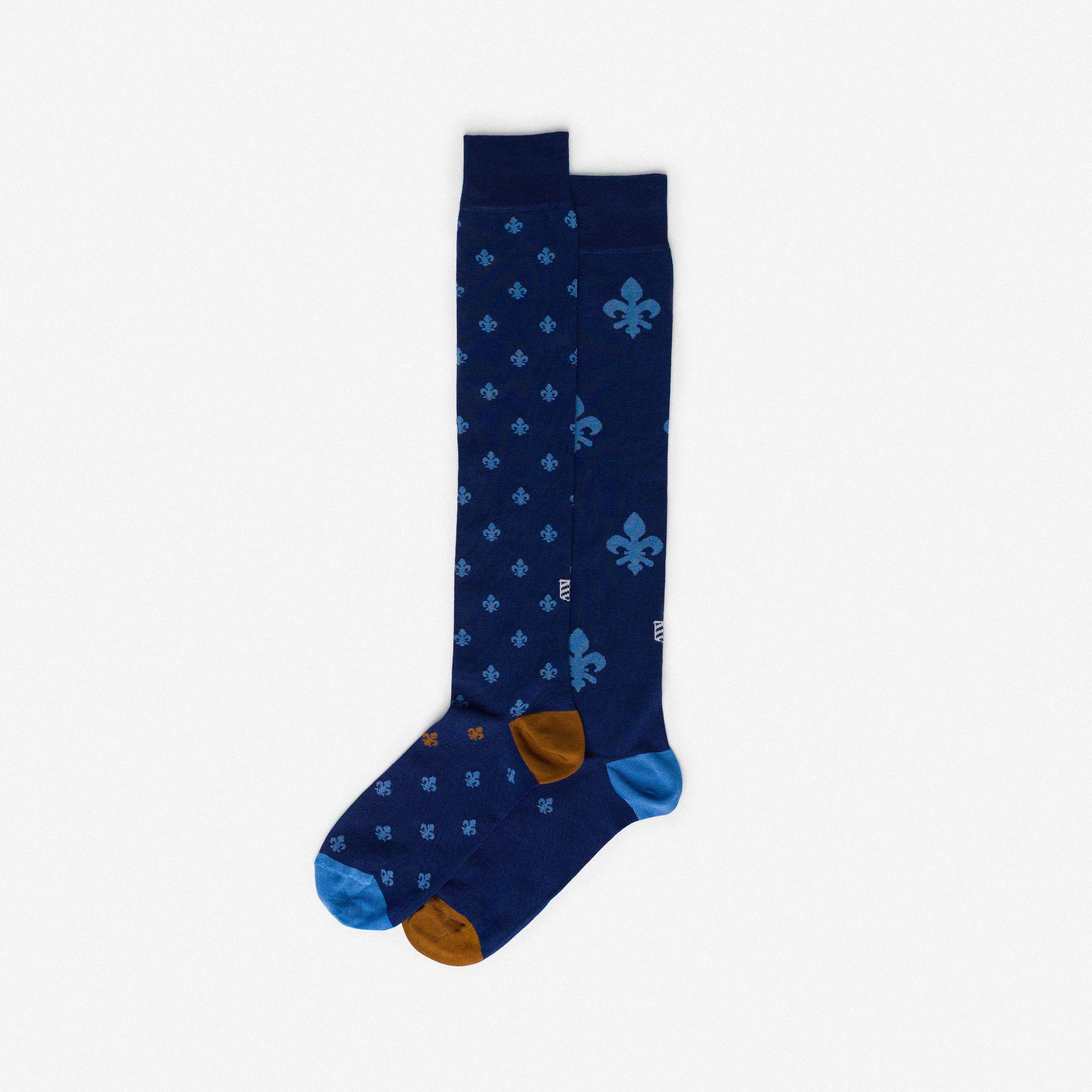 Knee-high socks in cotton with a stylised fleur-de-lis jacquard in light blue and brown. Asymmetrical pattern with one sock featuring a fine-scale motif and the other a magnified version. Made from 90% long-fibre cotton. Reinforced toe and heel, flat-knit toe seam and wide toe and heel sections for enhanced comfort.
