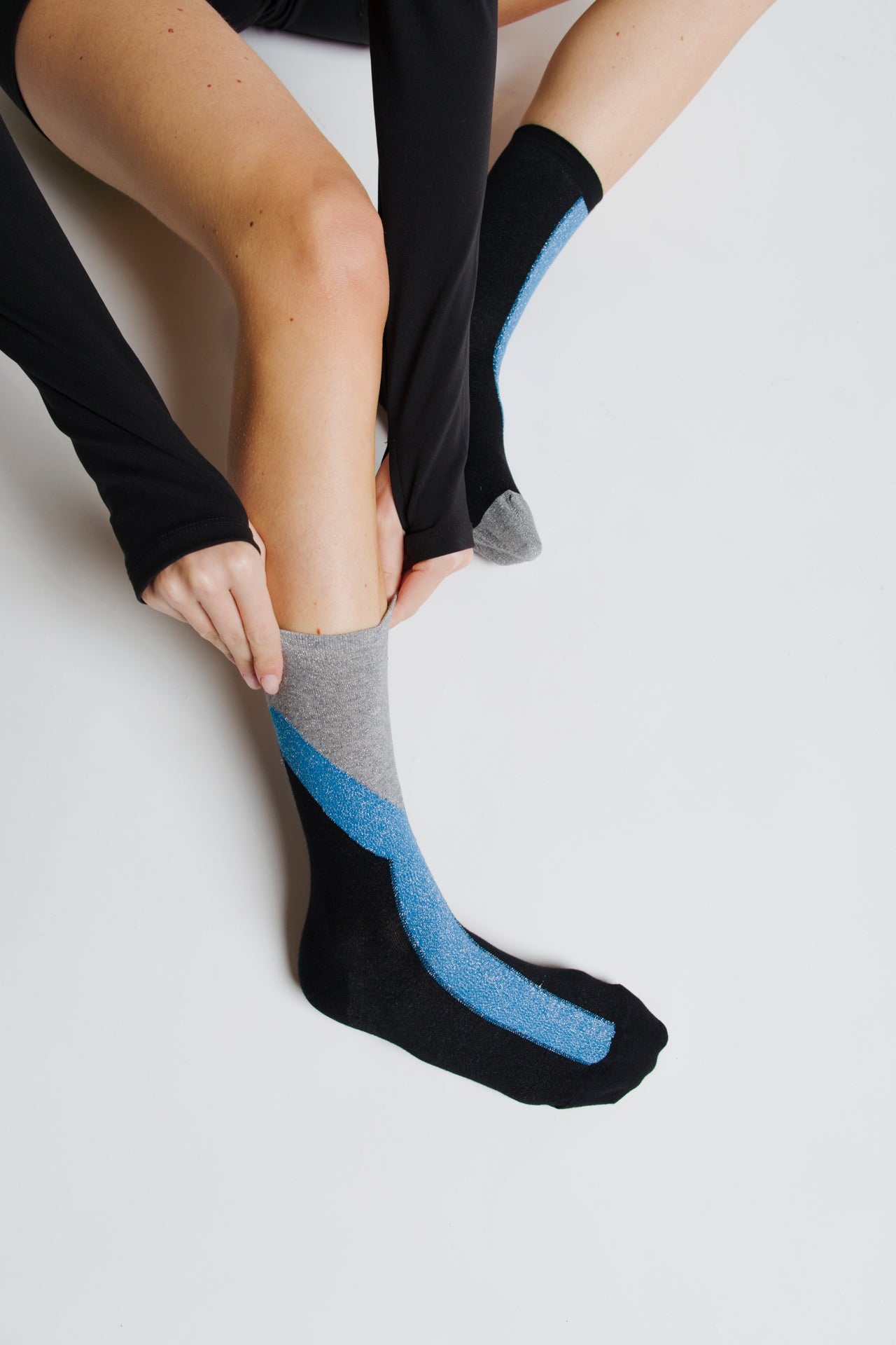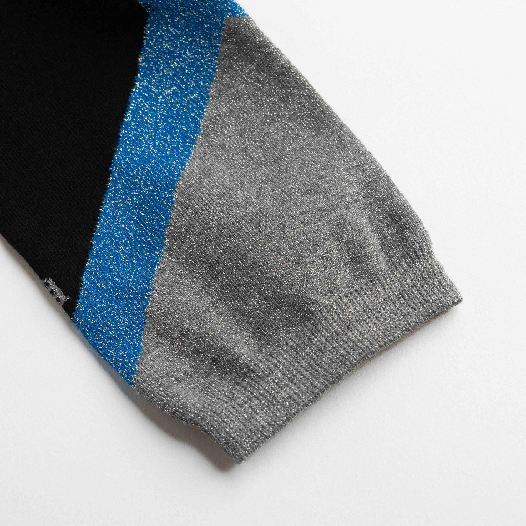 Ankle socks in cotton and Lurex with a black base and metallic blue and silver sections. Asymmetrical pattern with differing placement and width of the Lurex details between the two socks. Made from long-fibre cotton blended with lurex. Reinforced toe and heel and a flat-knit toe seam for enhanced comfort.