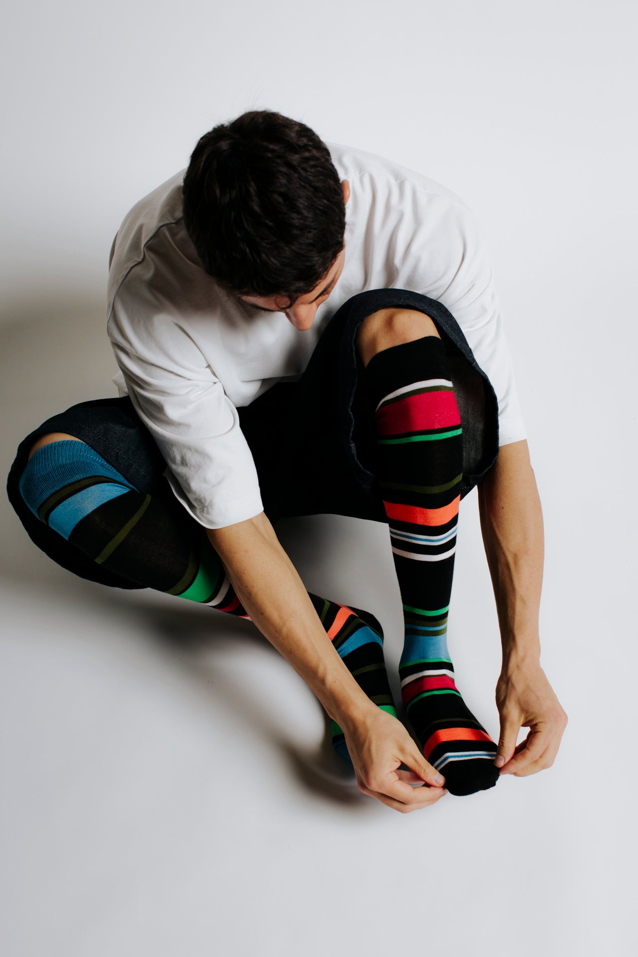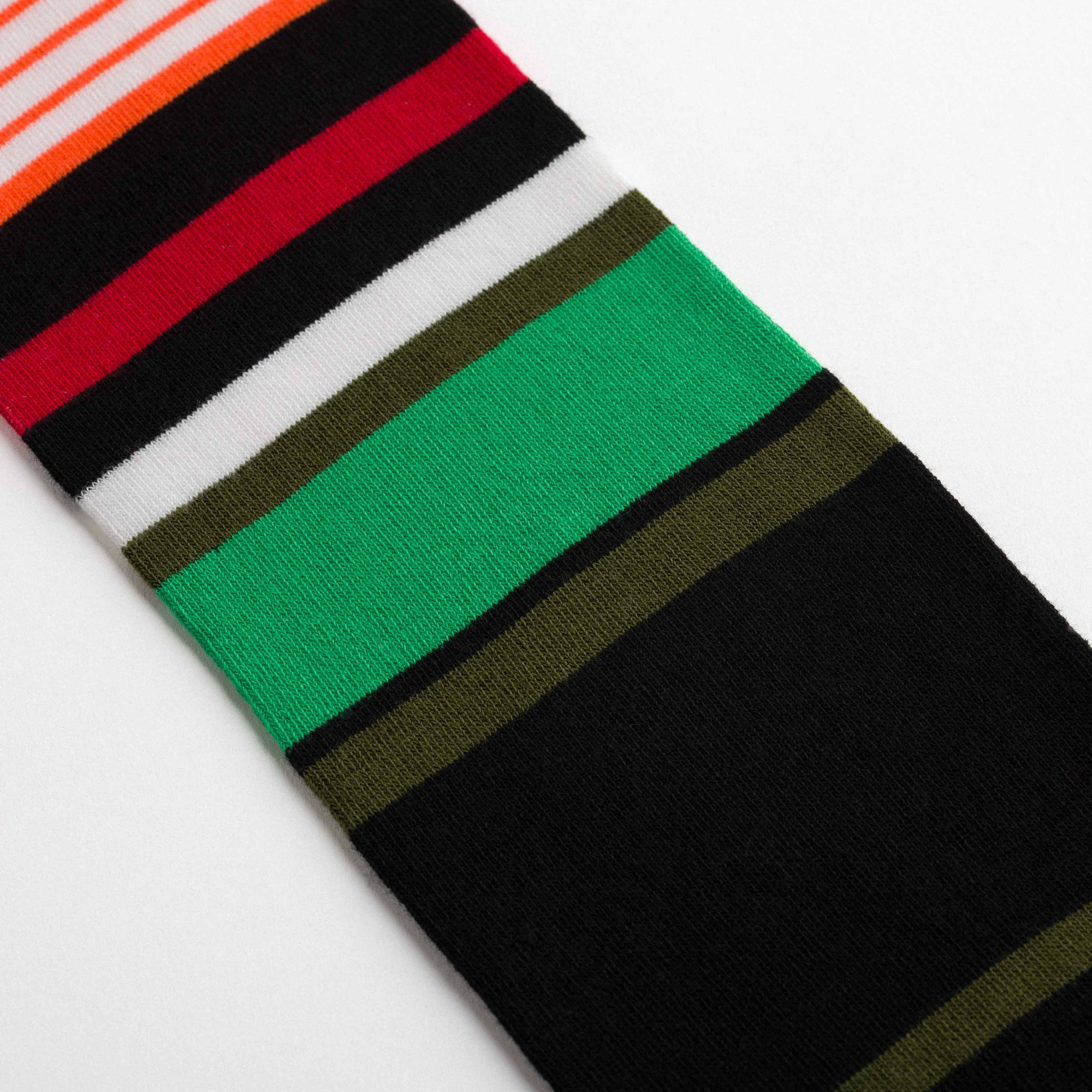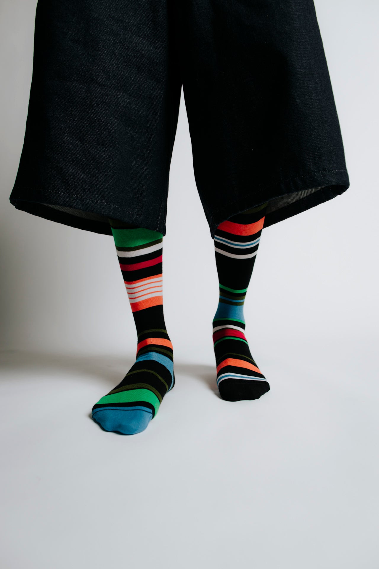 Knee-high socks in cotton with multicolour stripes on a black base. Asymmetrical pattern with varying stripe widths between the two socks. Made from 90% long-fibre cotton. Reinforced toe and heel, flat-knit toe seam and wide toe and heel sections for enhanced comfort.